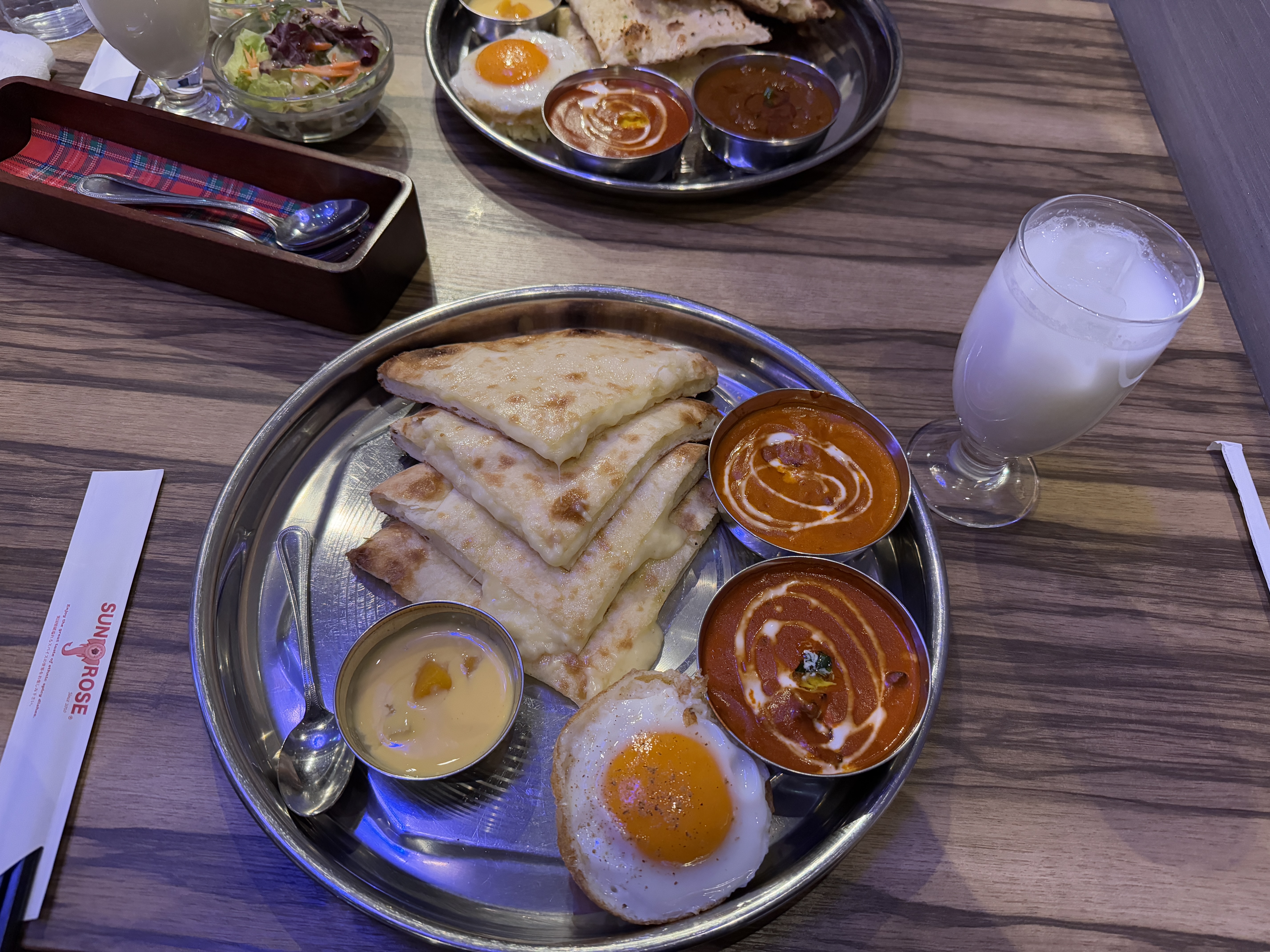 치즈 난 세트에 머튼 카레와 버터 치킨 카레, 라씨를 선택했는데