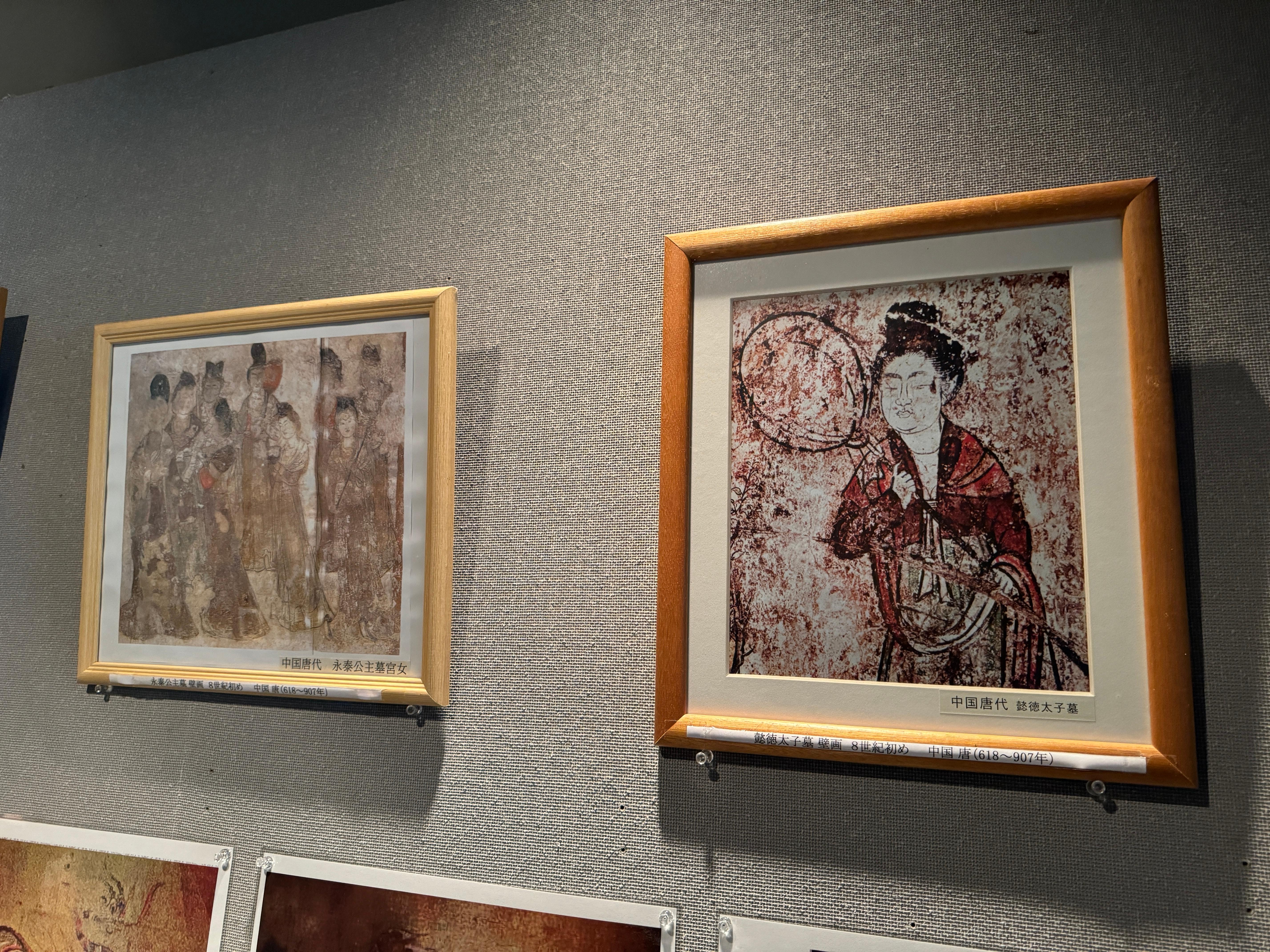 고분 안에 있던 벽화 복제품이 여럿 있습니다.