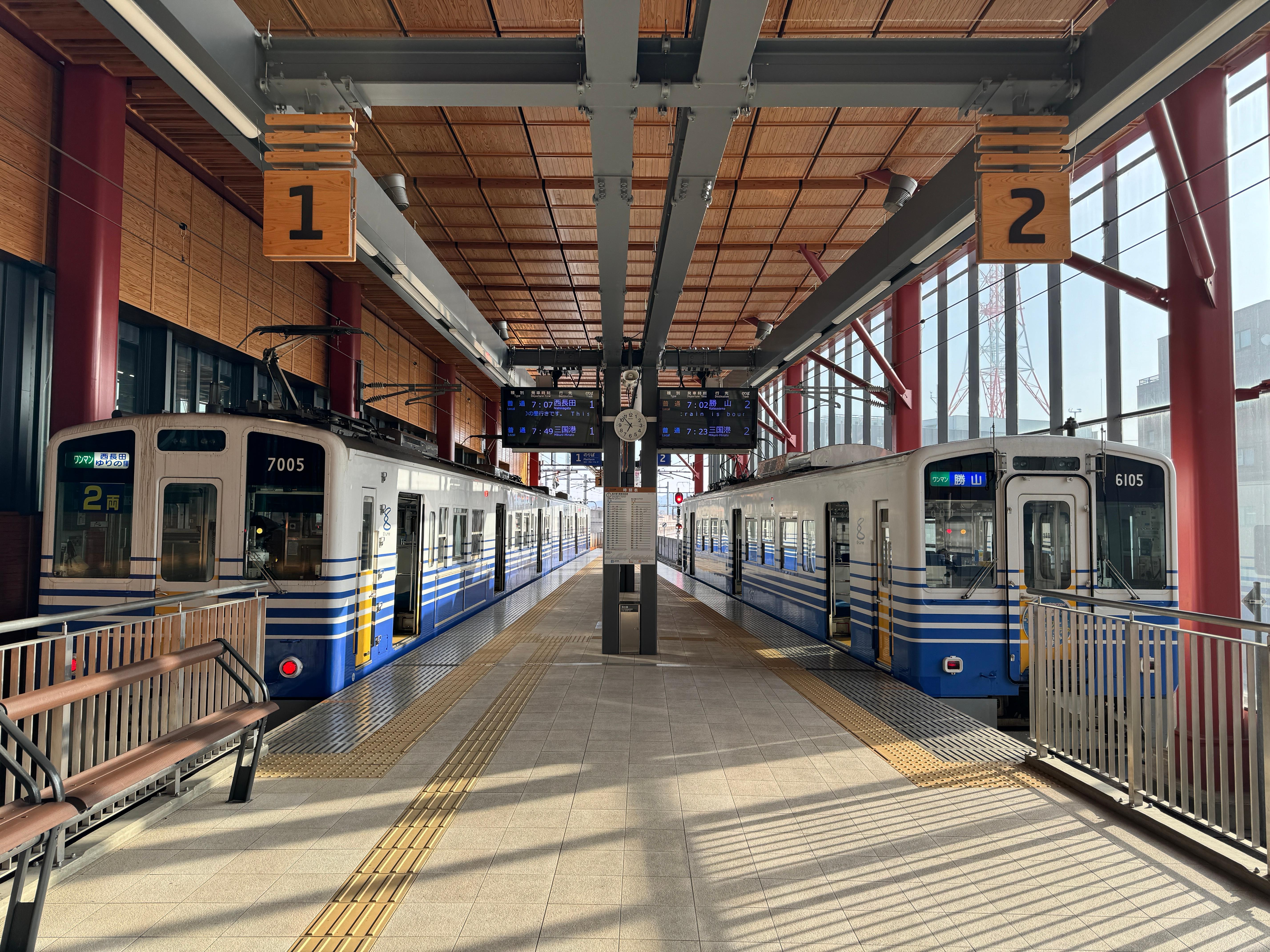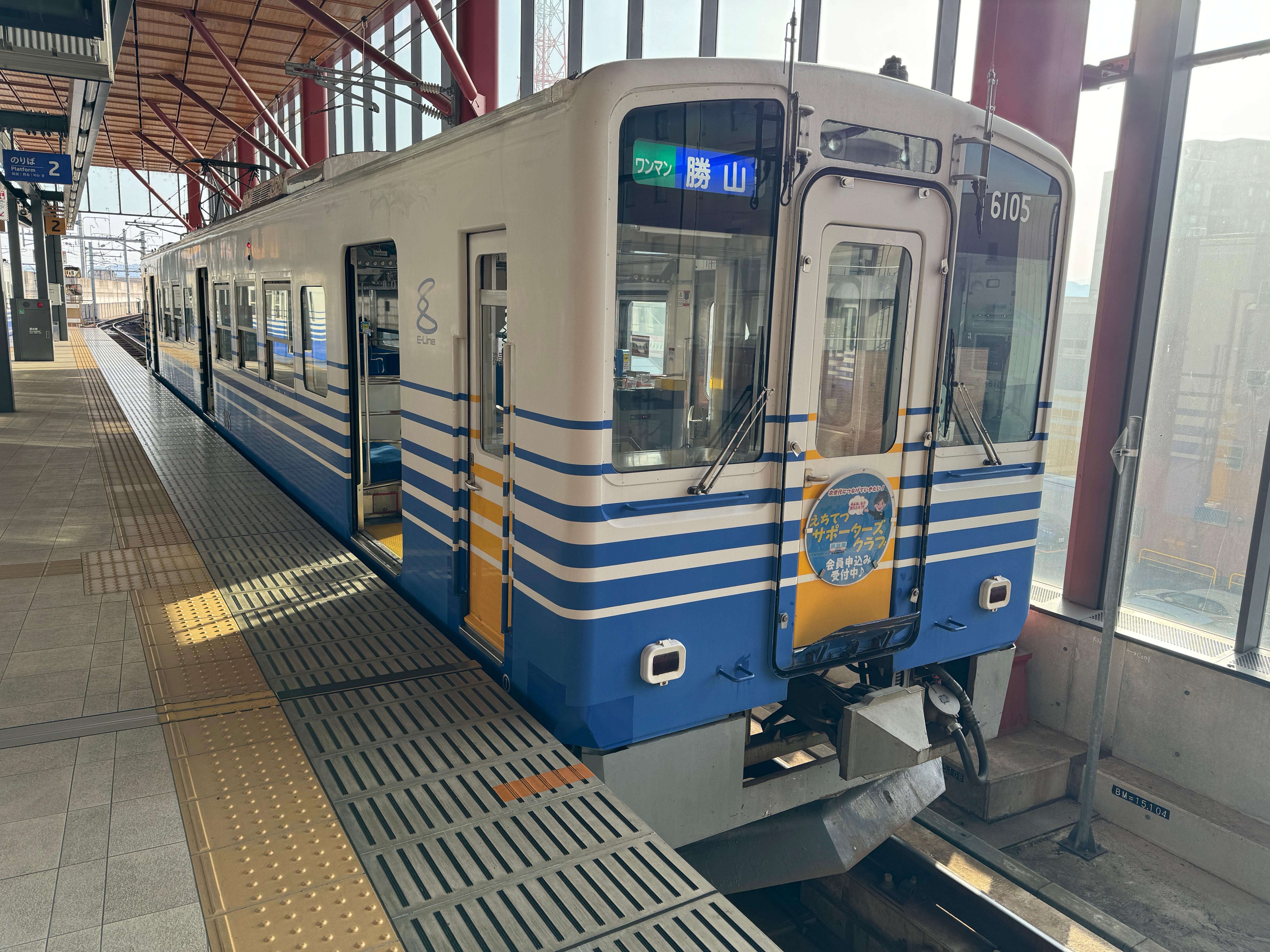 이중 2번 선에 정차한 카츠야마행 카츠야마에이헤이지선 전동차에 승차.