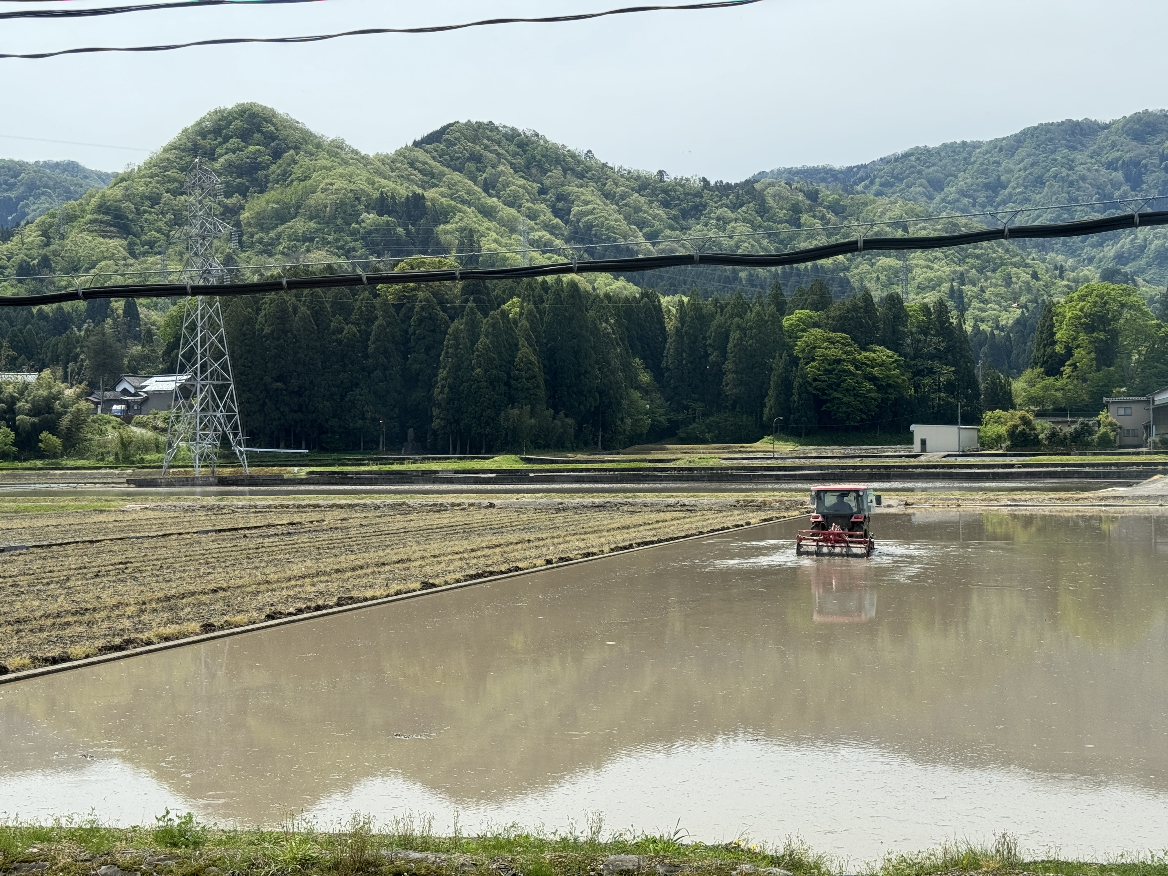 모내기가 한창인 논을 보면서