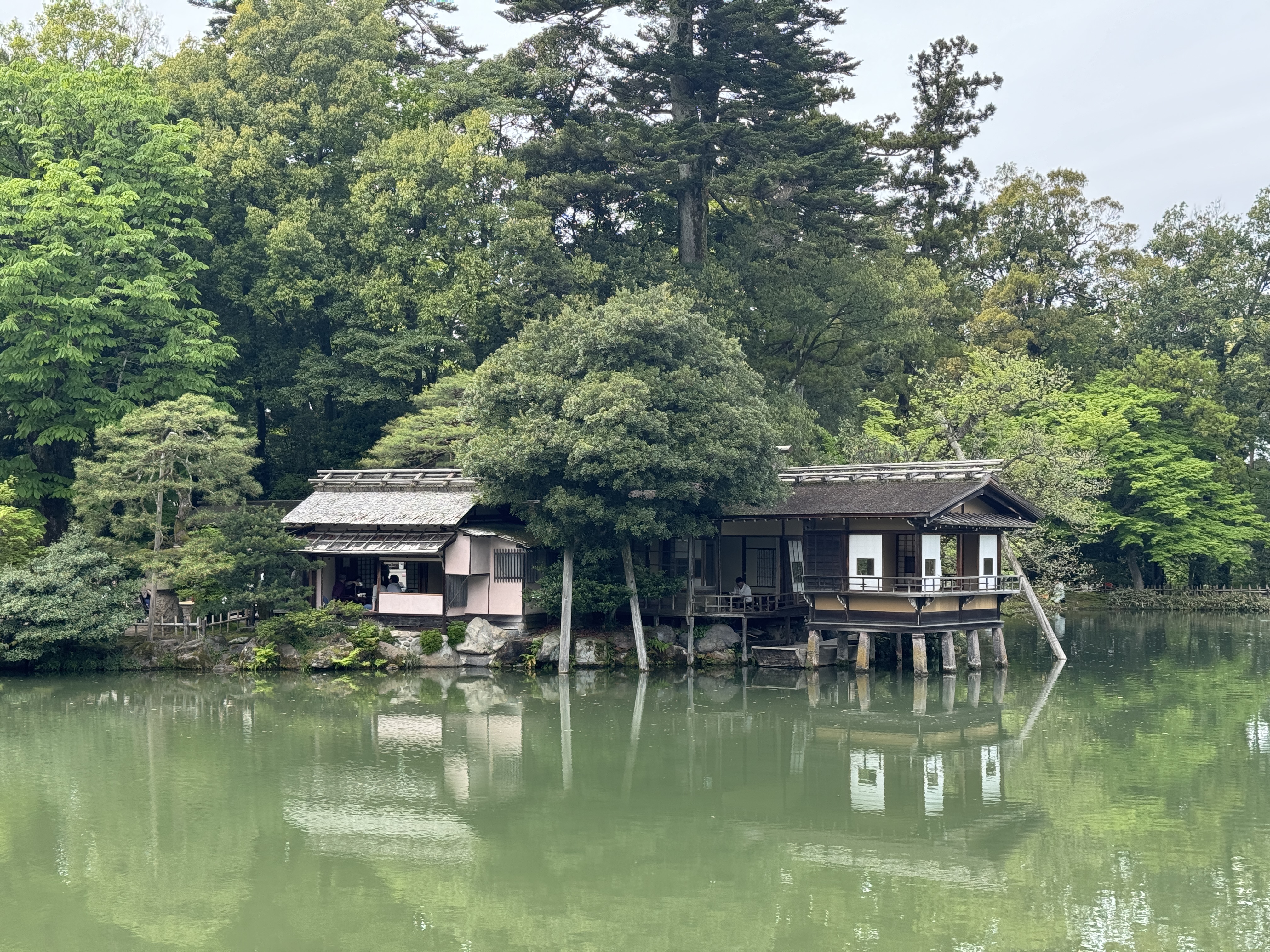 카스미가이케(霞ヶ池)라는 연못 너머 다실을 보니 사람들이 보이네요.