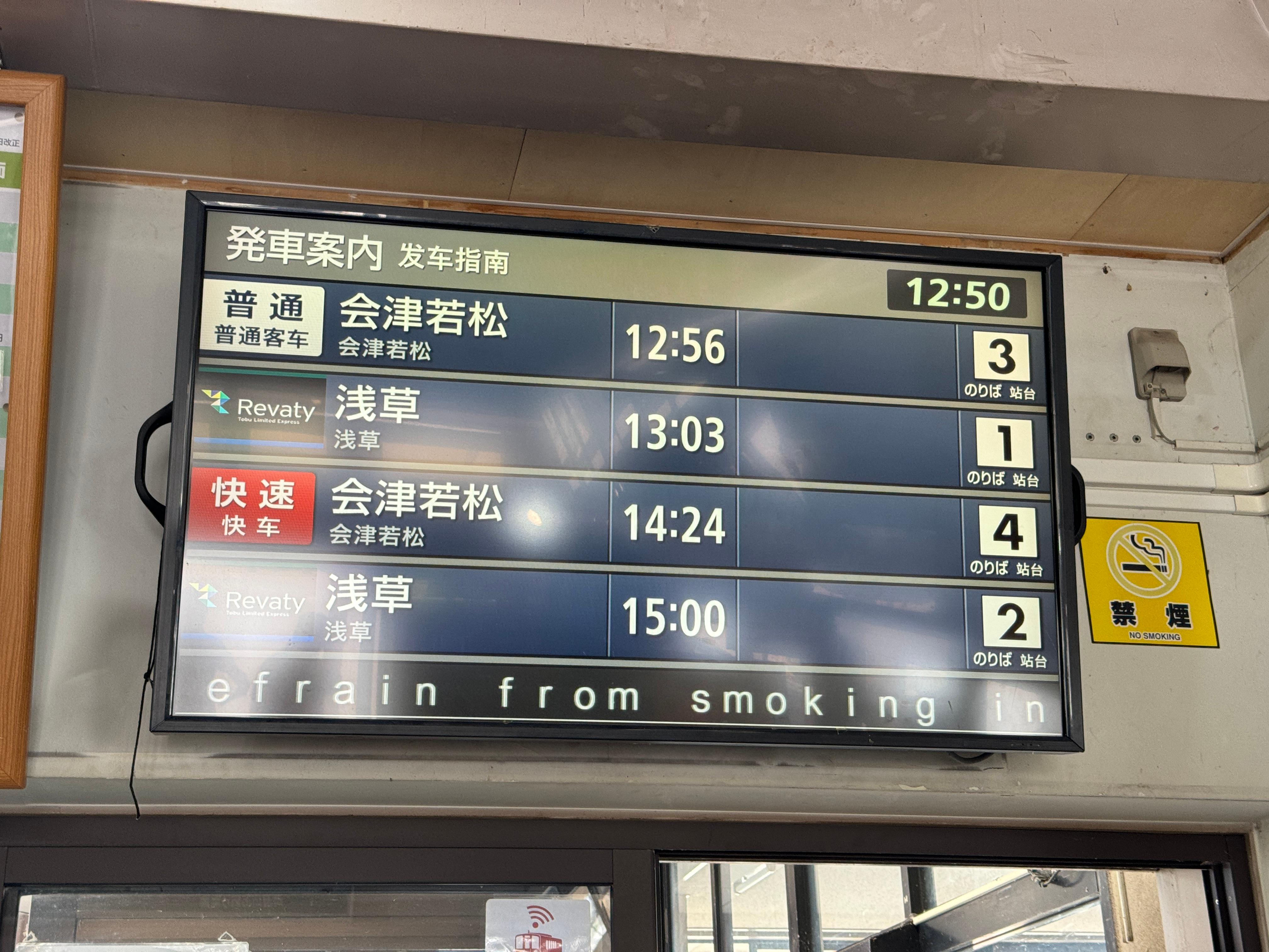 12시 56분에 출발하는 아이즈와카마츠행 보통열차를 타러 승강장으로 들어갑니다.