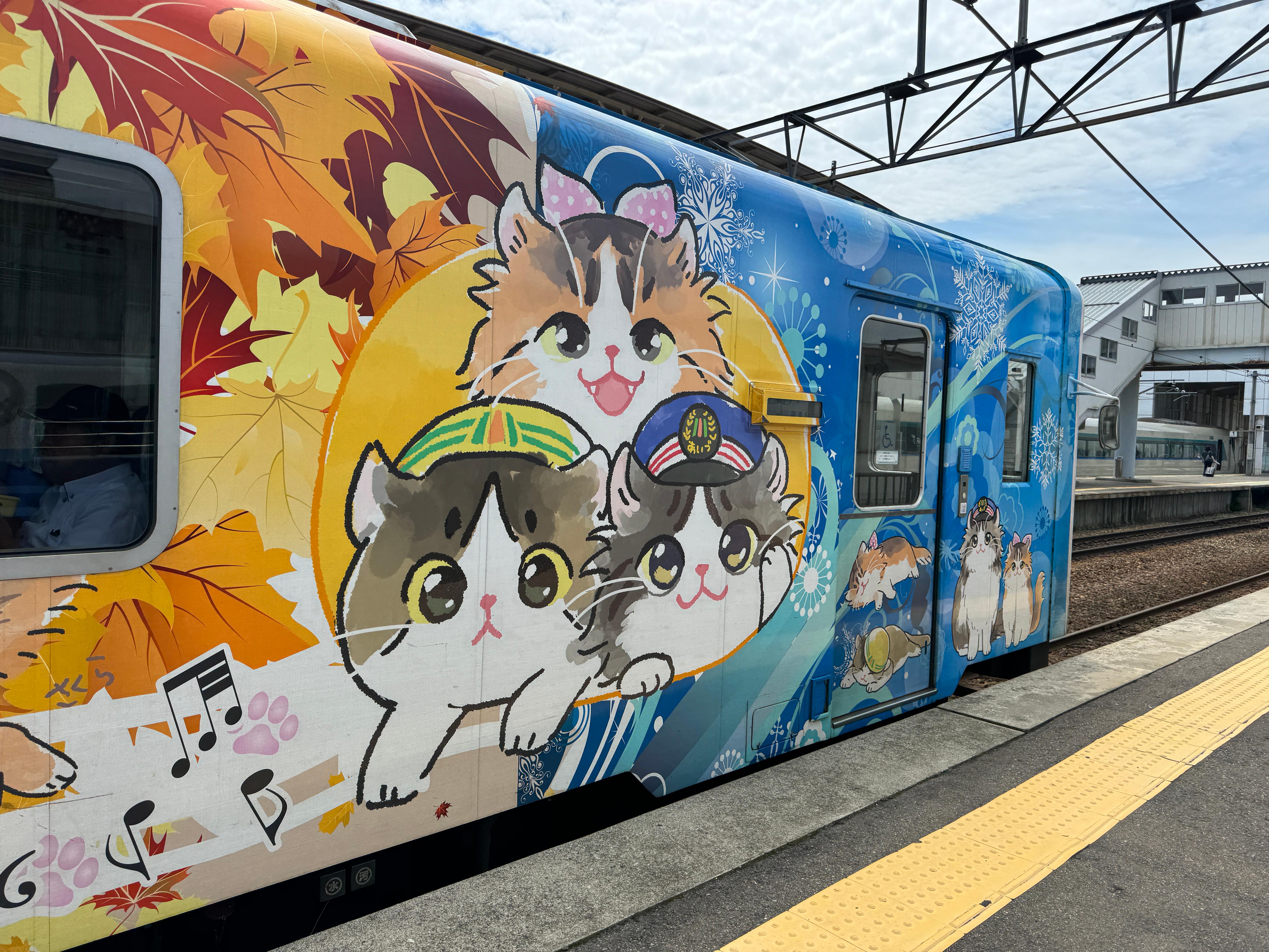 고양이 그림으로 도배를 한 기차가 승강장에 있는데