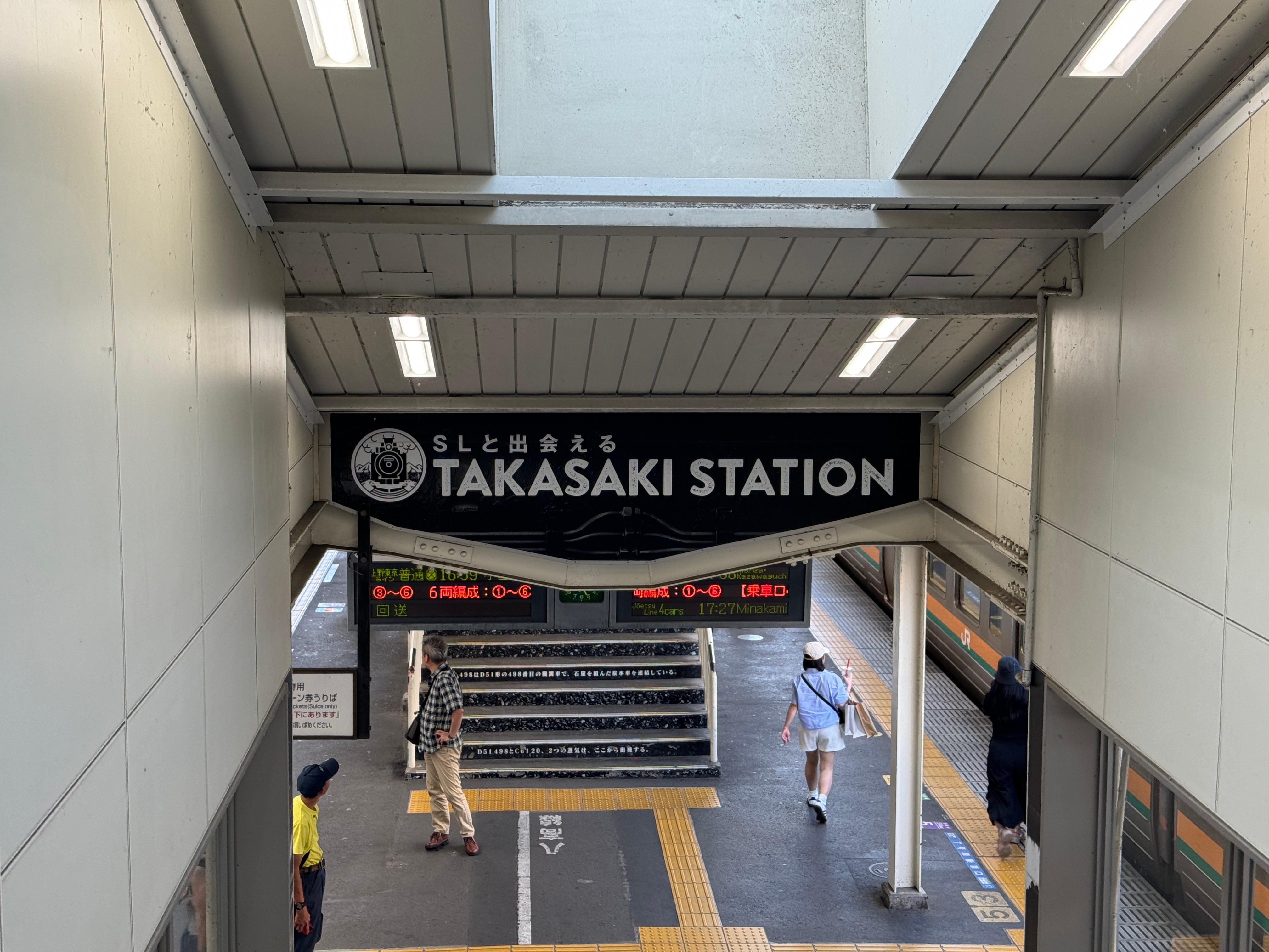 승강장으로 내려가는 계단에 증기기관차를 탈 수 있는 역이라고 자랑스럽게 붙여놓은 타카사키역.