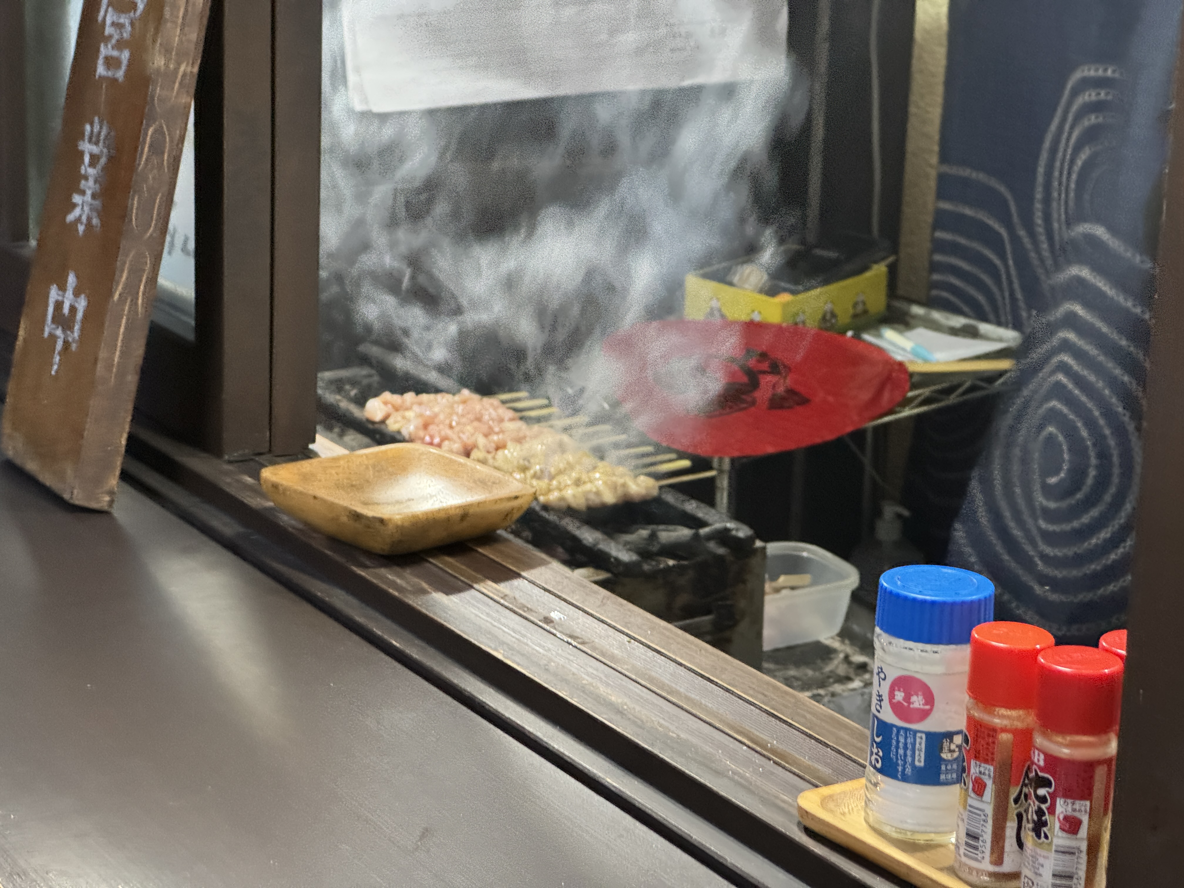 닭꼬치 굽는 냄새가 코를 자극합니다.