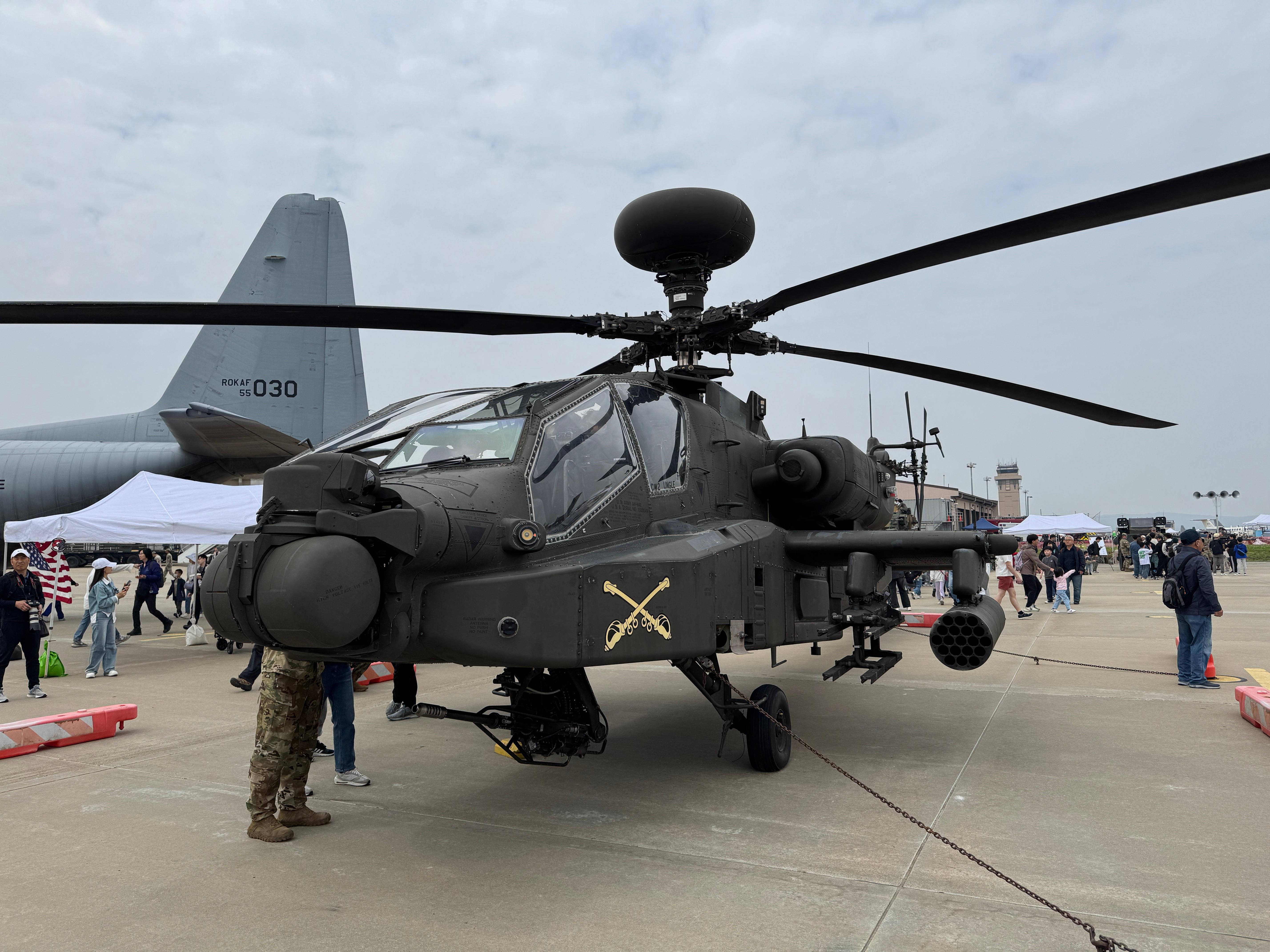 AH-64 아파치는 기념사진을 찍으려는 사람들로 줄이 가득한 반면