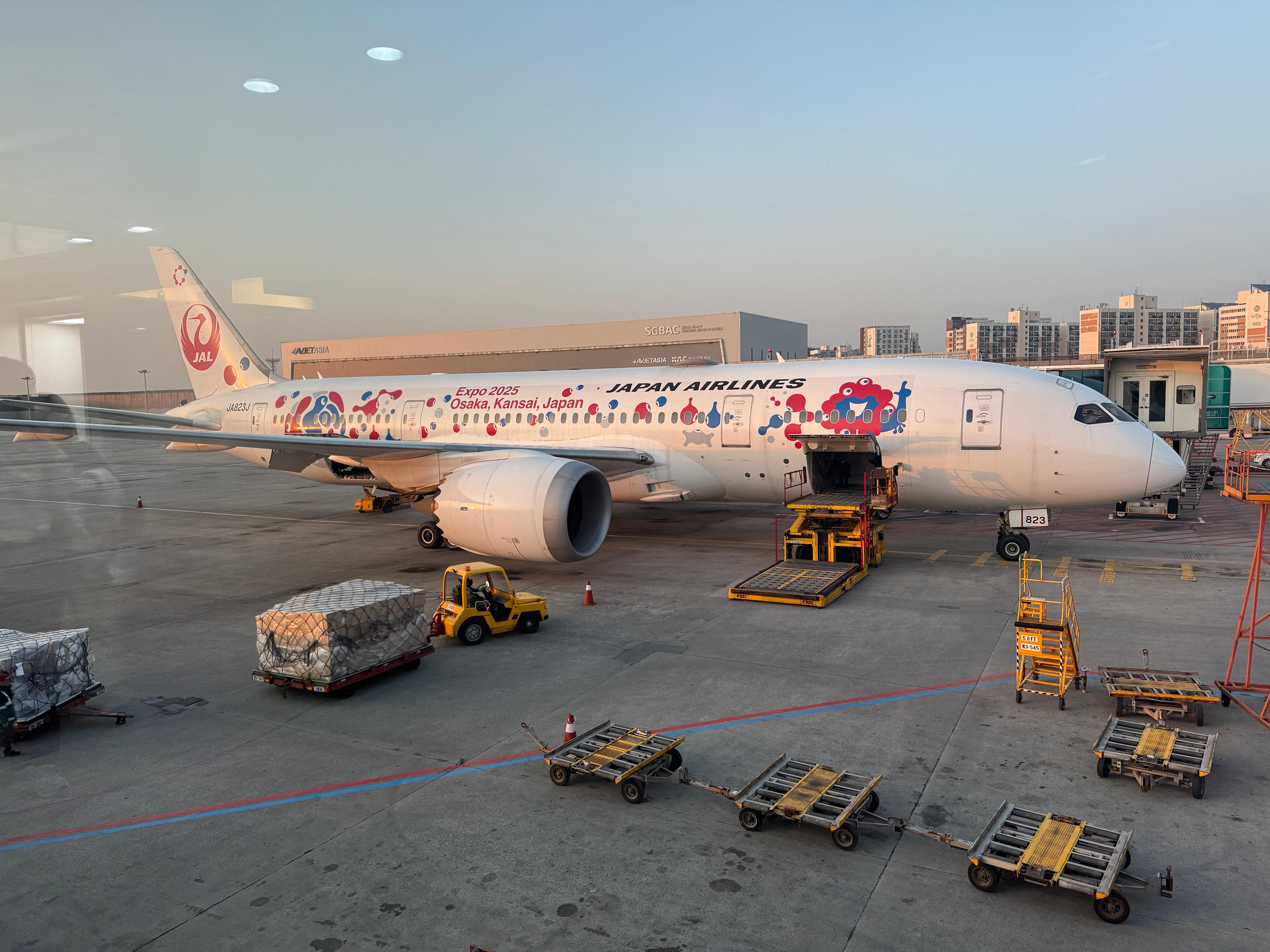 바로 옆에 오사카 엑스포 특별 도장 일본항공 비행기가 주기 중이네요.