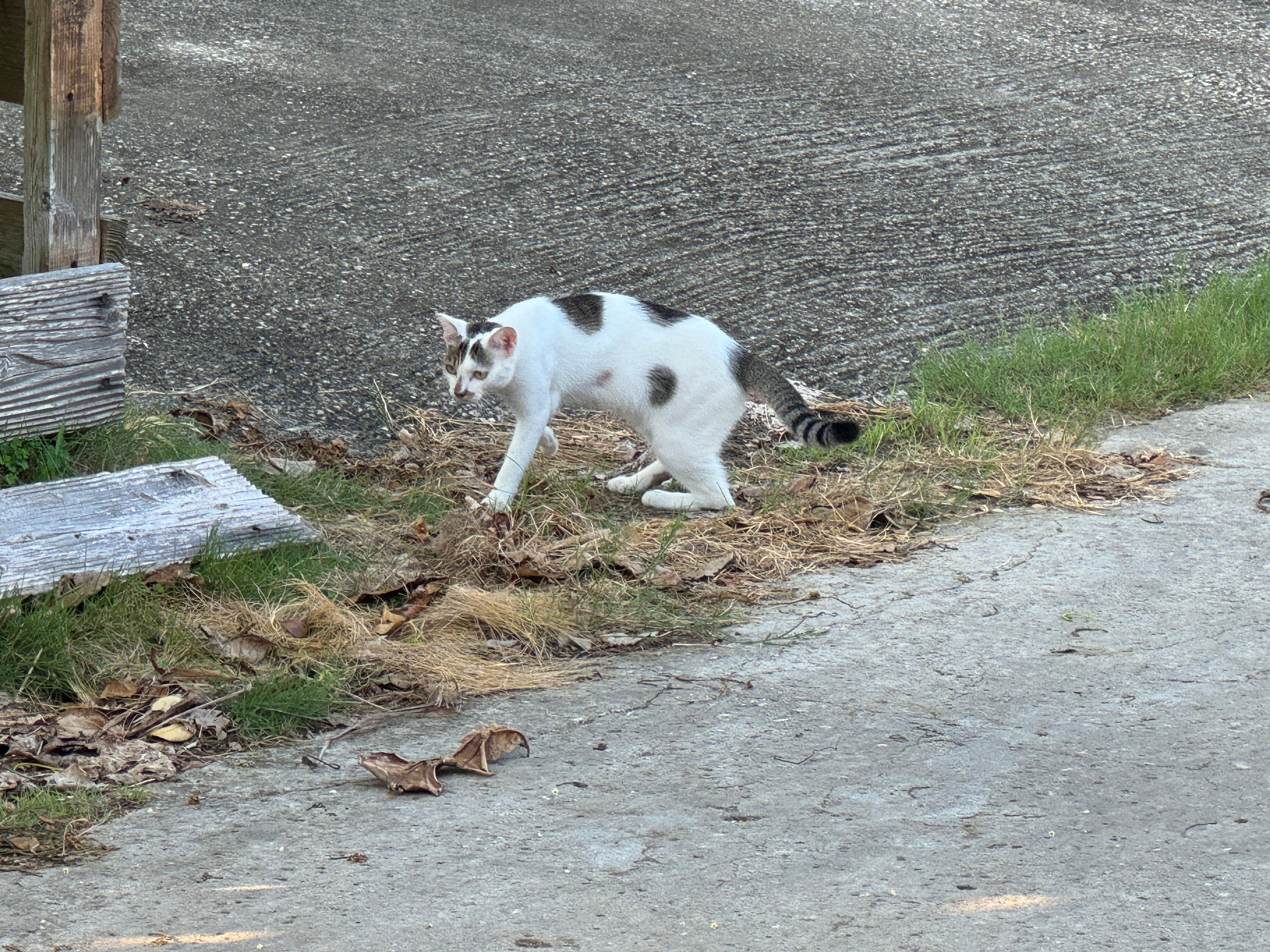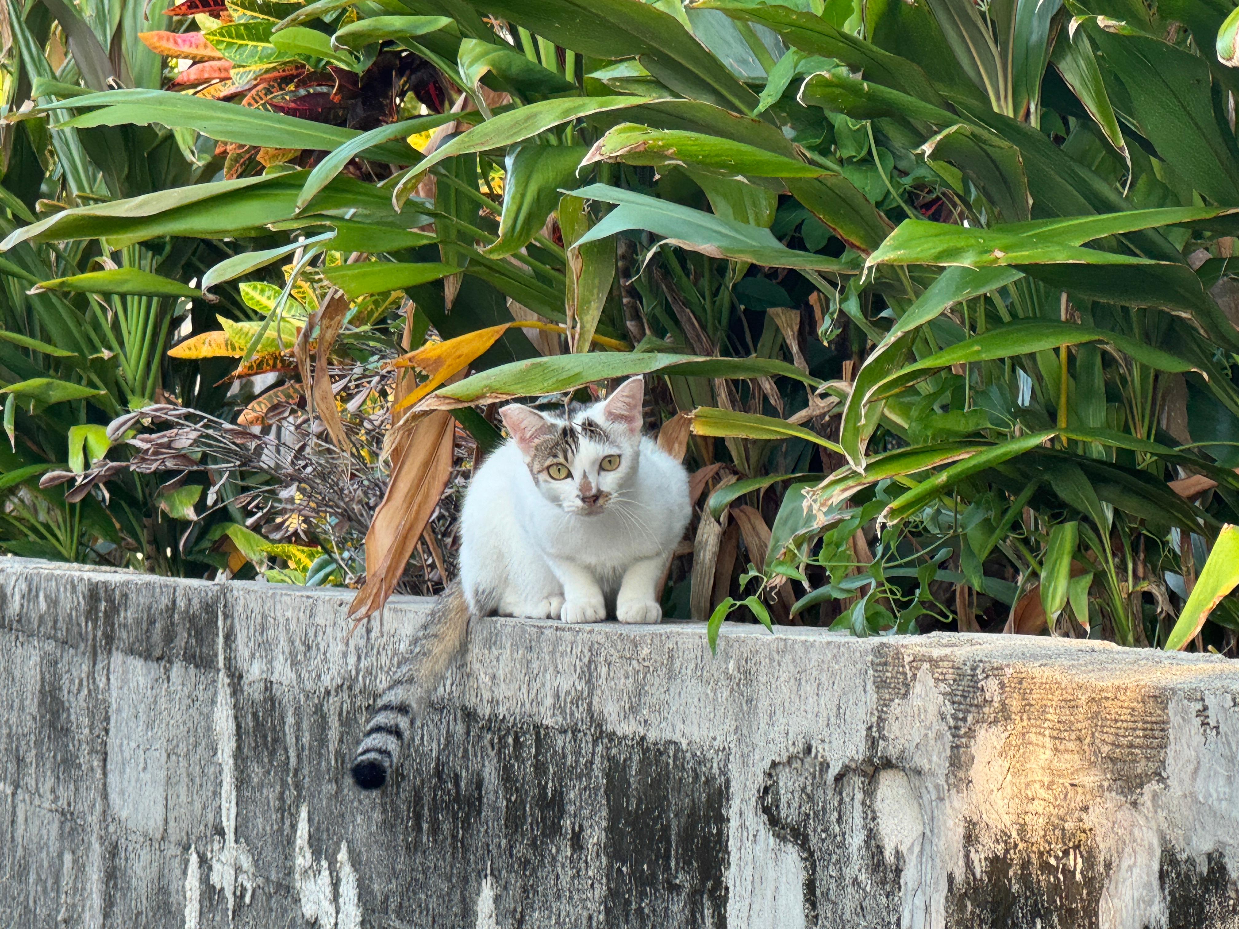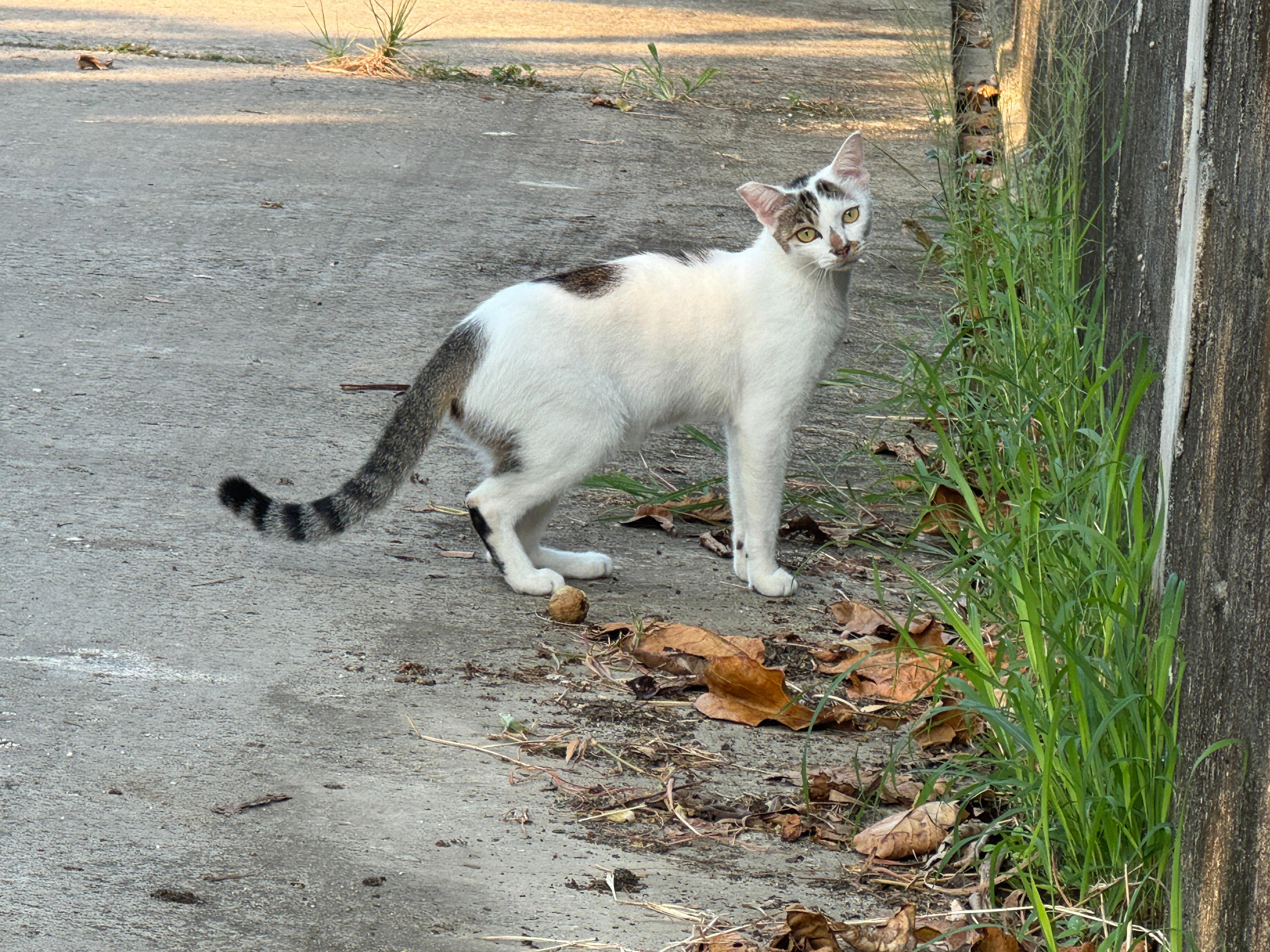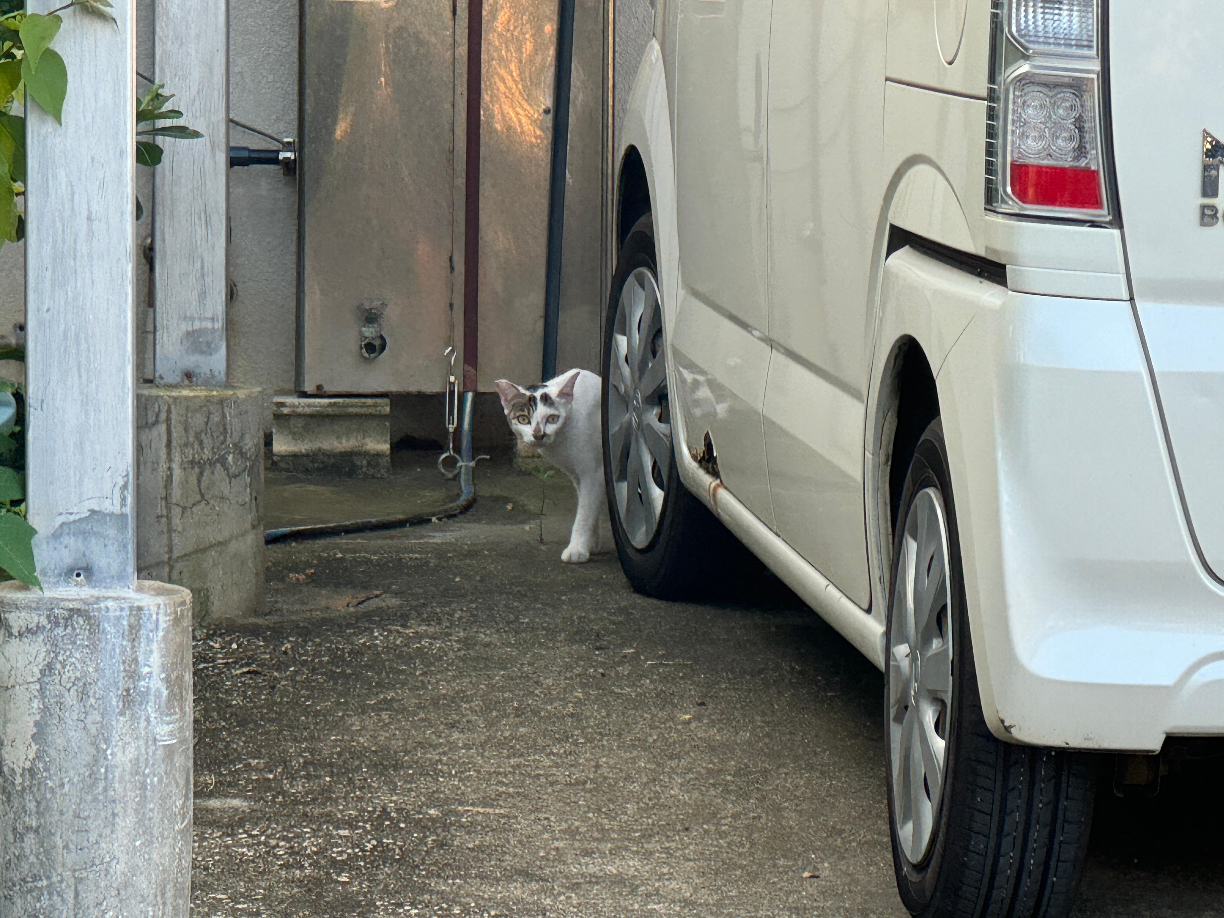 차 옆으로 얼굴을 삐쭉 내민 고양이가 보입니다.