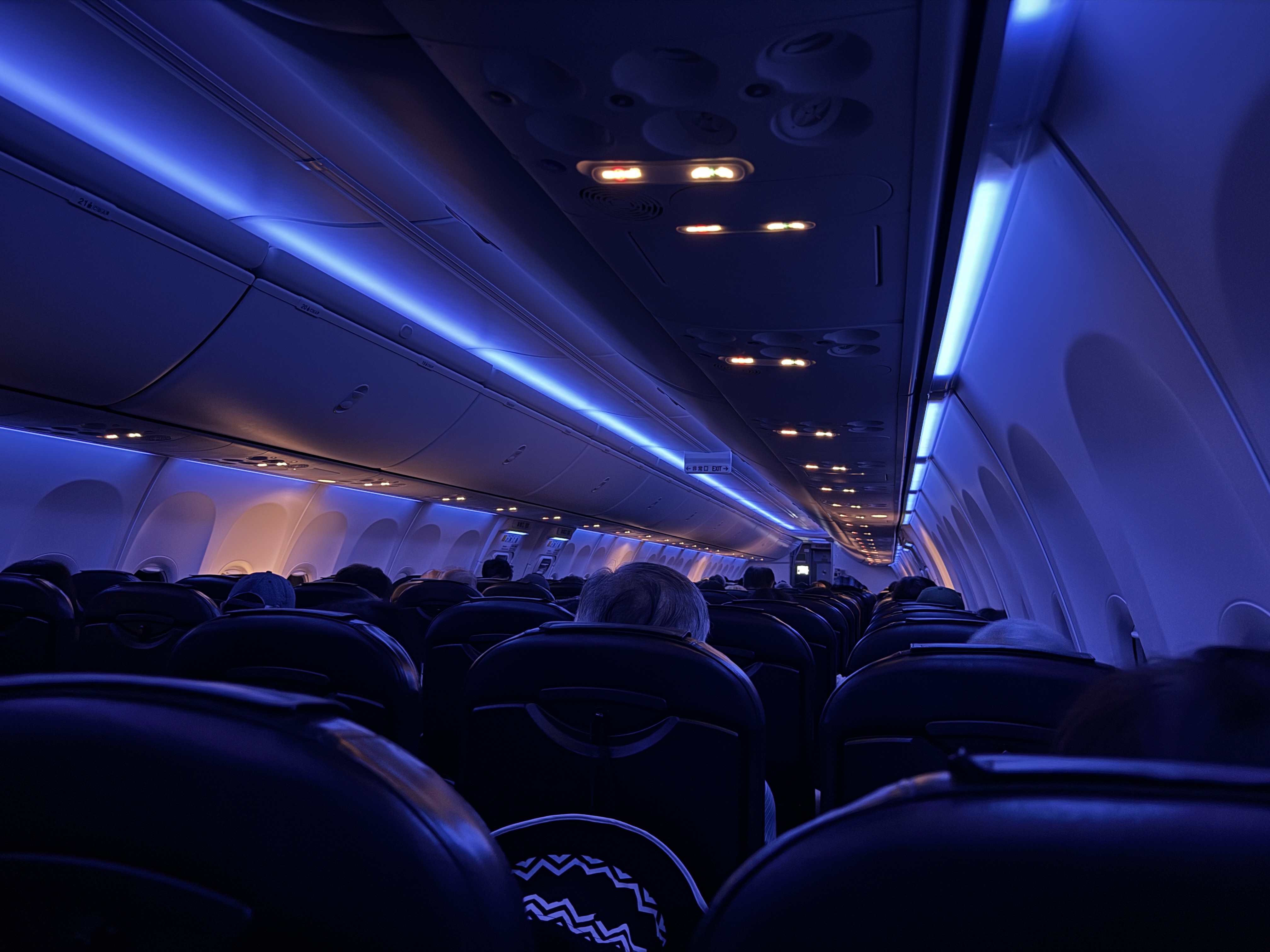 비행기 안도 착륙 준비를 위해 조명이 어두워집니다.
