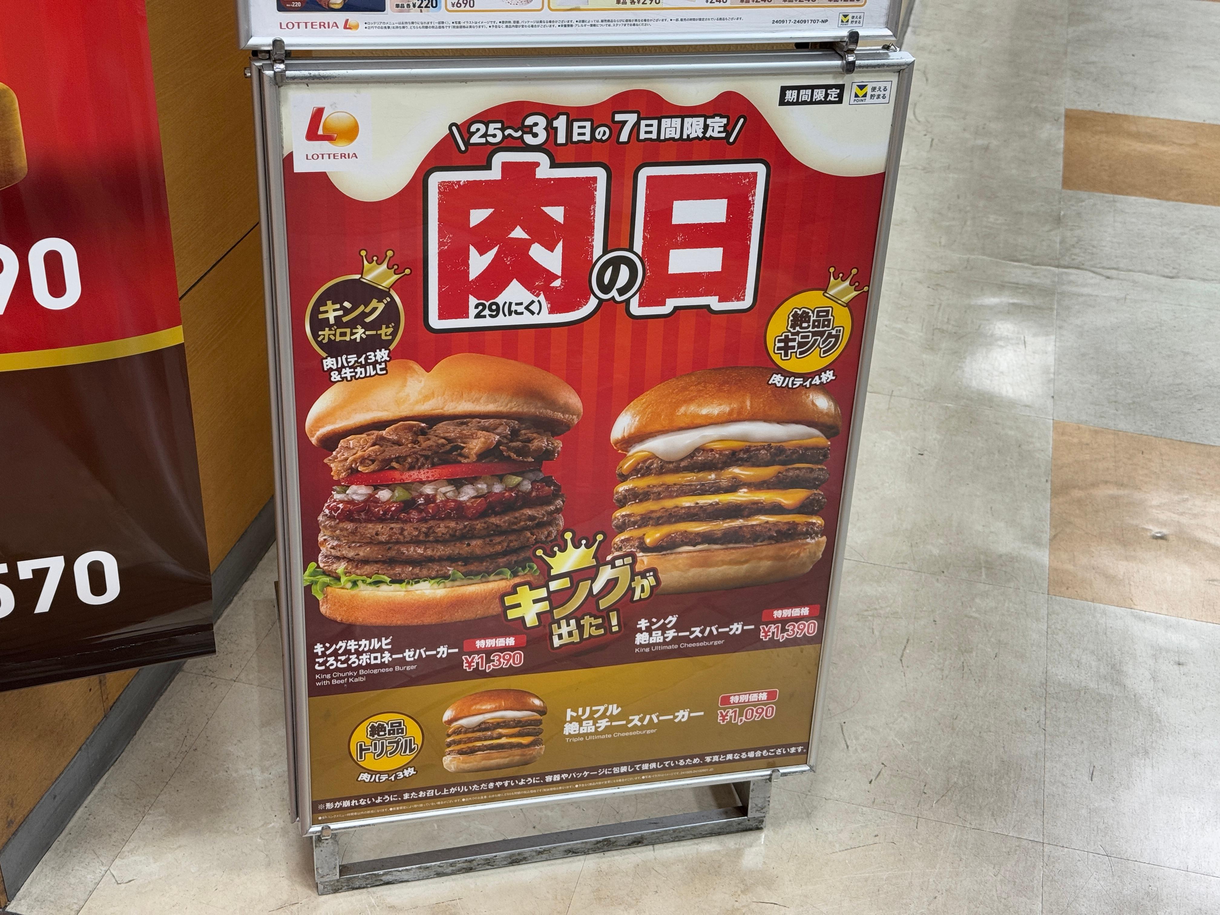 매월 29일은 고기의 날이니 일본 롯데리아(젯데리아)에서는 무식하게 패티만 듬뿍 넣은 햄버거를 팝니다.