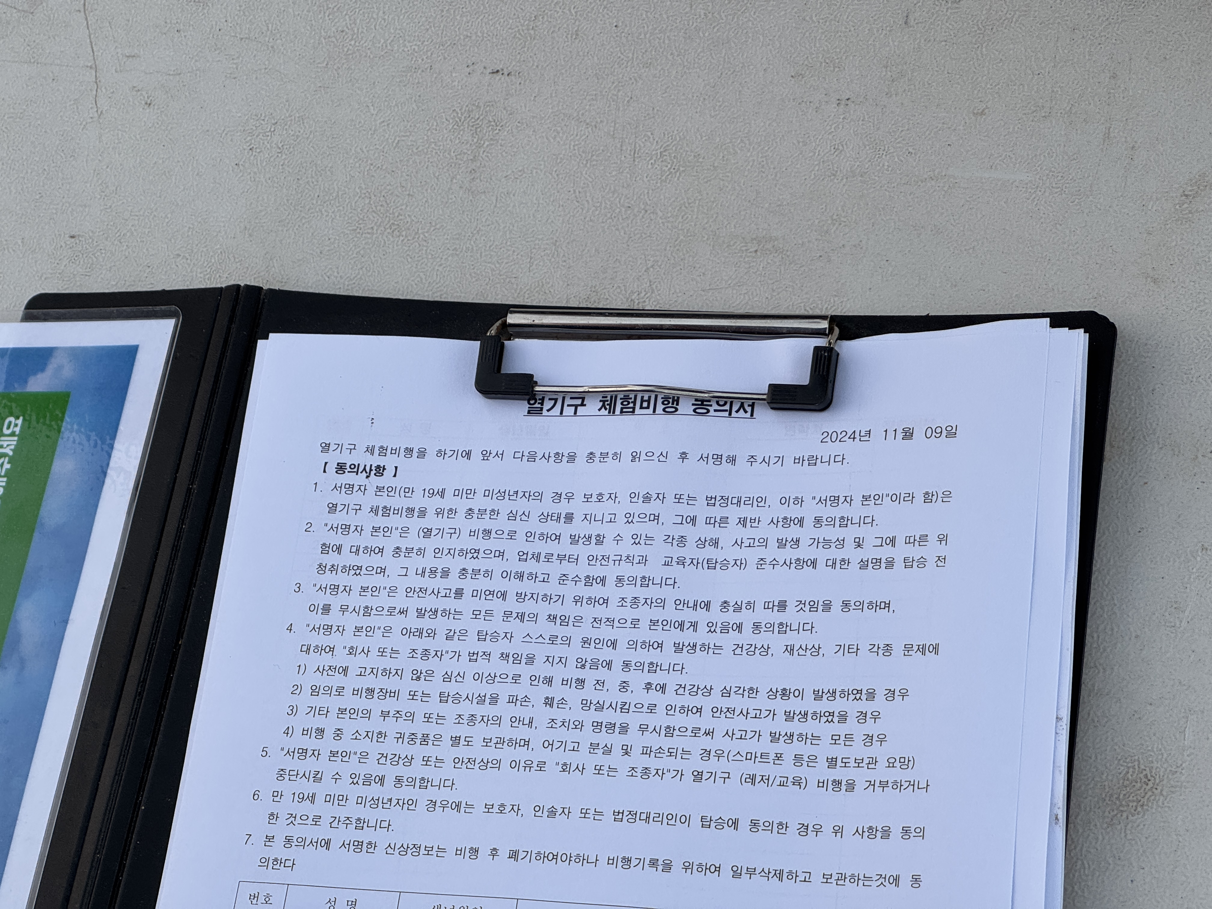 사고가 나면 모두가 골로 갈 수 있으니 열기구 체험비행 동의서에 서명을 하고