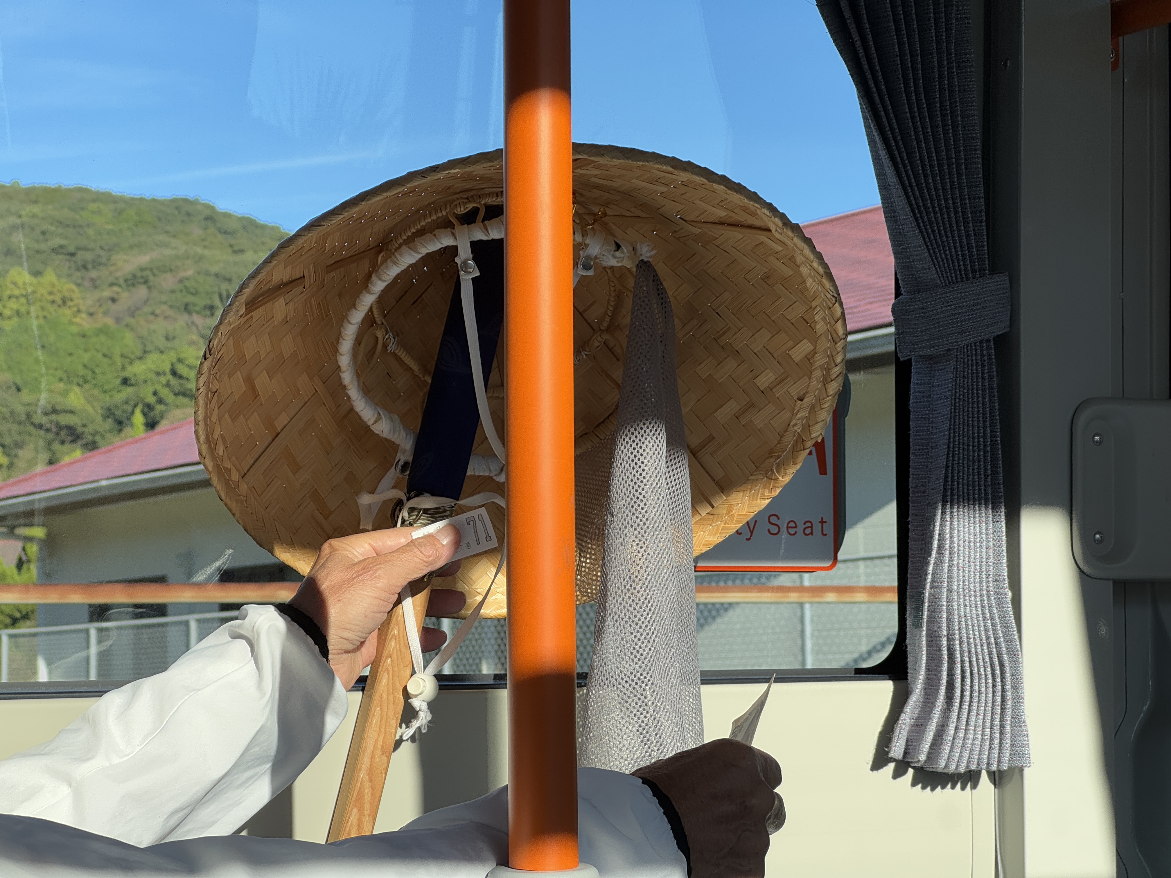 삿갓을 쓴 오헨로 순례자들이 버스를 타기 시작합니다.