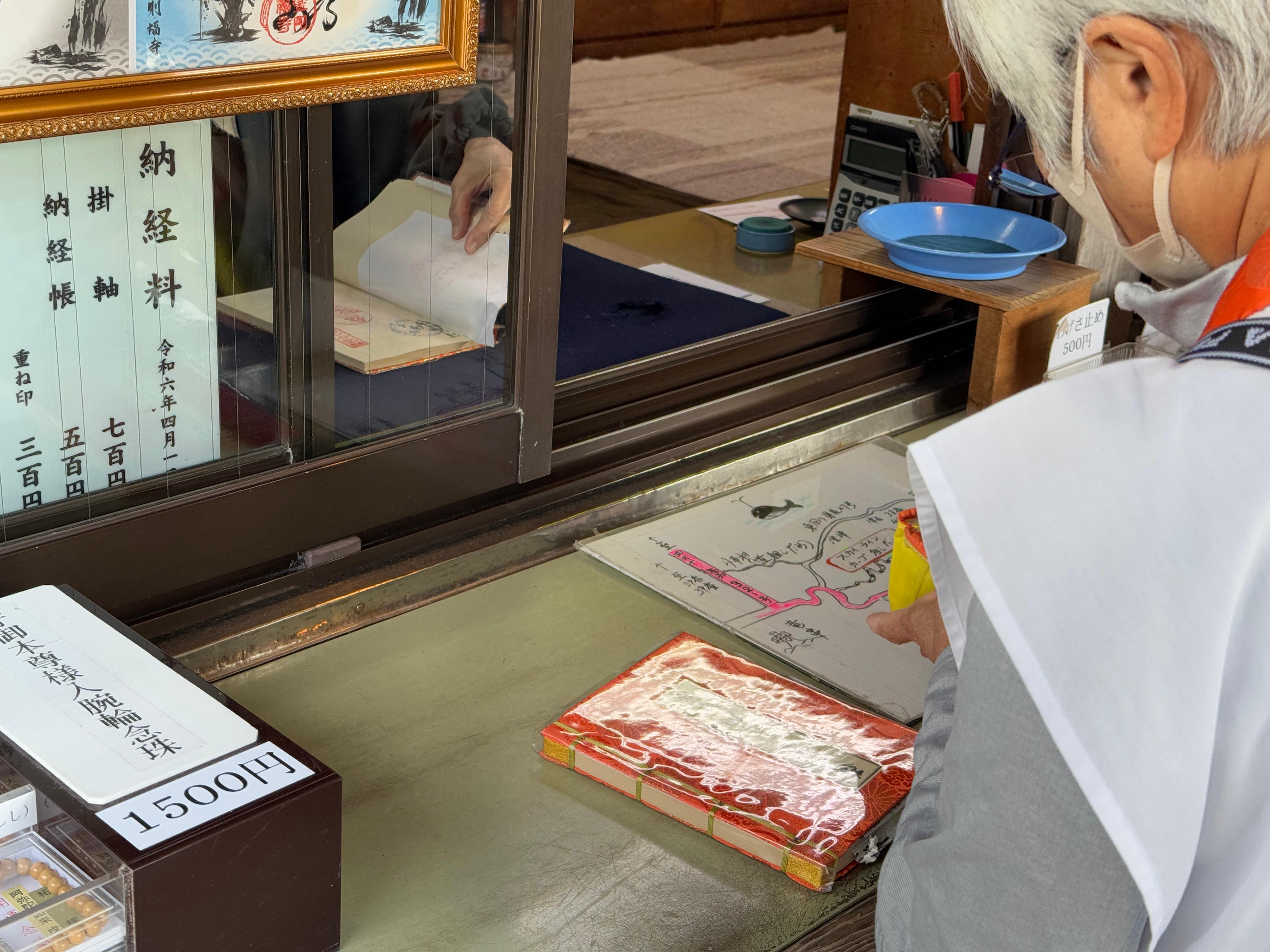 뇨코쵸(納経帳)에 도장을 찍고 붓으로 순례 기록을 남기는데