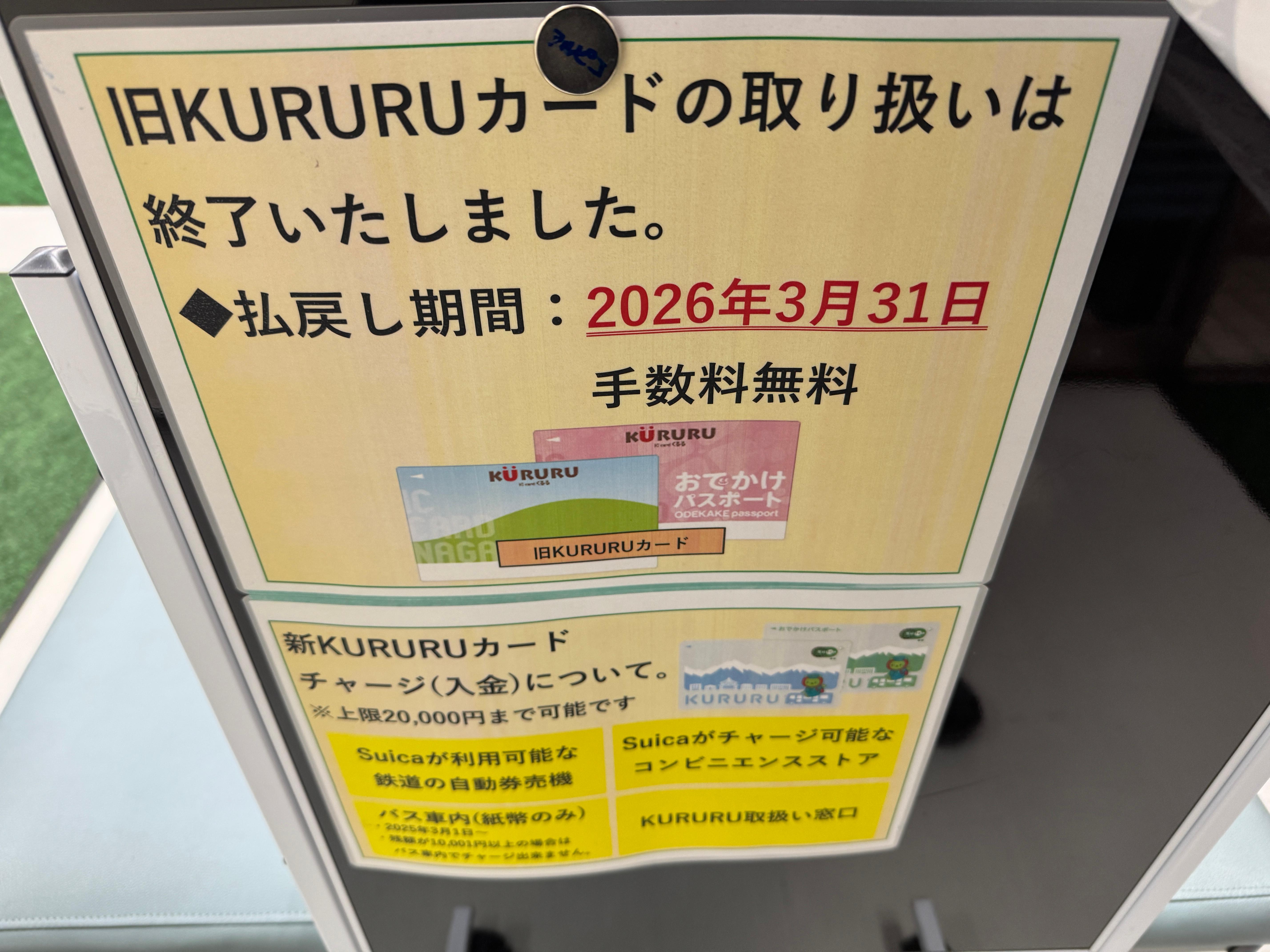 오랫동안 나가노 일대에서 사용하던 지역 전용 교통카드 KURURU가 사용을 종료하고
