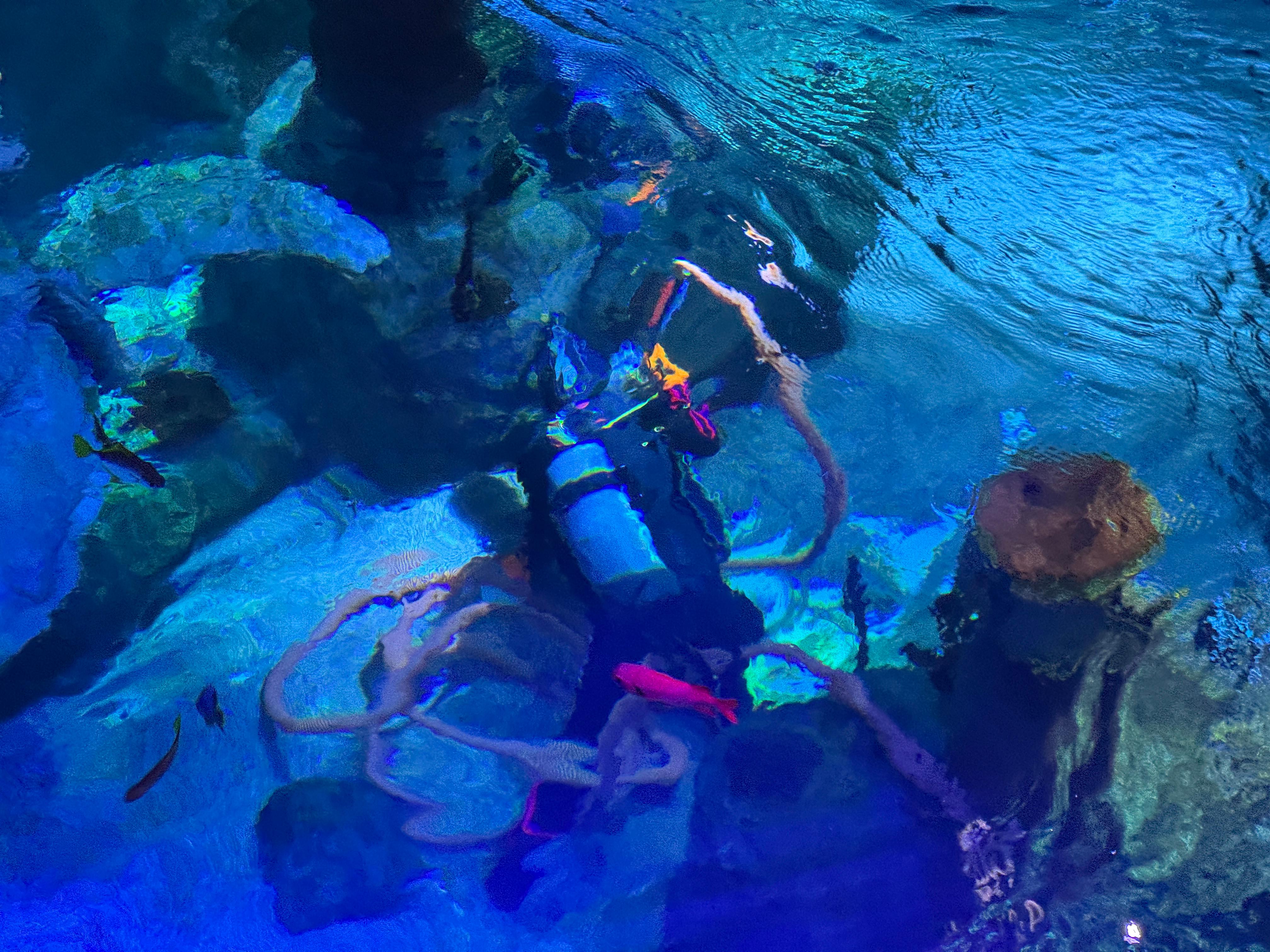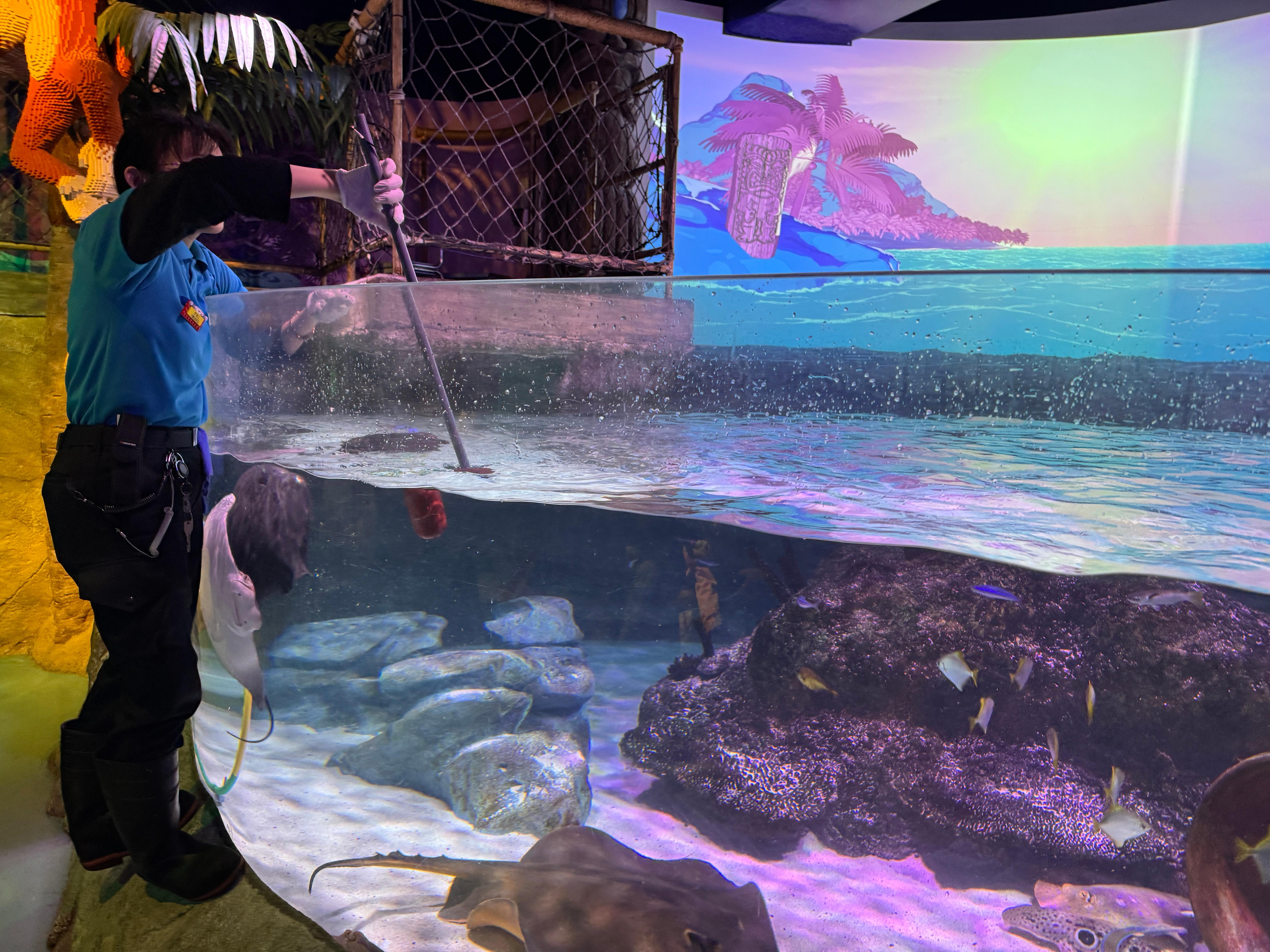 한가한 시간대에 수조를 청소하는 직원 모습을 보면서