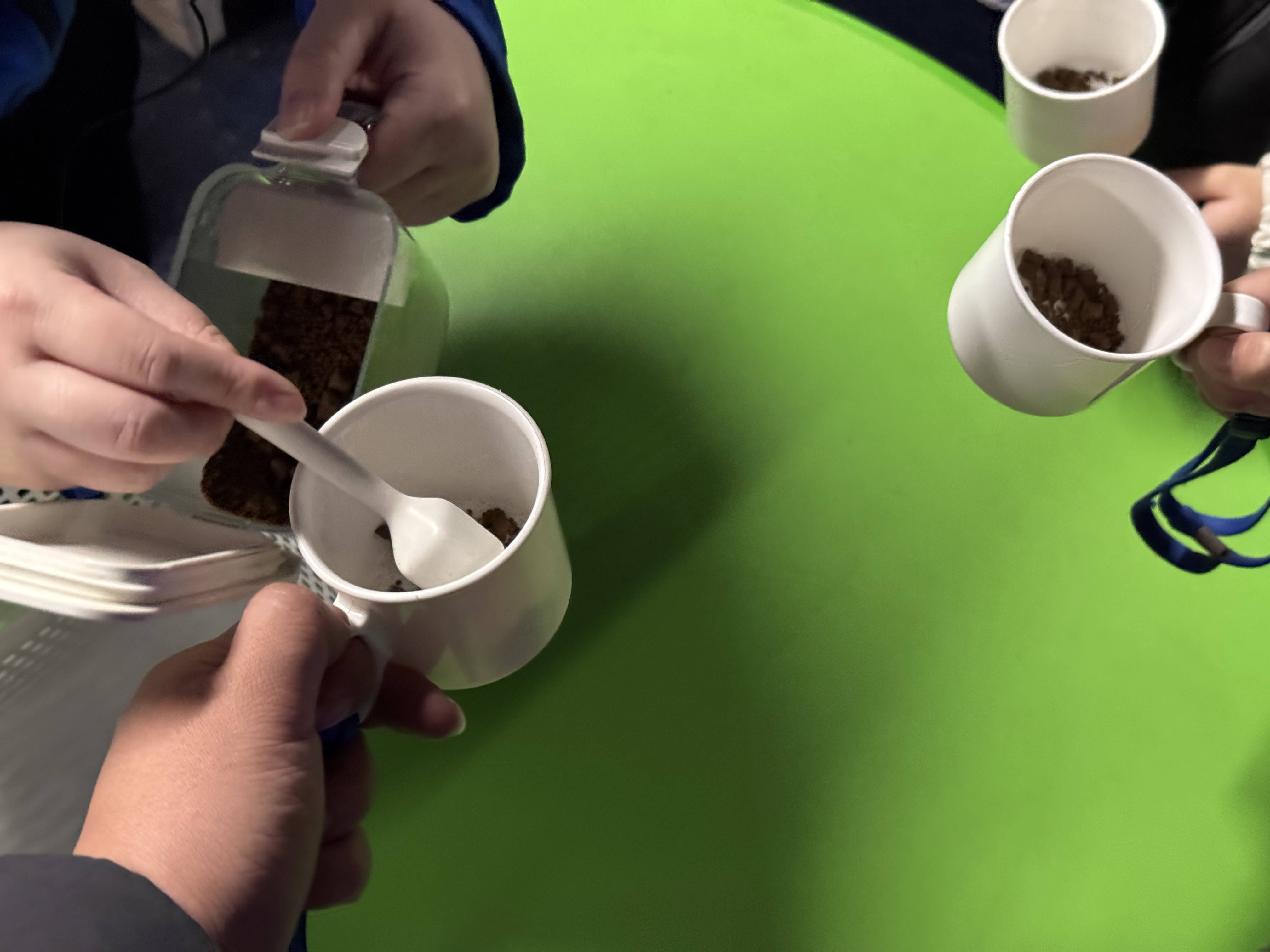 컵에 담아 물에 뿌릴 수 있는 작은 먹이를 줍니다.