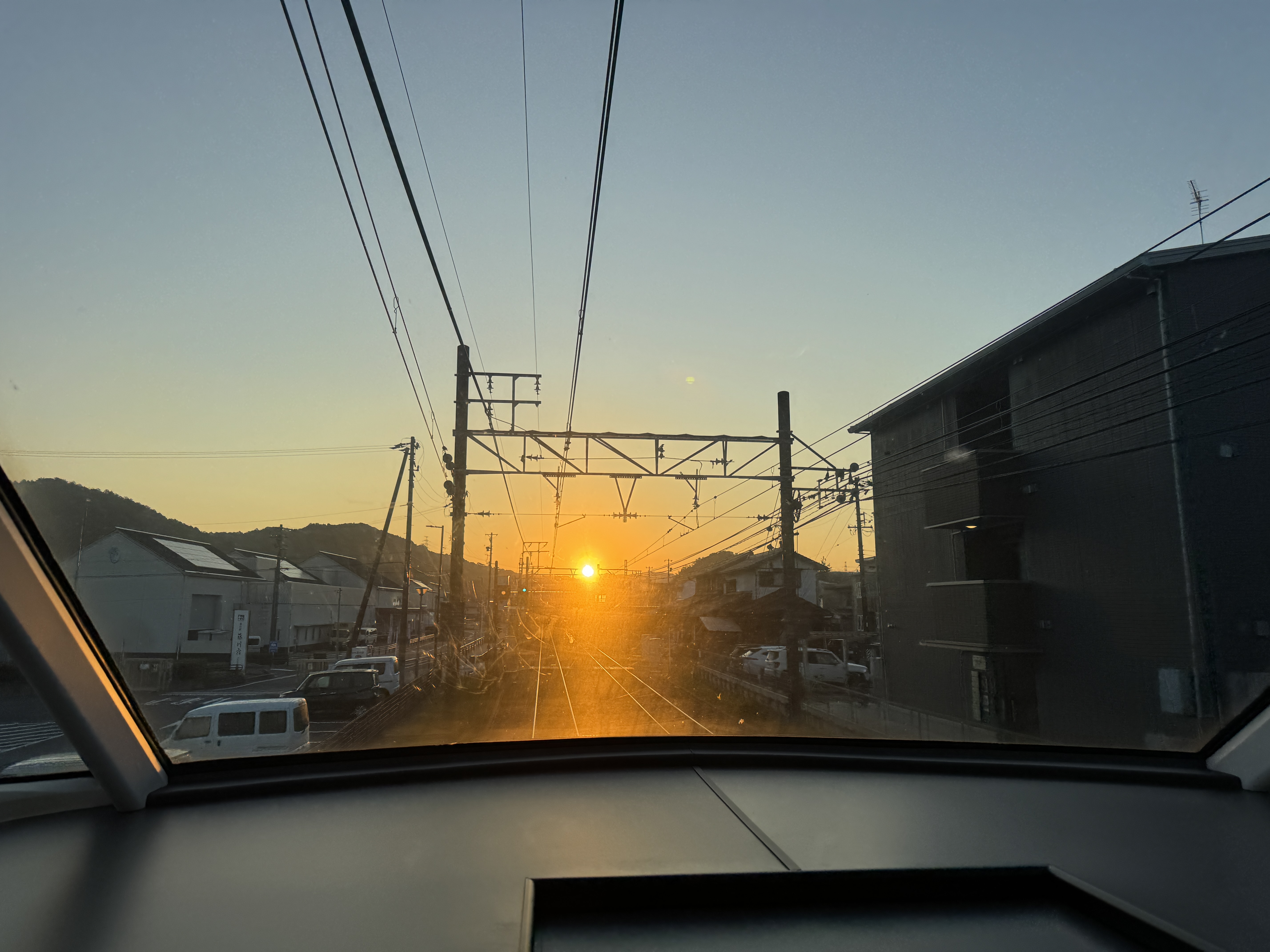 반대편 선로로 달리는 열차는 메이테츠 열차가 아닌 JR 열차입니다.