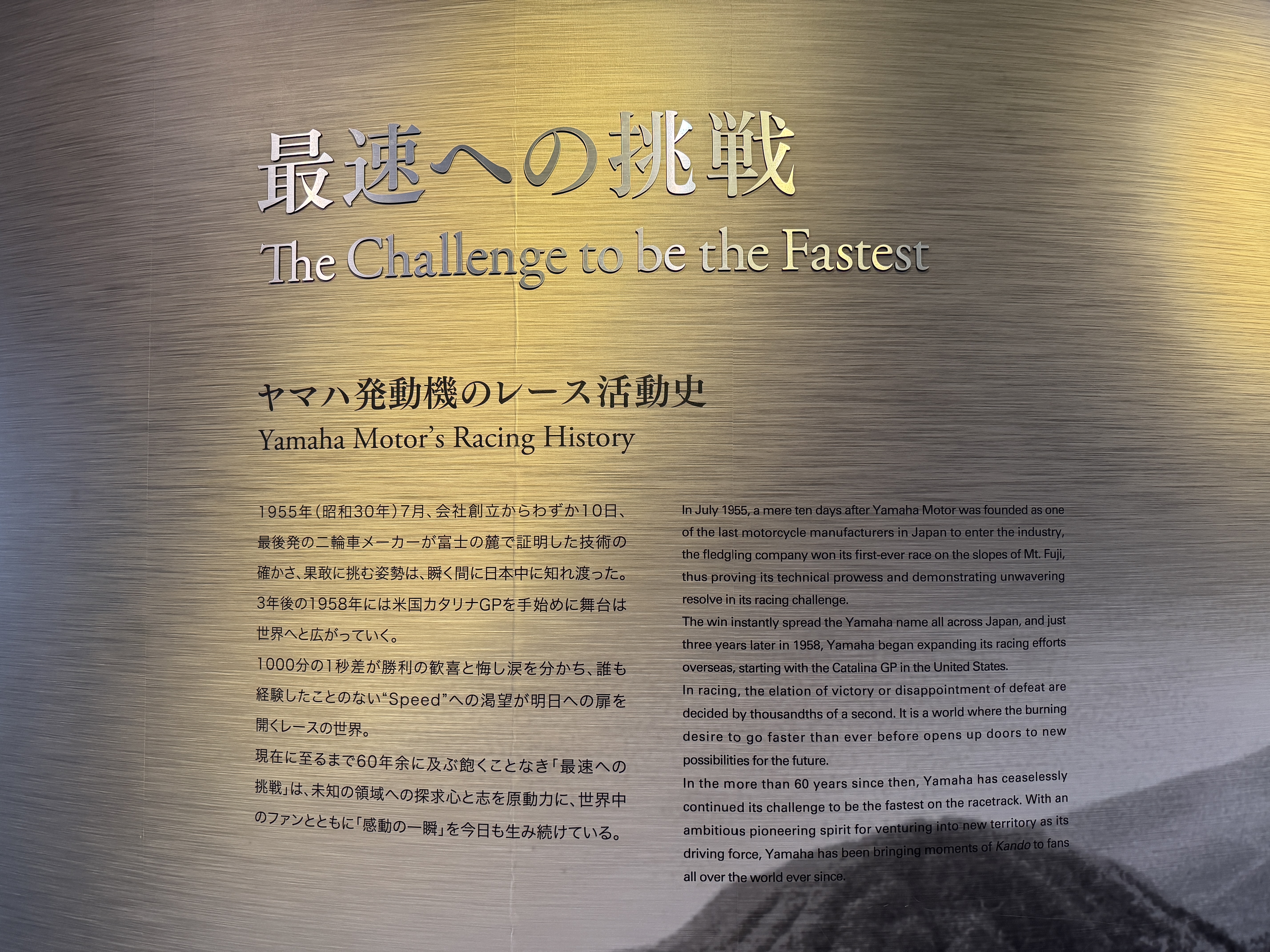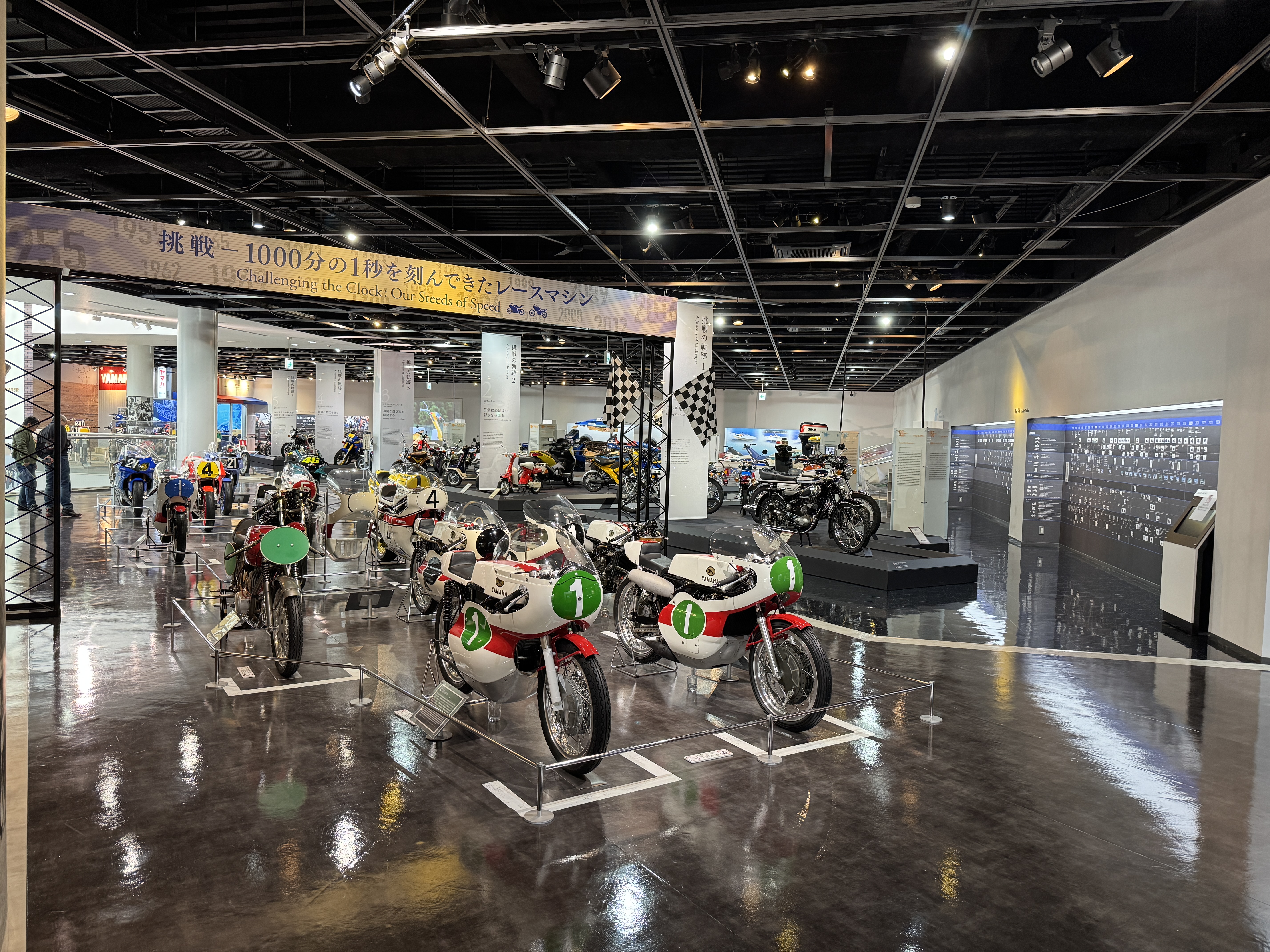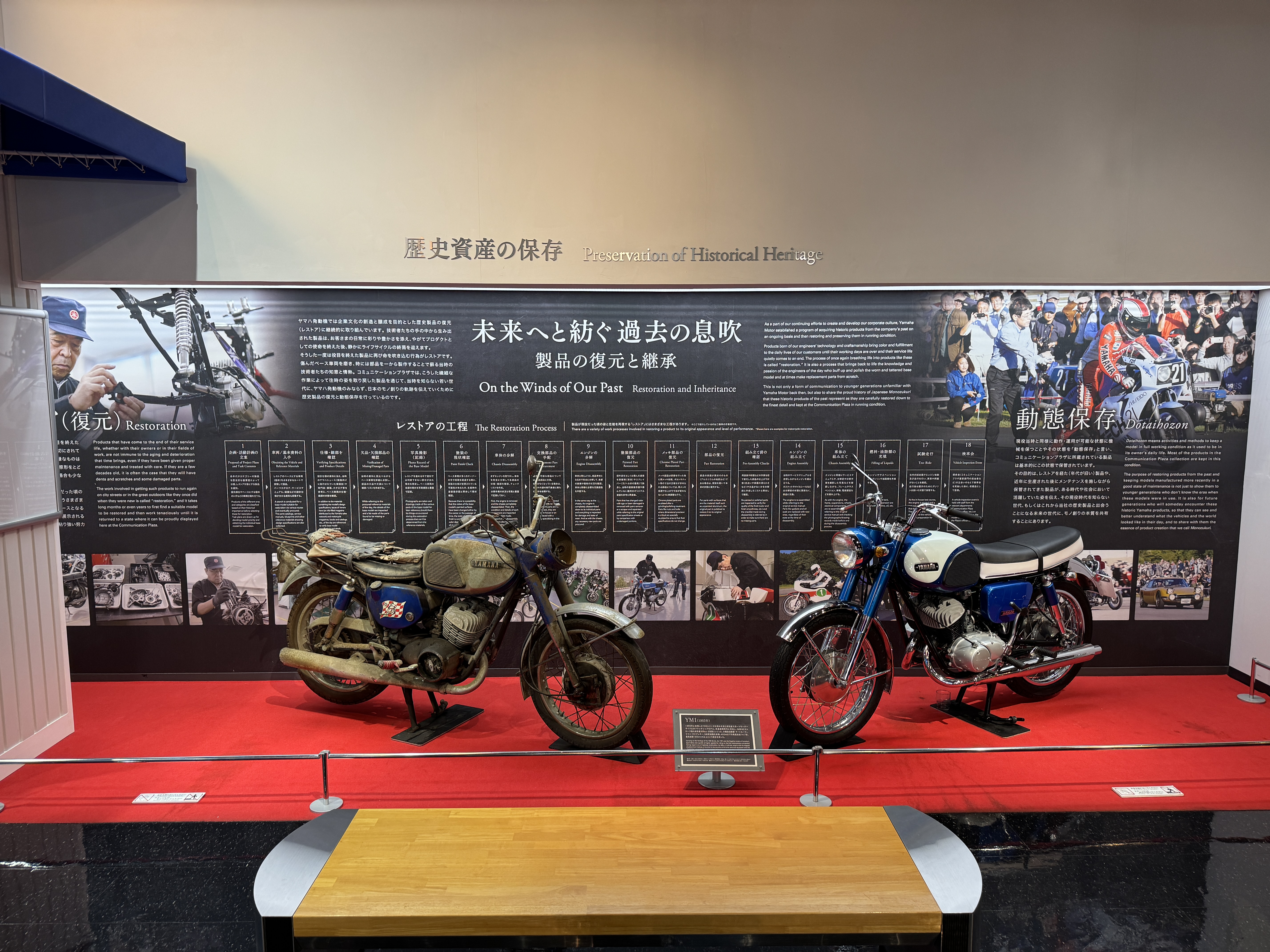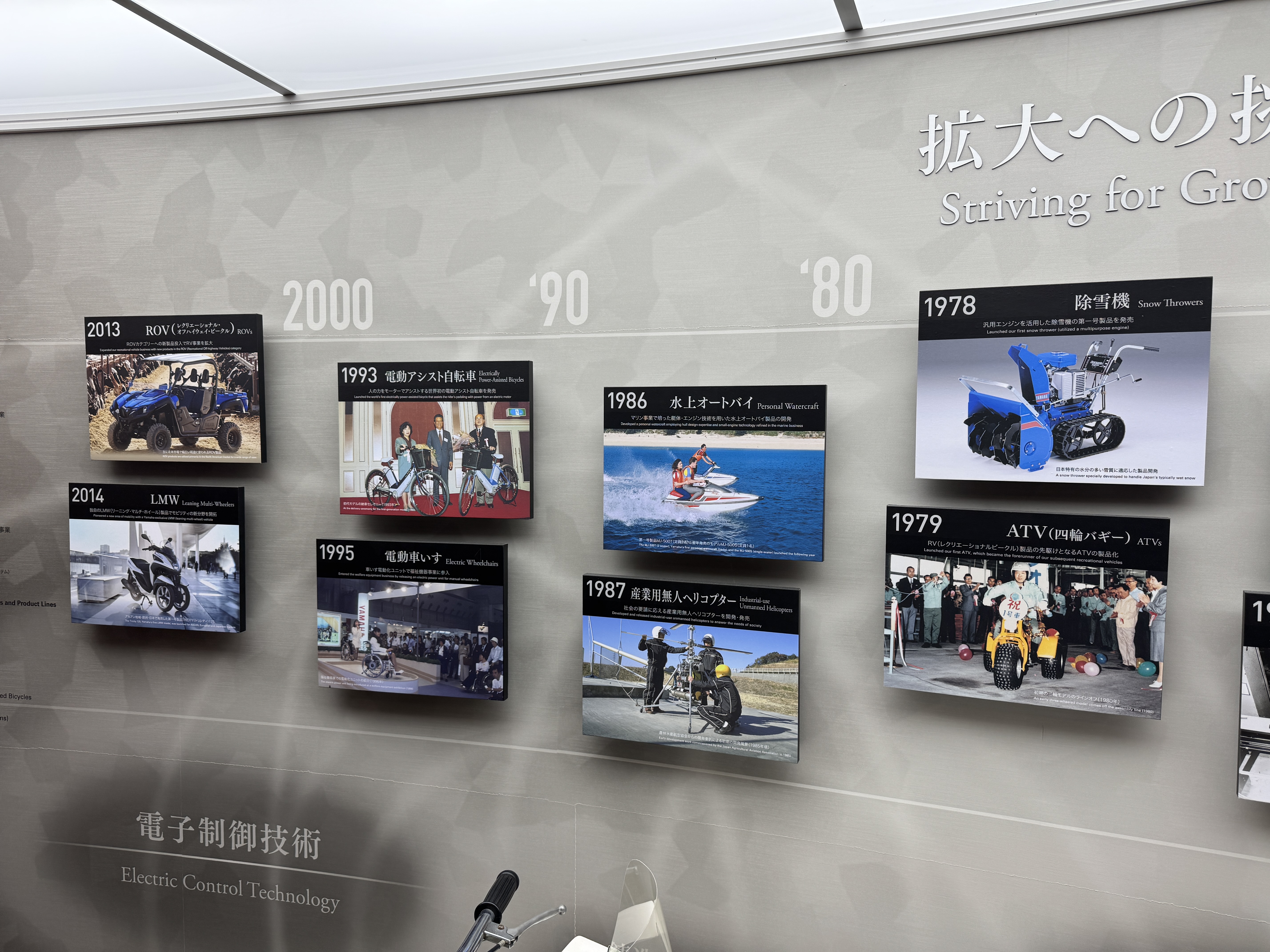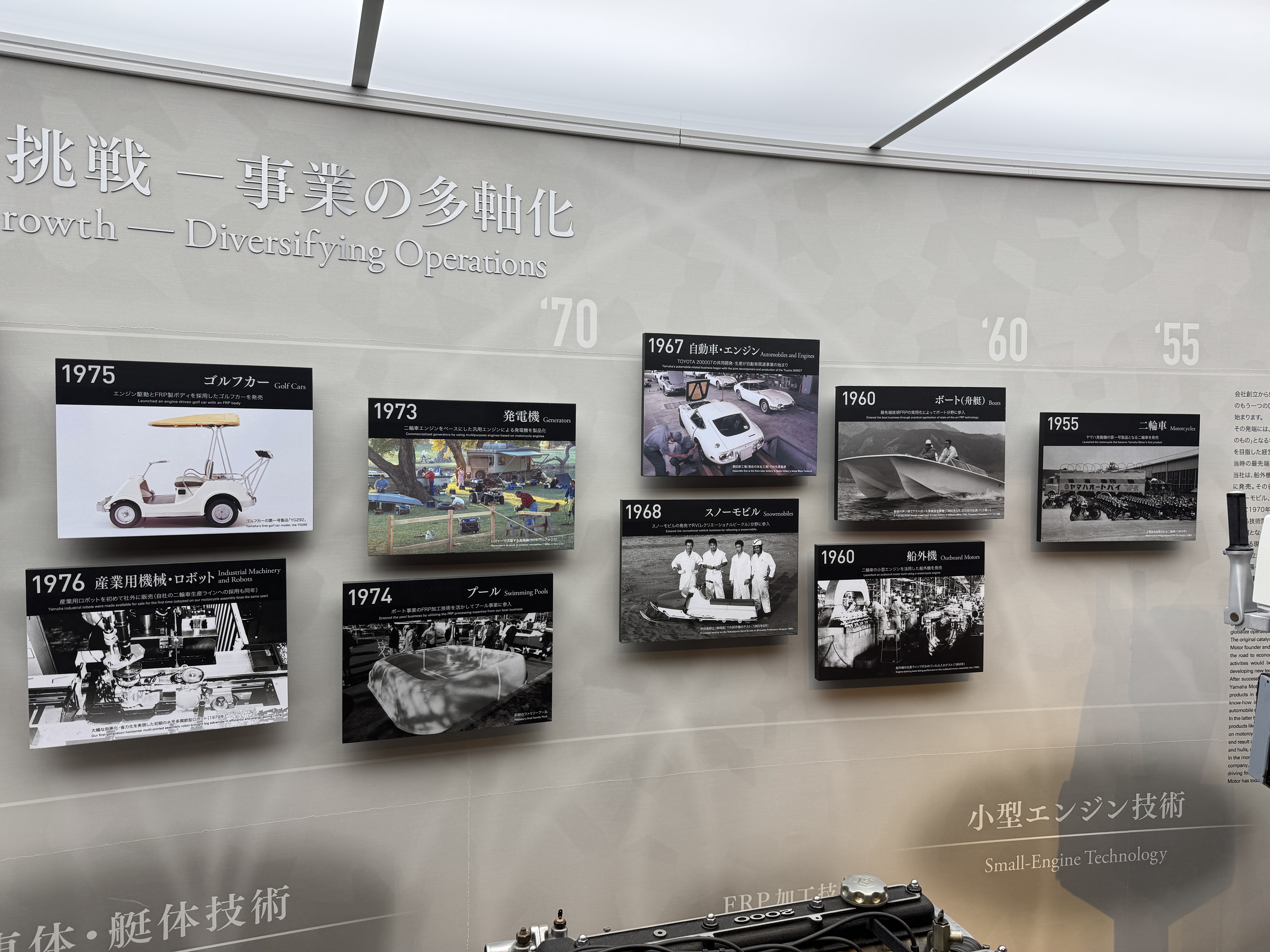 창사 70주년을 기념해 야마하 모터의 발자취를 보여주는 여러 사진이 본사 울타리에 걸려 있네요.