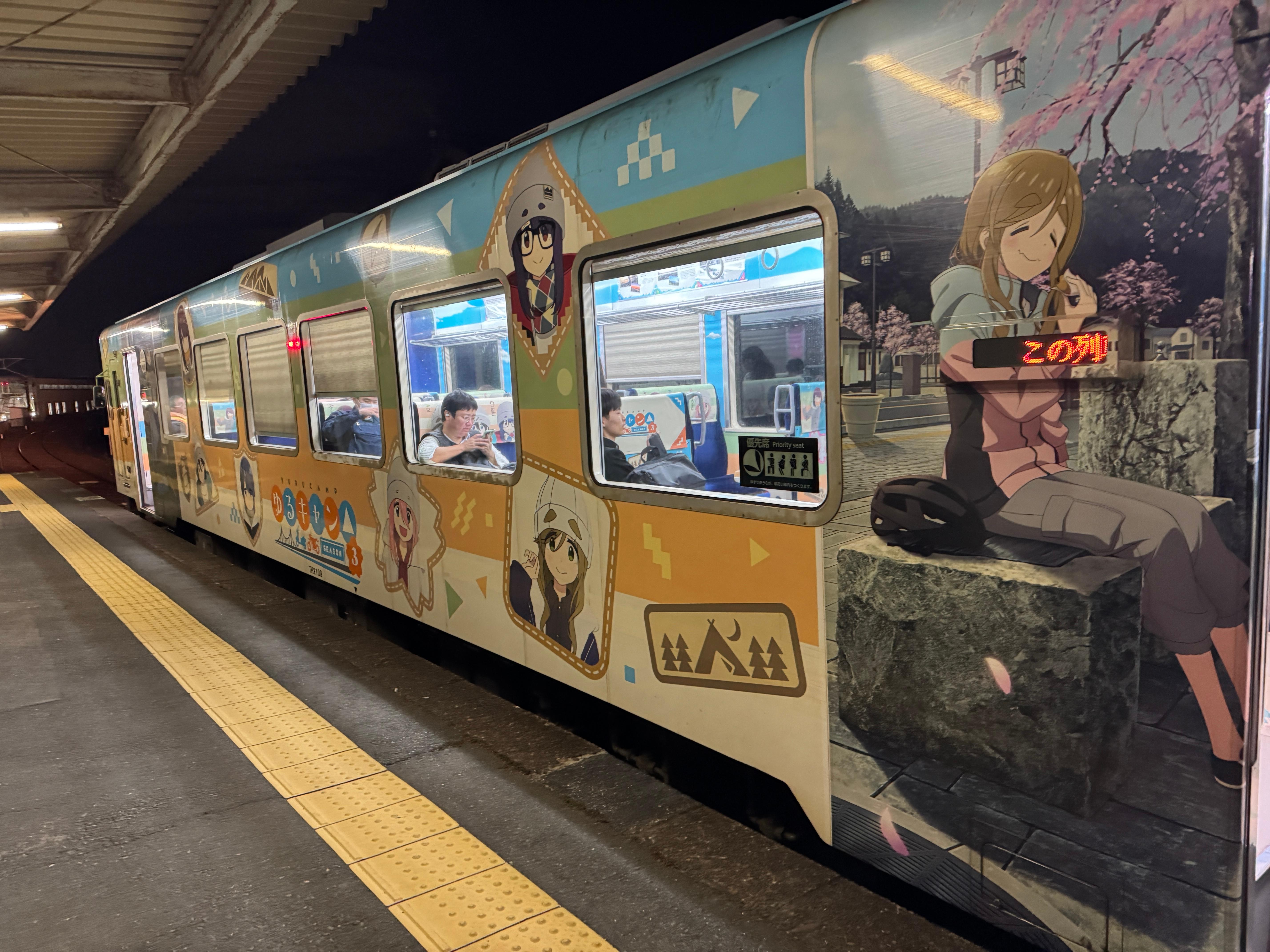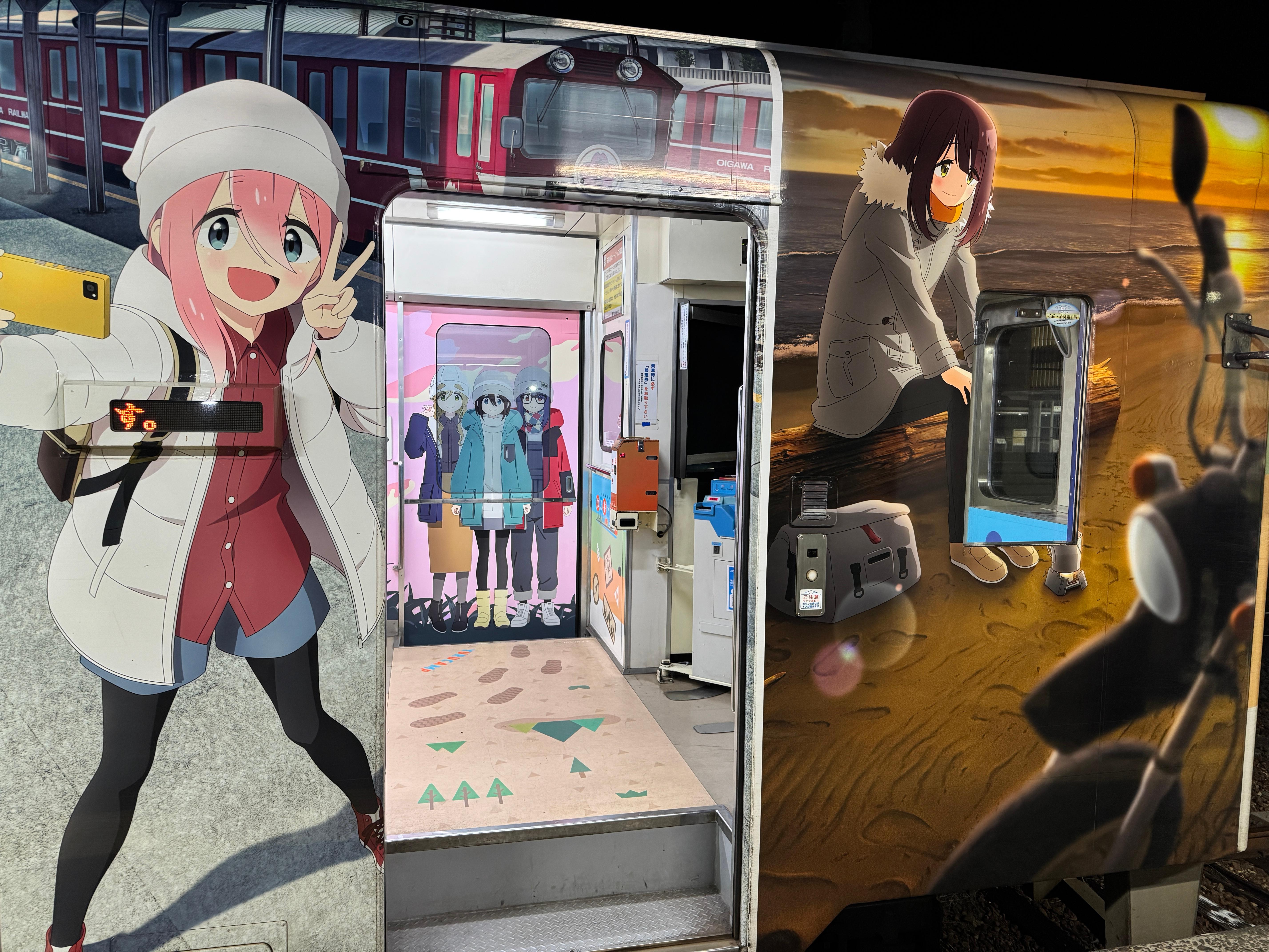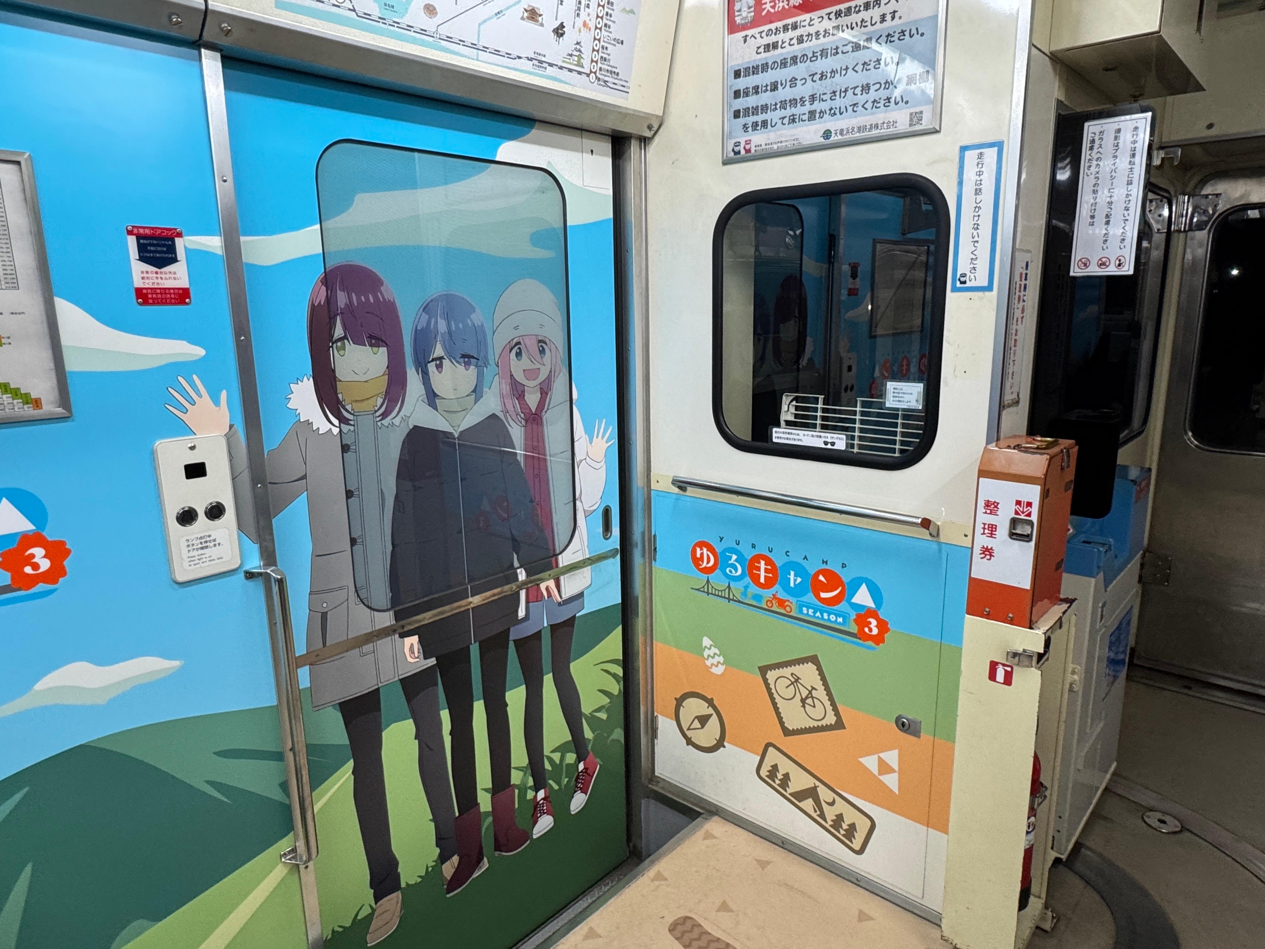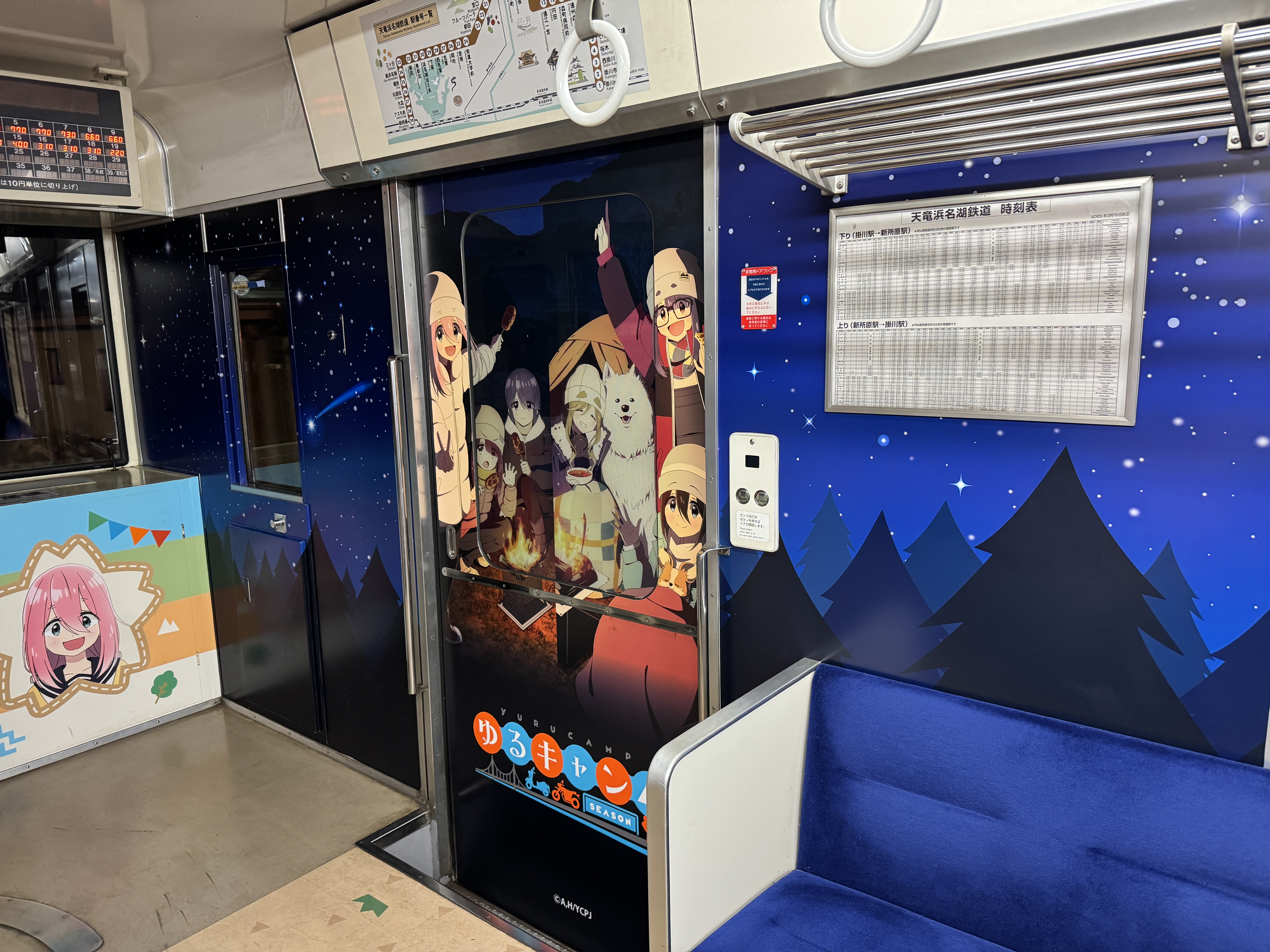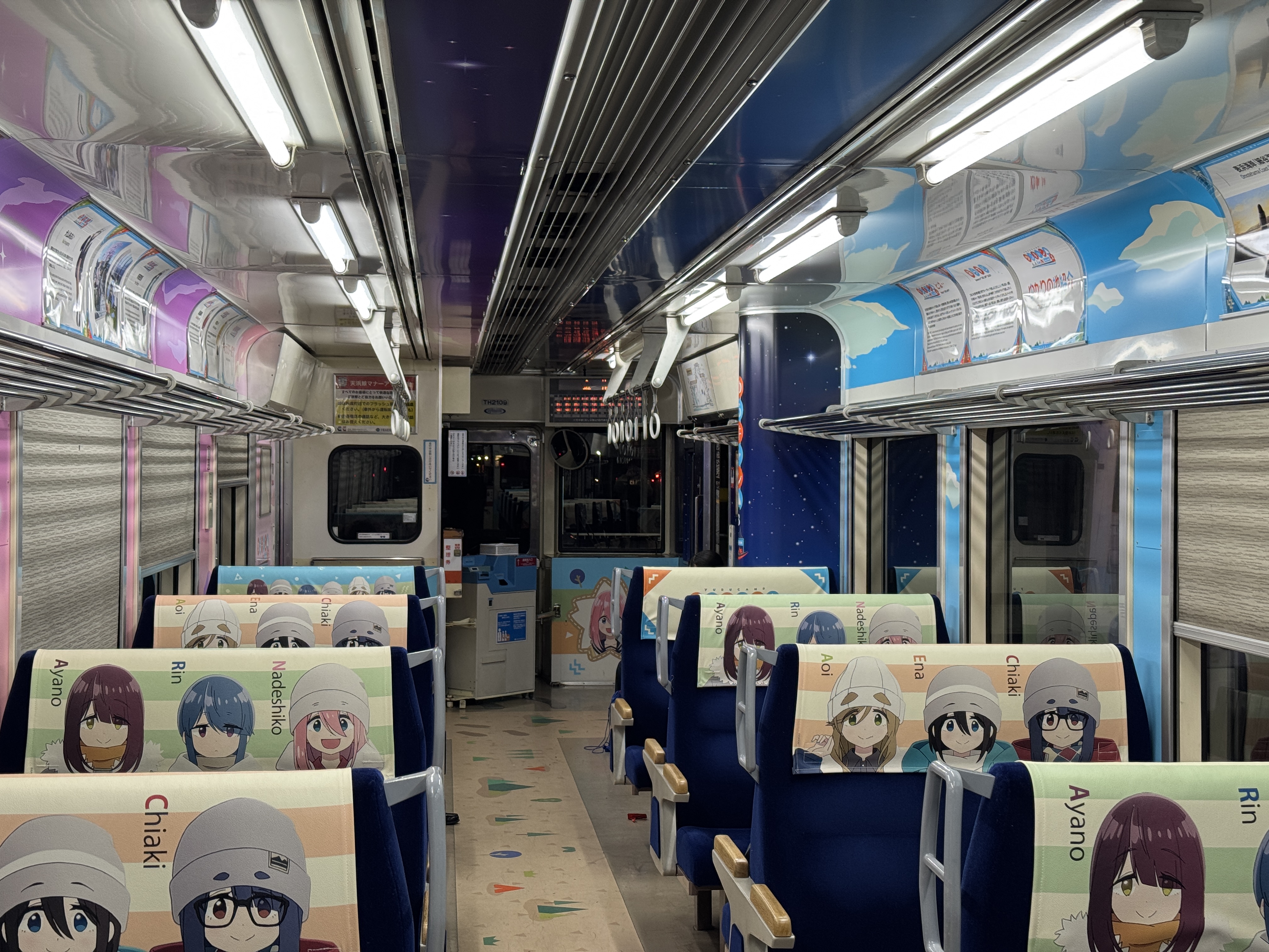 열차 내부 벽면과 출입문까지 유루캠△ 래핑을 부담스러울 정도로 도배해 놔서 충격적이네요.