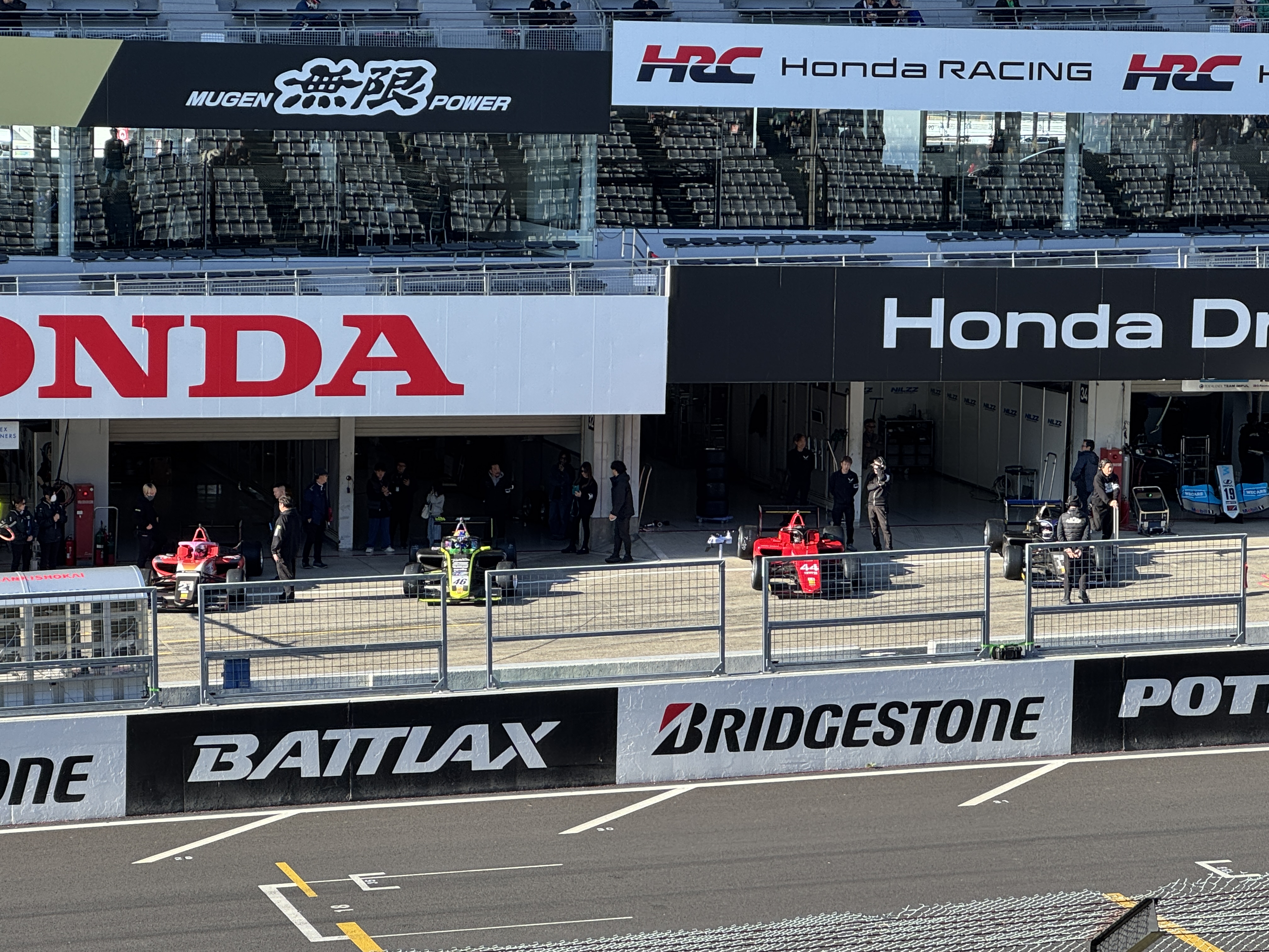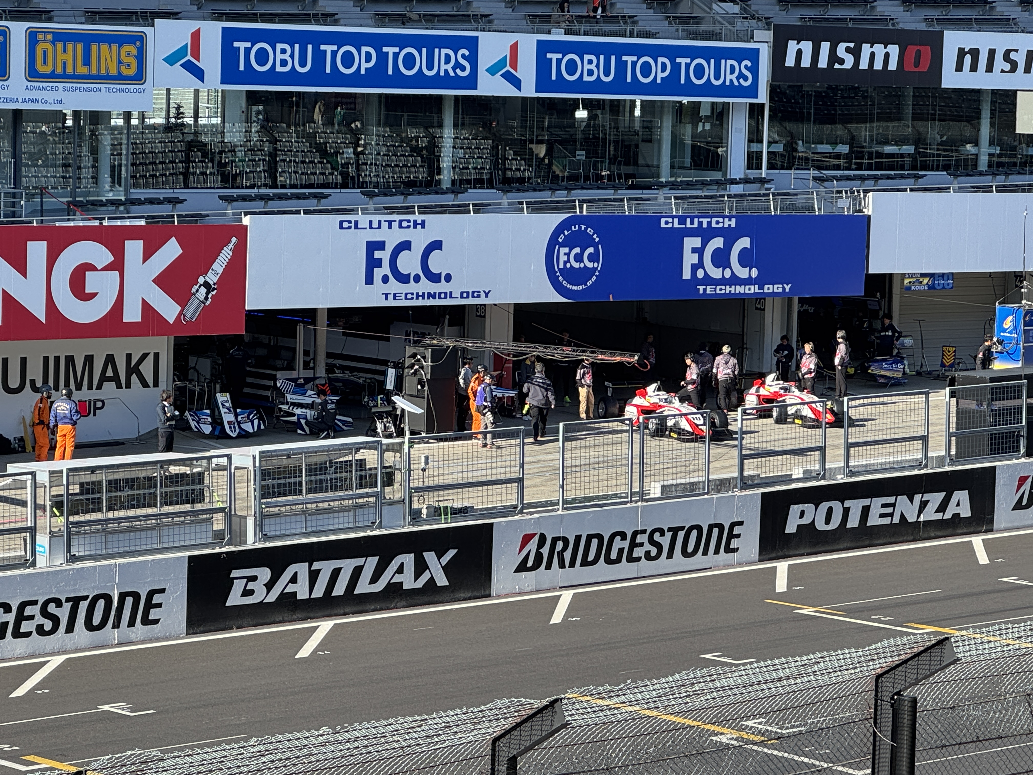 피트에는 슈퍼 포뮬러 예선 때 달리던 차보다 조금 작은 사이즈의 차들이 출발을 기다리고 있습니다.