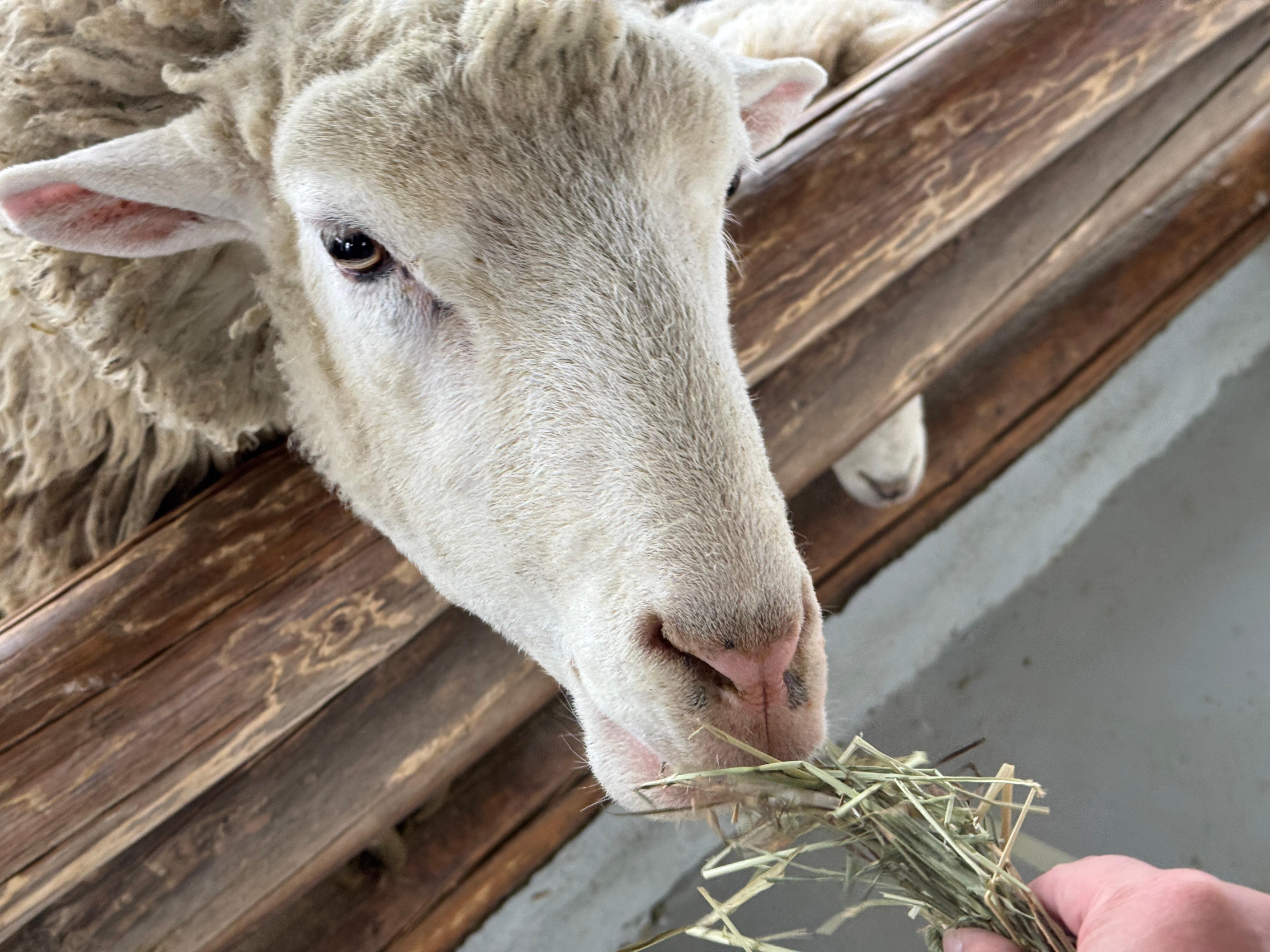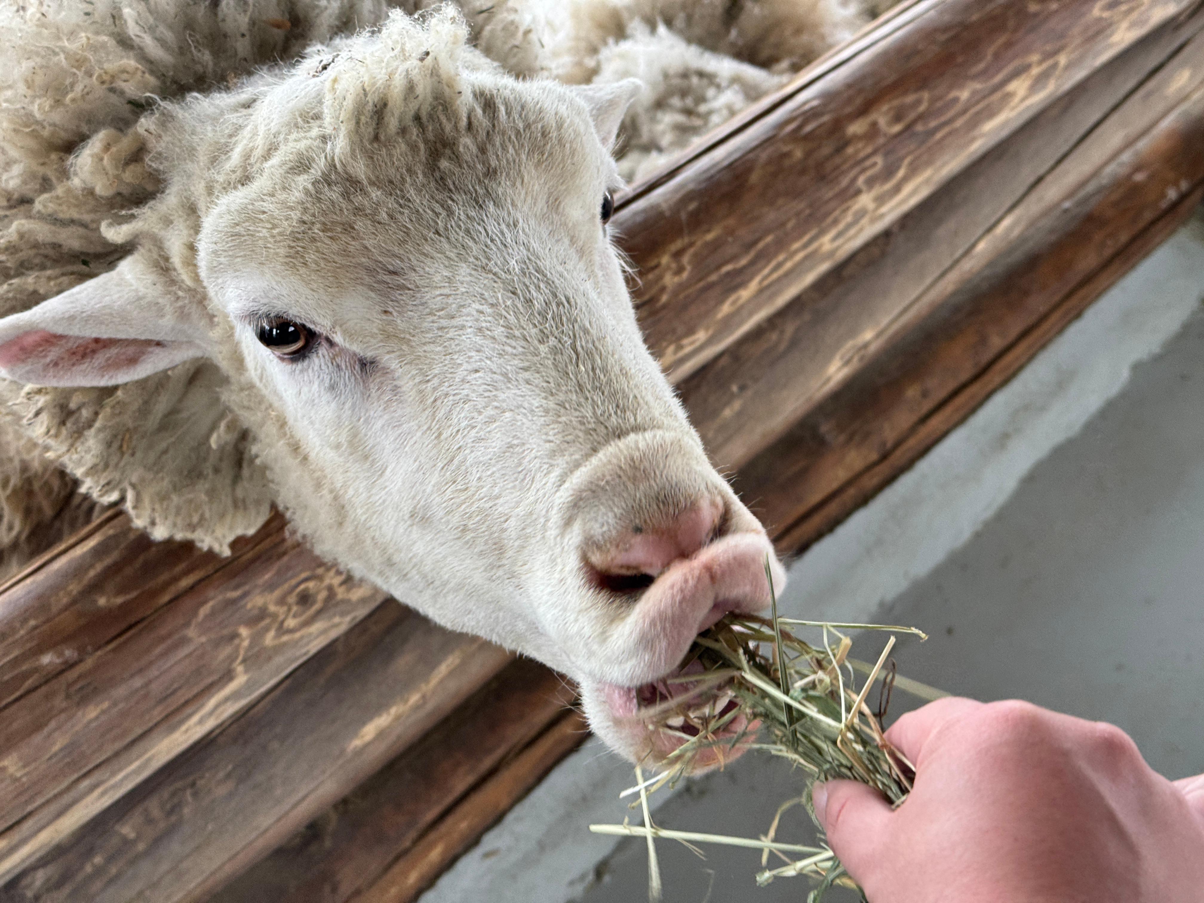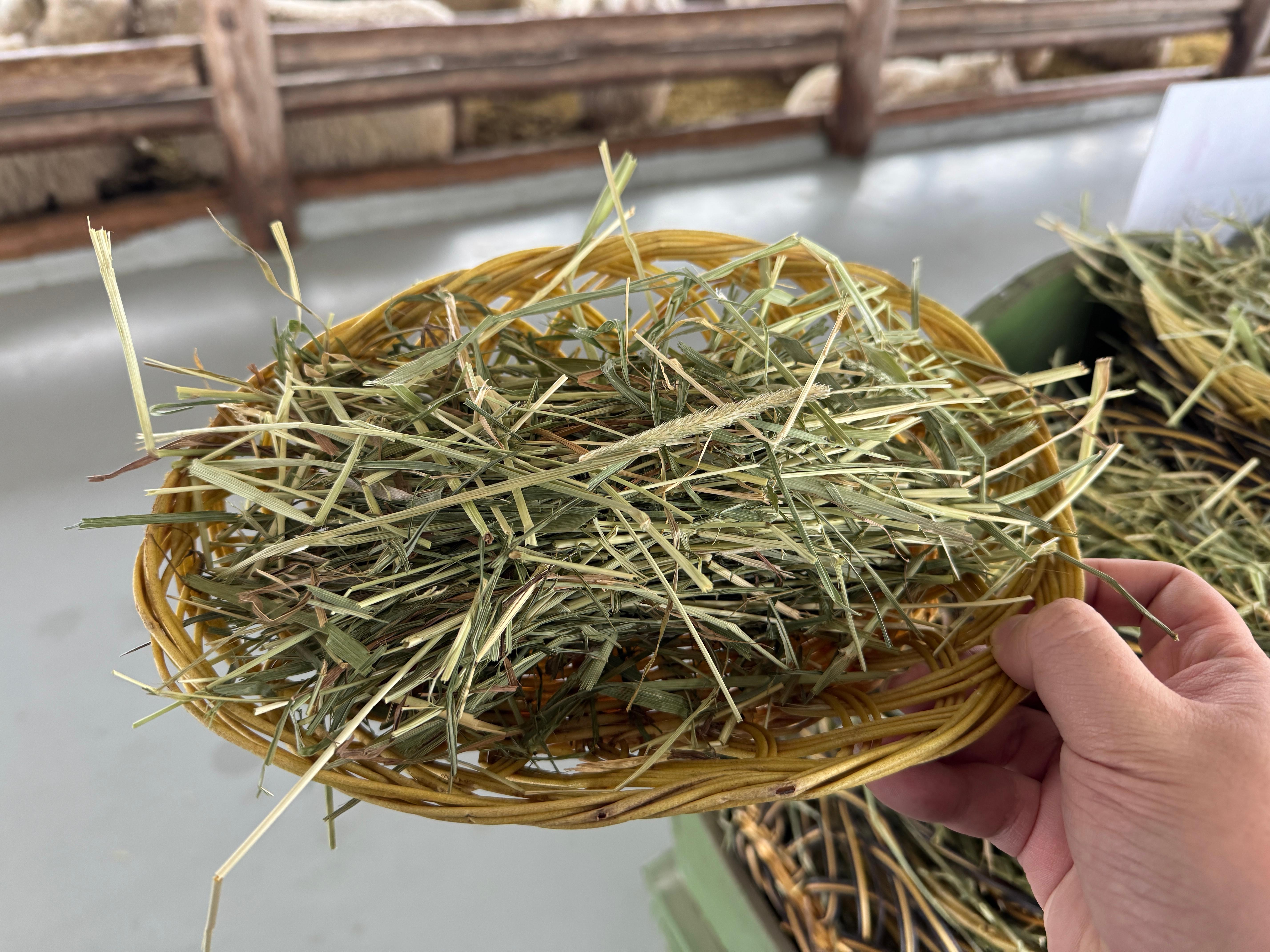 입을 모아 건초를 빨아들이듯이 먹는 양들의 모습을 보며 건초를 나눠주고