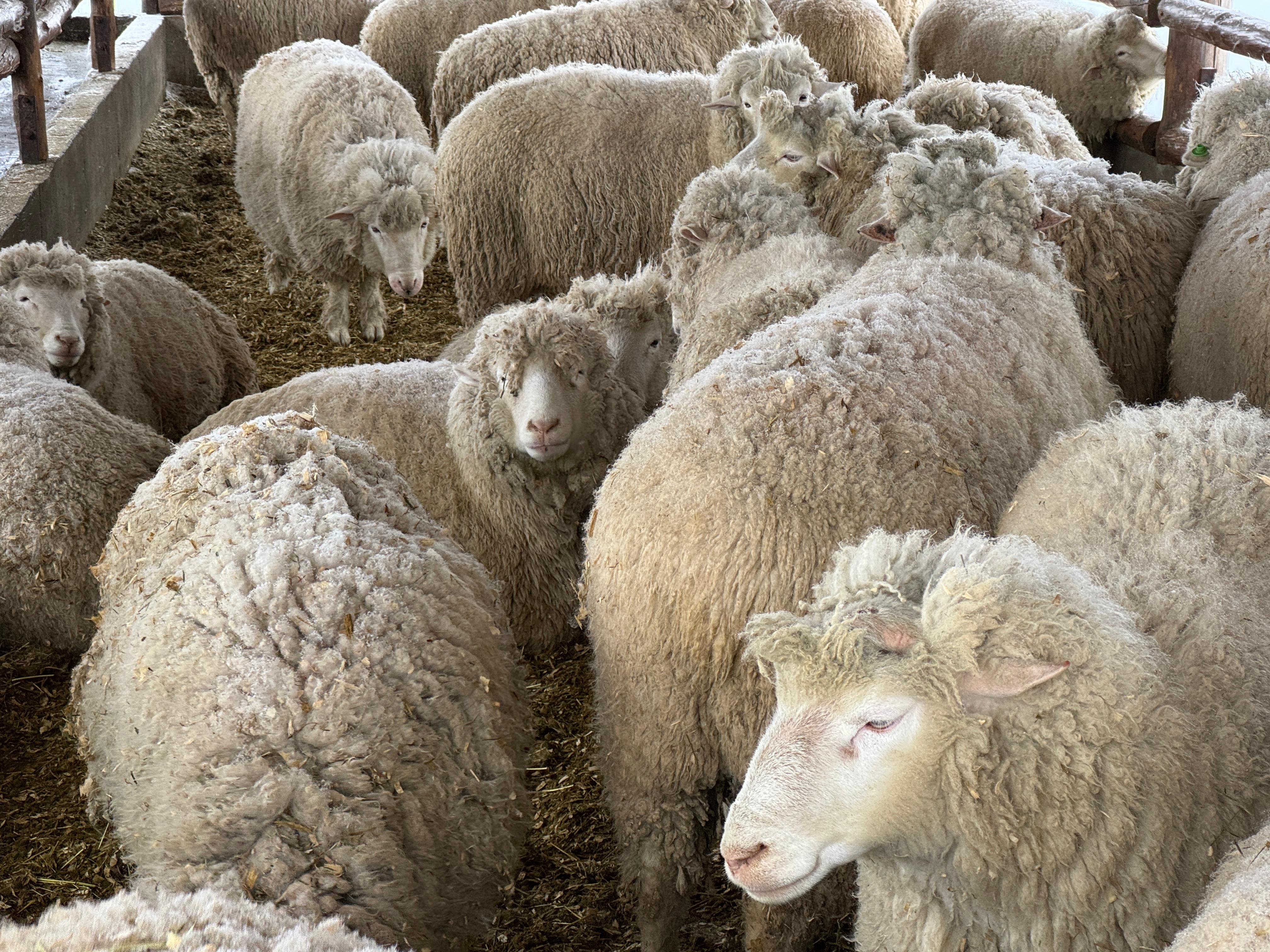 제가 건초 바구니를 들자마자 양들이 보내는 시선이 달라지네요.