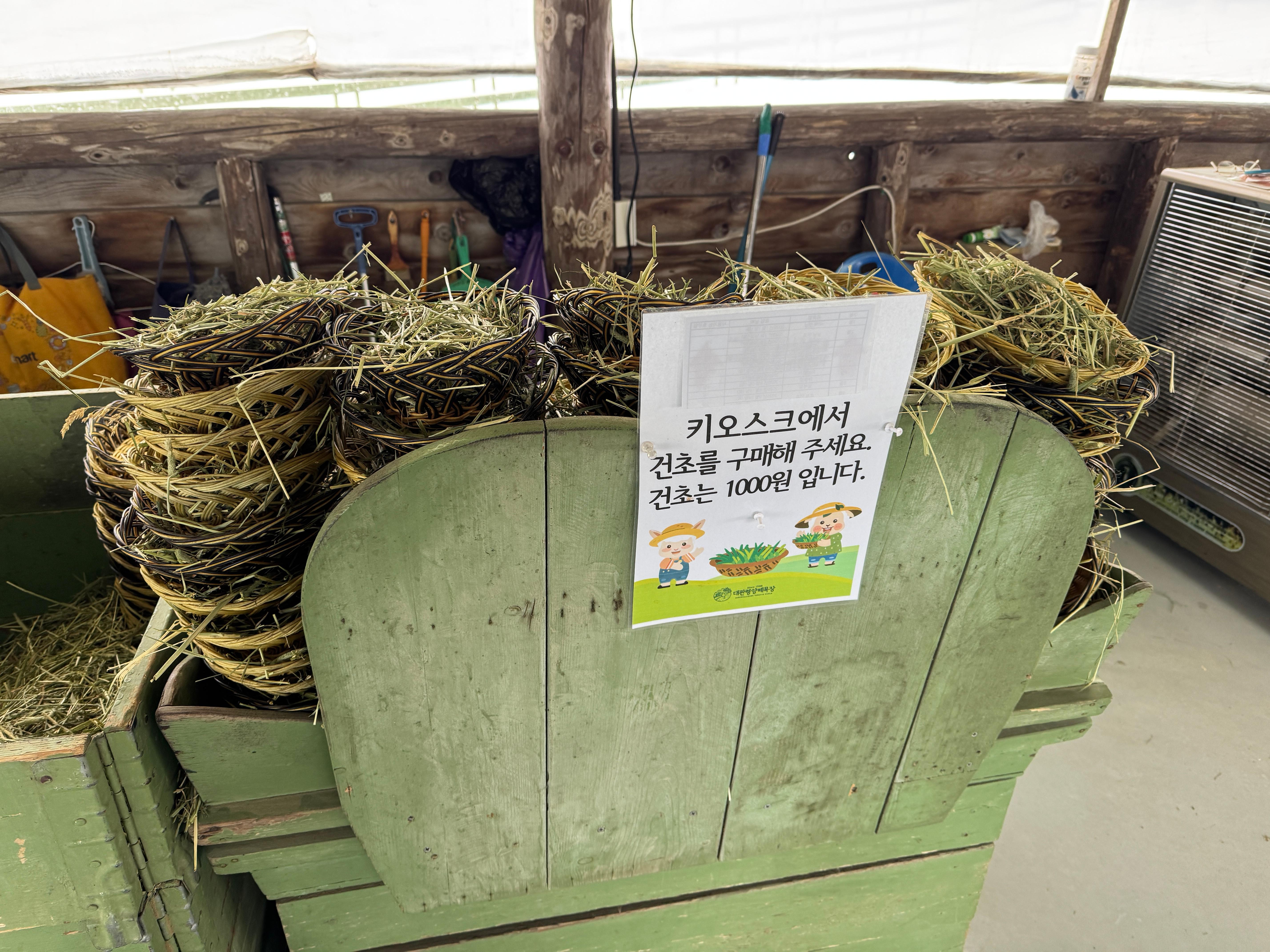매표소에서 받은 코인을 두고 건초 바구니를 하나 집은 뒤