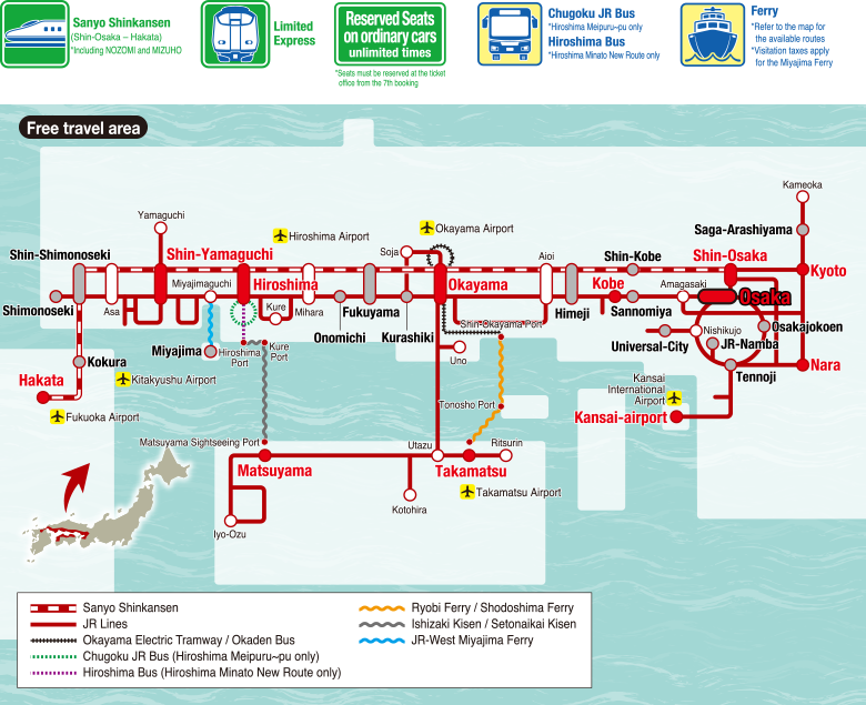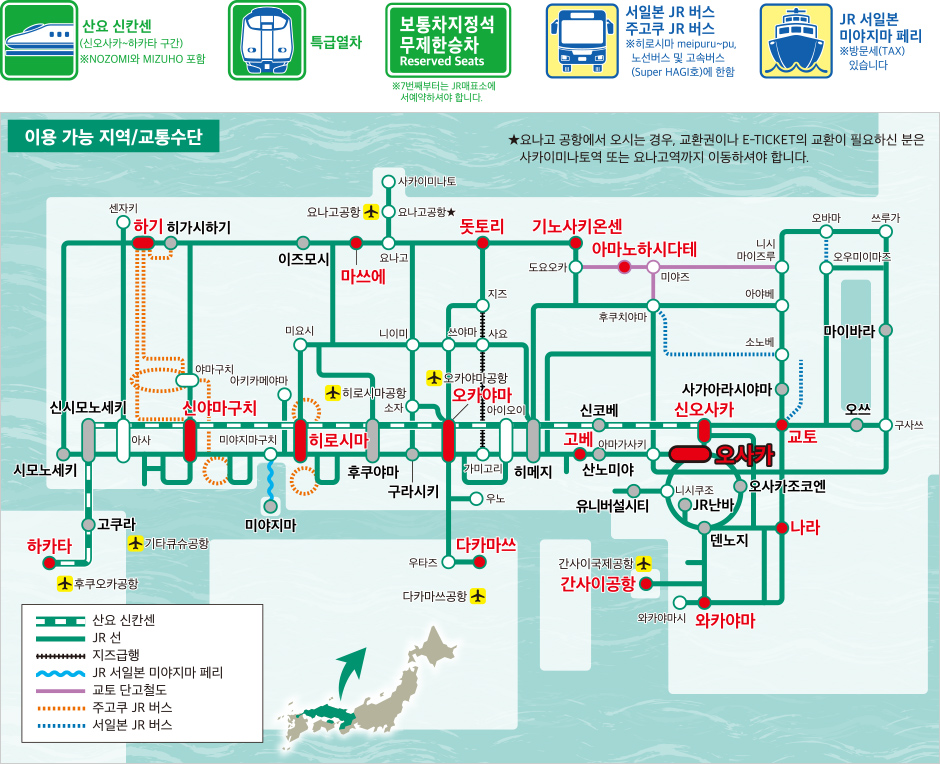 산요 산인 패스를 가지고 있으면 신오사카역에서 하카타역을 잇는 산요 신칸센 전 구간을 이용할 수 있고