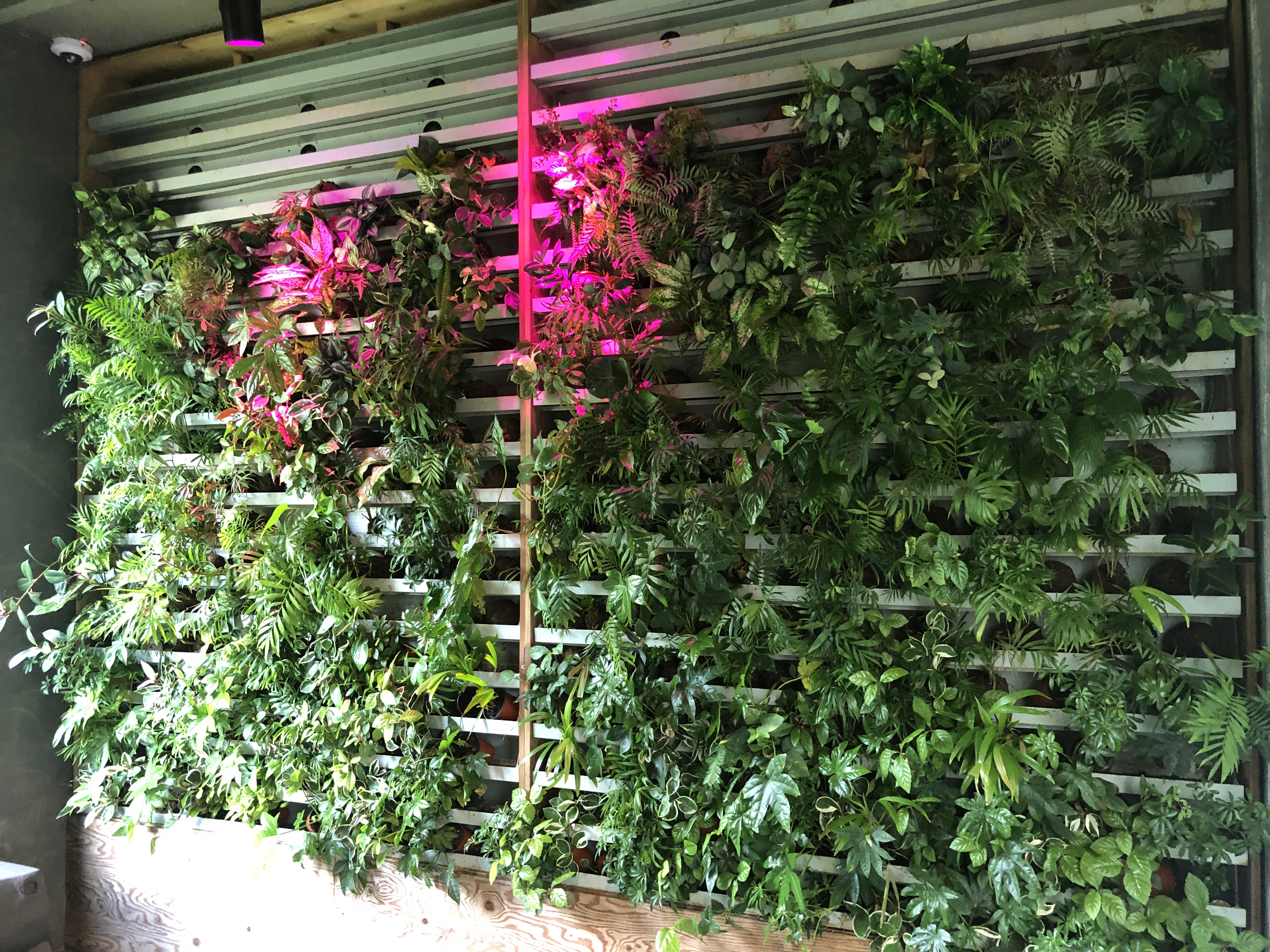 벽에 이런저런 화분이 걸린 즐기는 정원을 지나