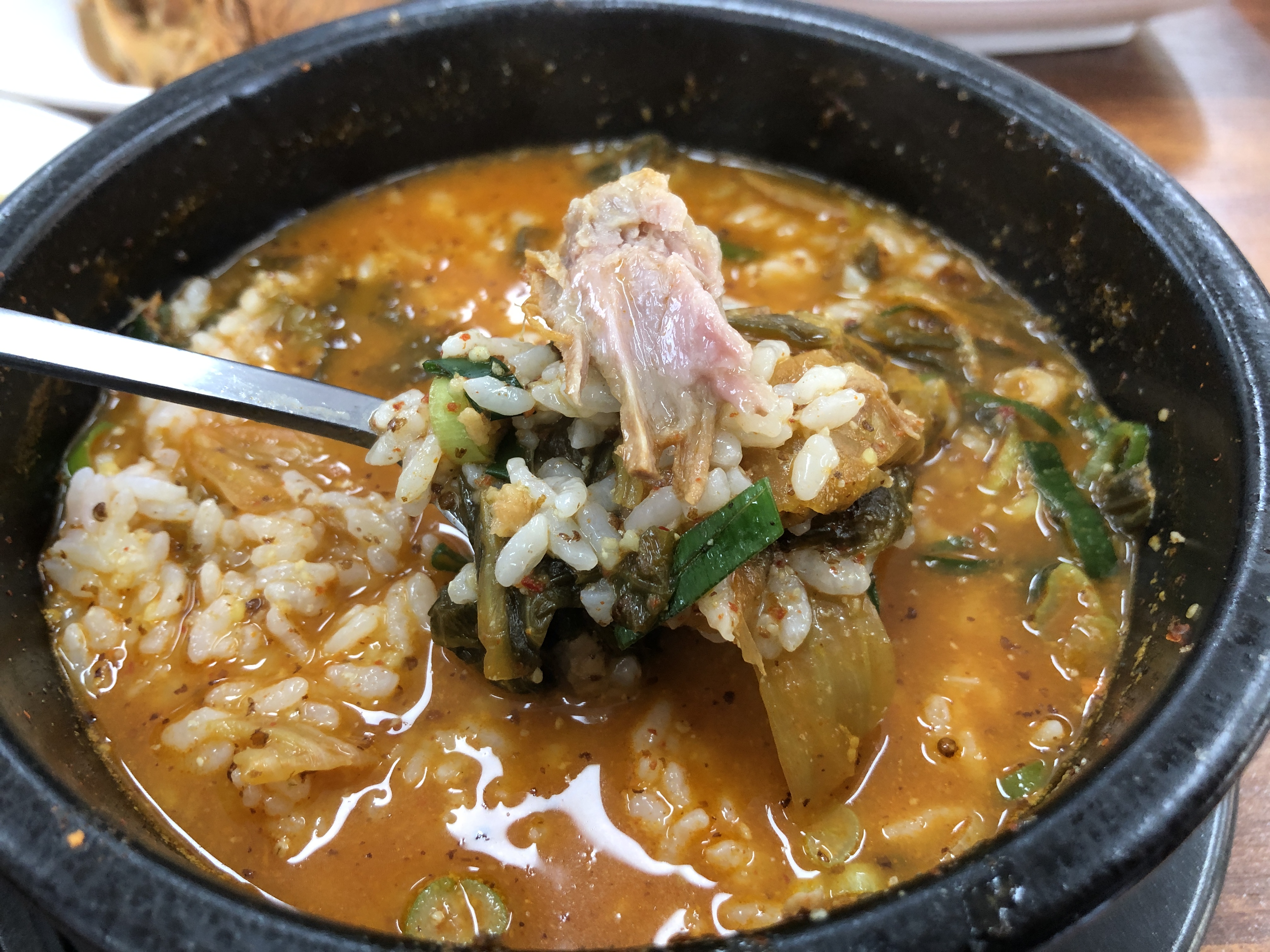 뚝배기에 밥을 말고 살코기를 숟가락 위에 얹어 맛있게 식사를 했습니다.