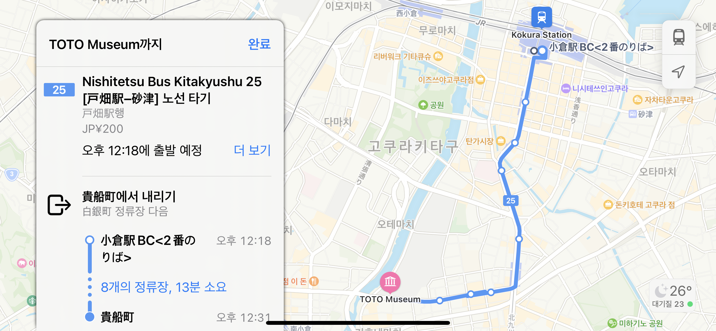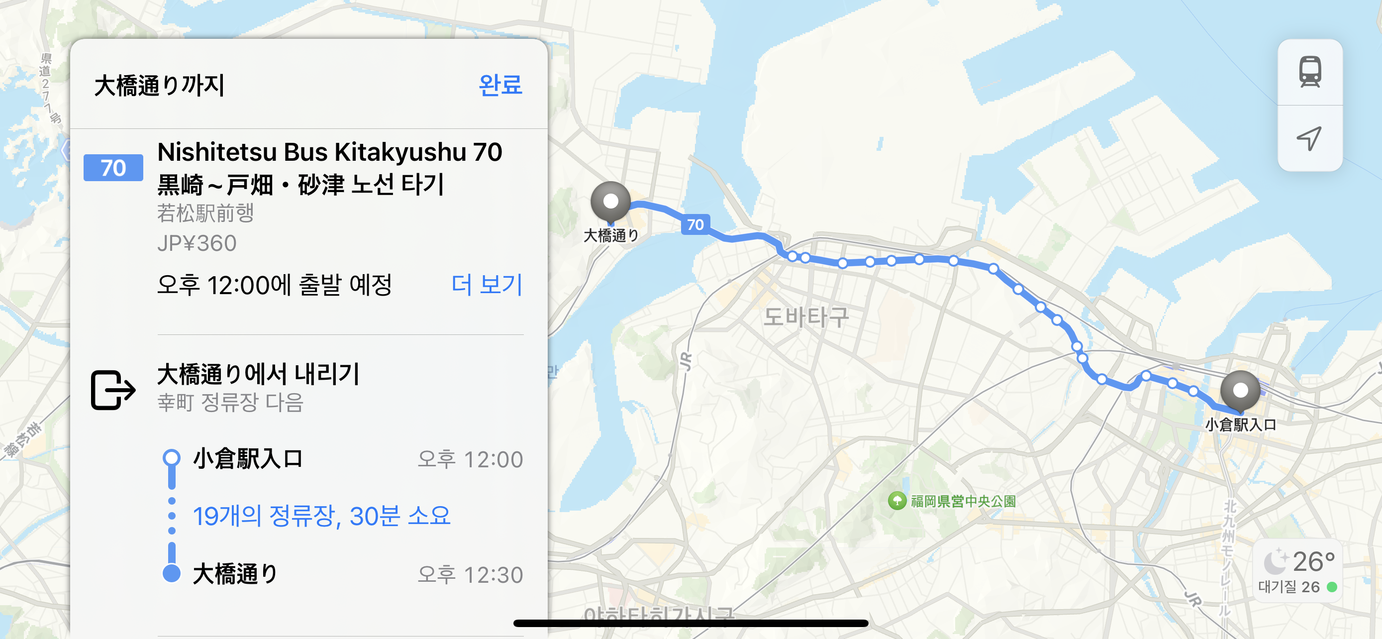 코쿠라역에서 조금 떨어진 코쿠라에키이리구치 정류장에서 70번 버스를 타고 오하시도리 정류장에서 내리면