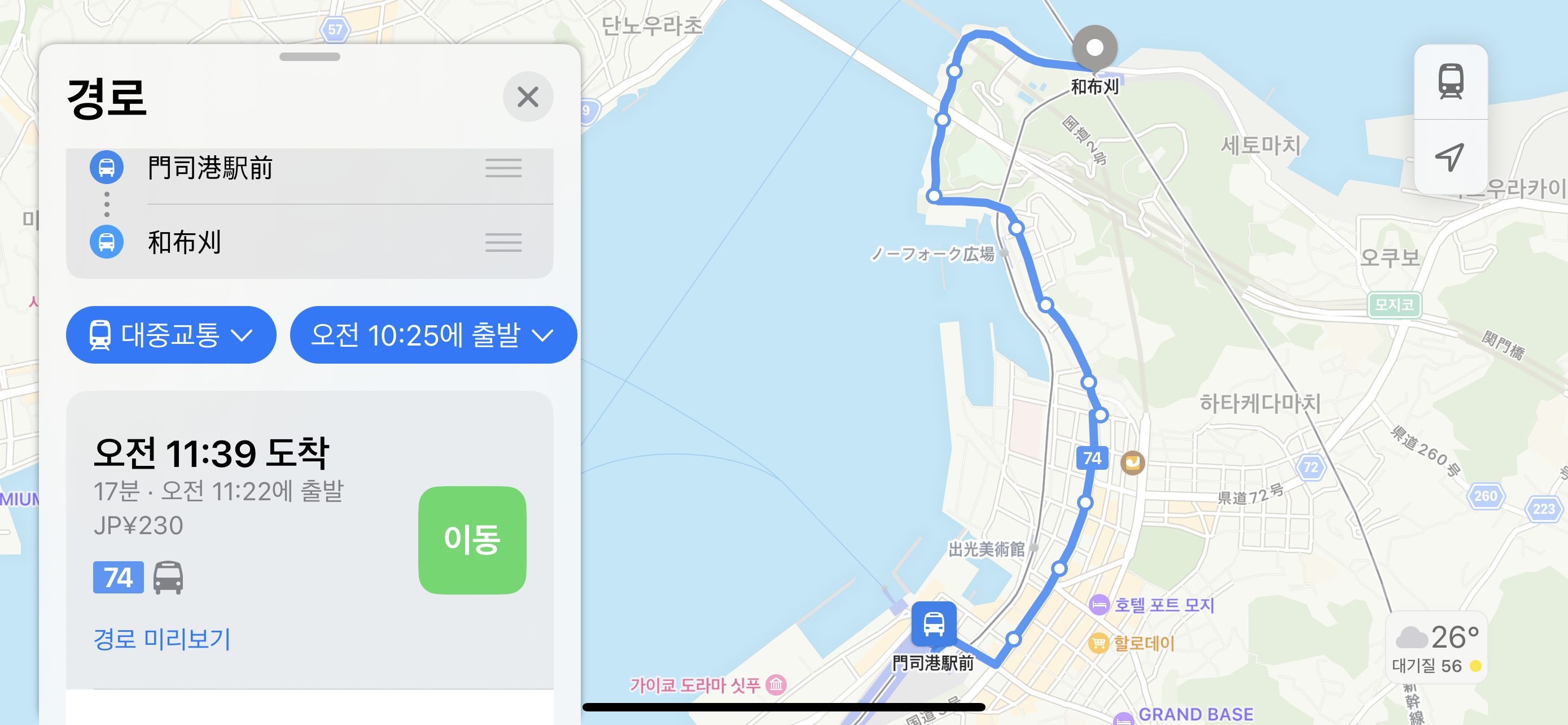 그나마 여행객에게 유용한 버스라면 코쿠라에서 출발해 모지코역을 거쳐 가는 74번 버스인데