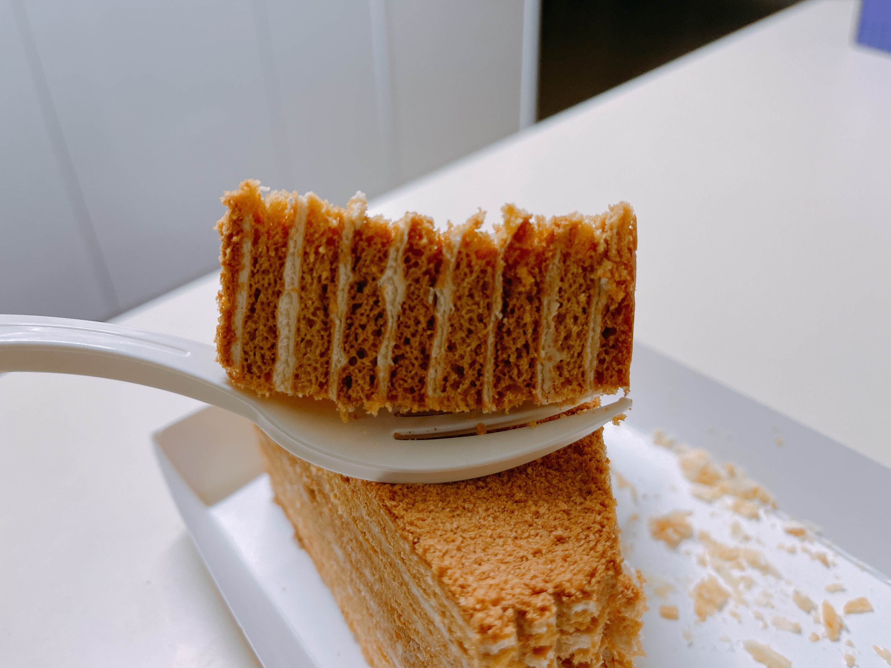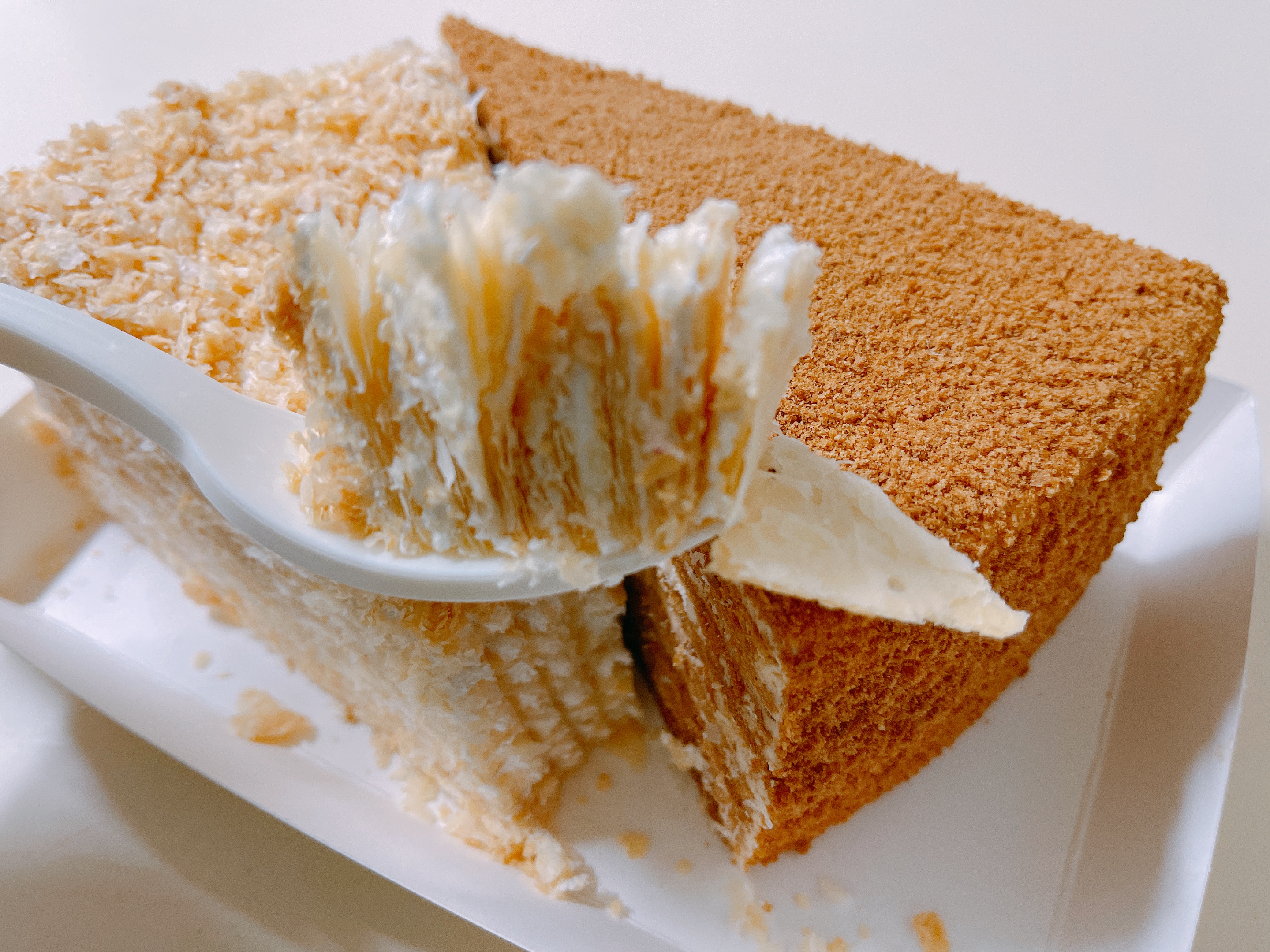 딱딱한 쿠키나 페이스트리가 크림과 만나 부드러워져서 포크로 푹 하고 쑤시면 조각이 떨어지긴 하지만