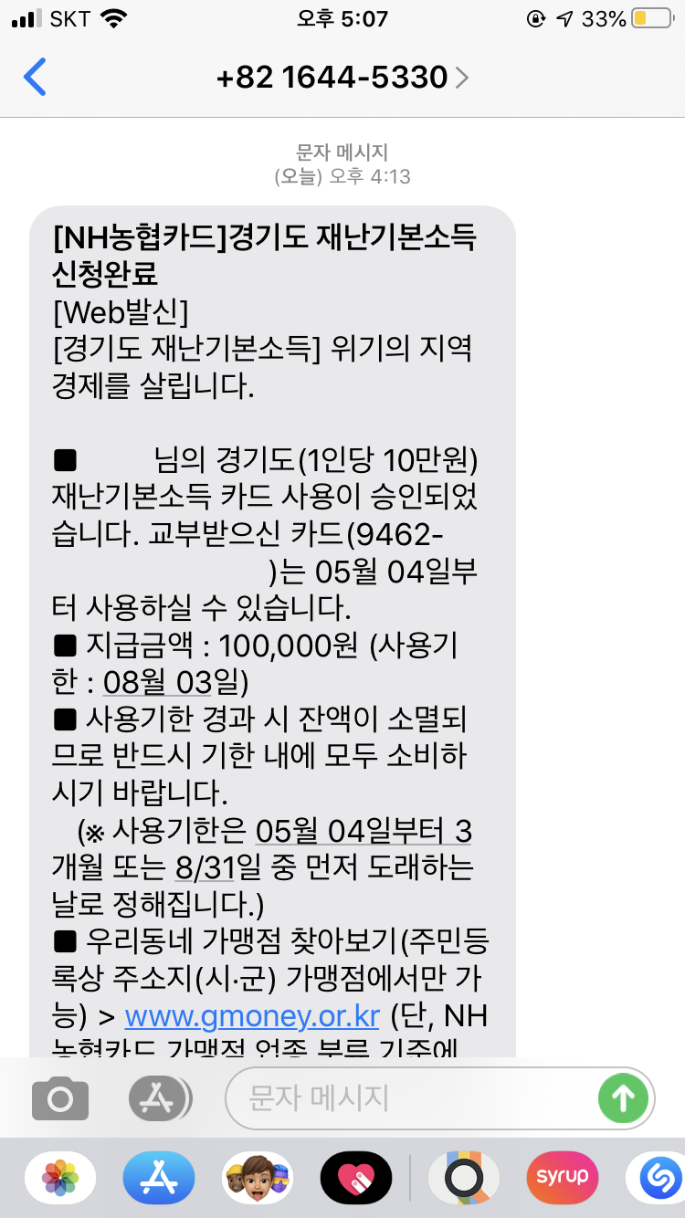 카드사로부터 재난기본소득 승인 문자를 받으면