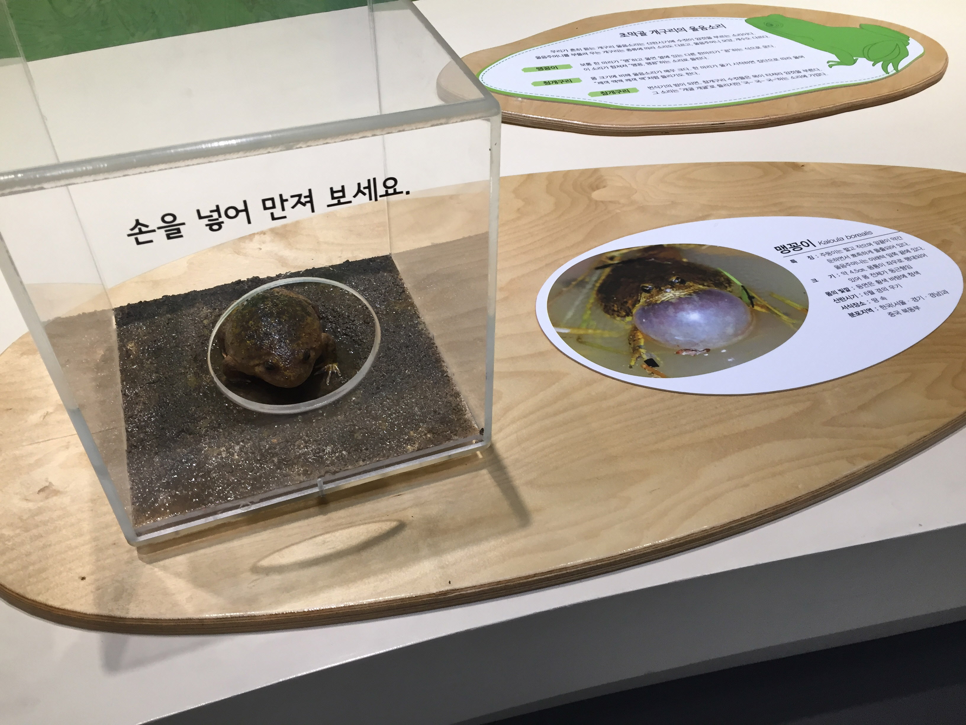 맹꽁이를 비롯해 여러 개구리를 재현해놓은 모형을 직접 만져볼 수 있는 코너가 있는데요.