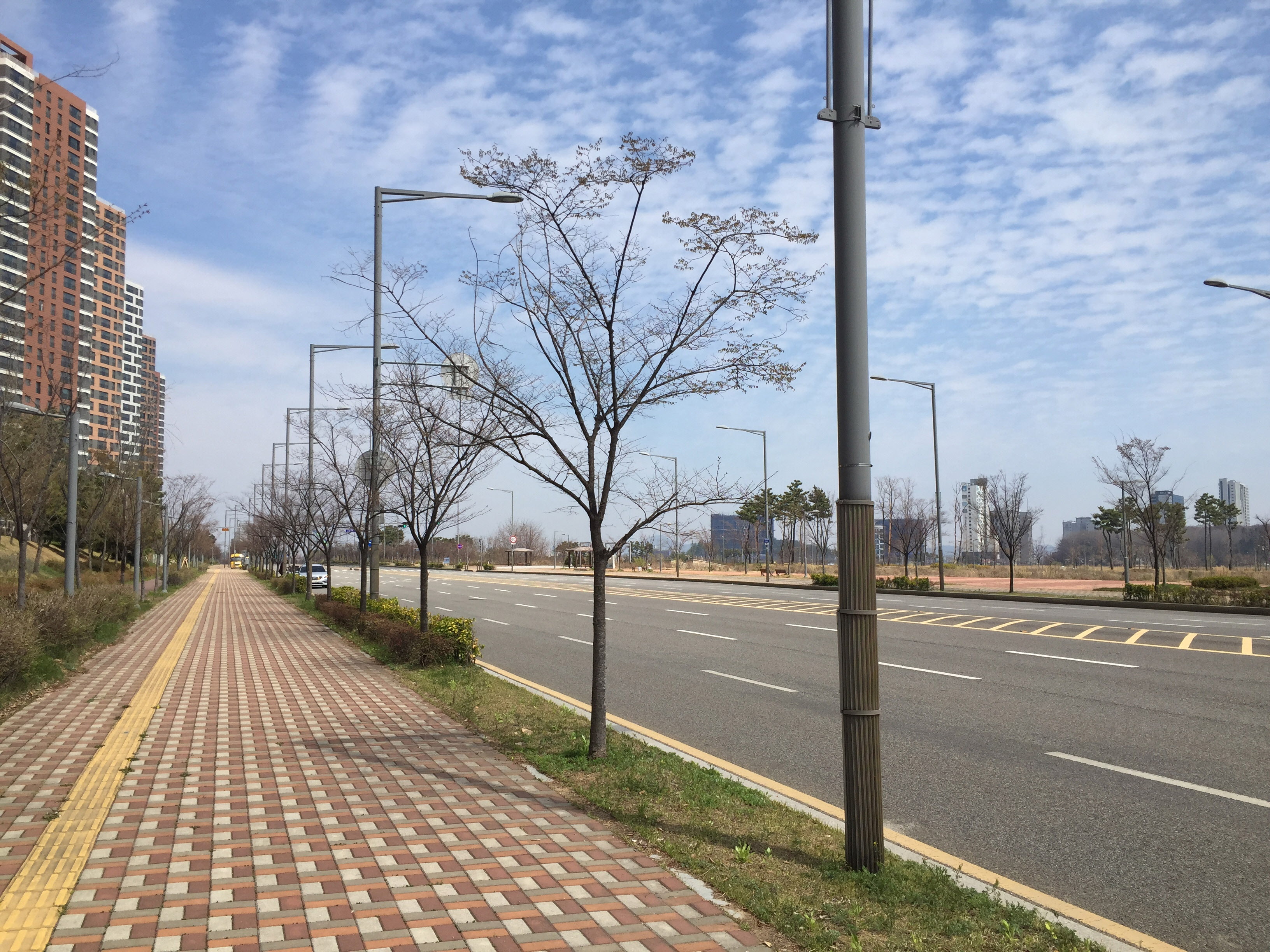 아파트로 빽빽한 곳을 지나 도시 외곽으로 걸어갑니다.