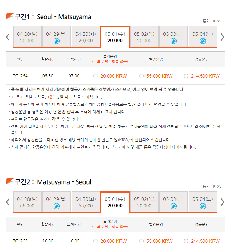 한국 출발편이 매우 빨라진 대신 당일치기가 가능한 일정이 됐습니다.