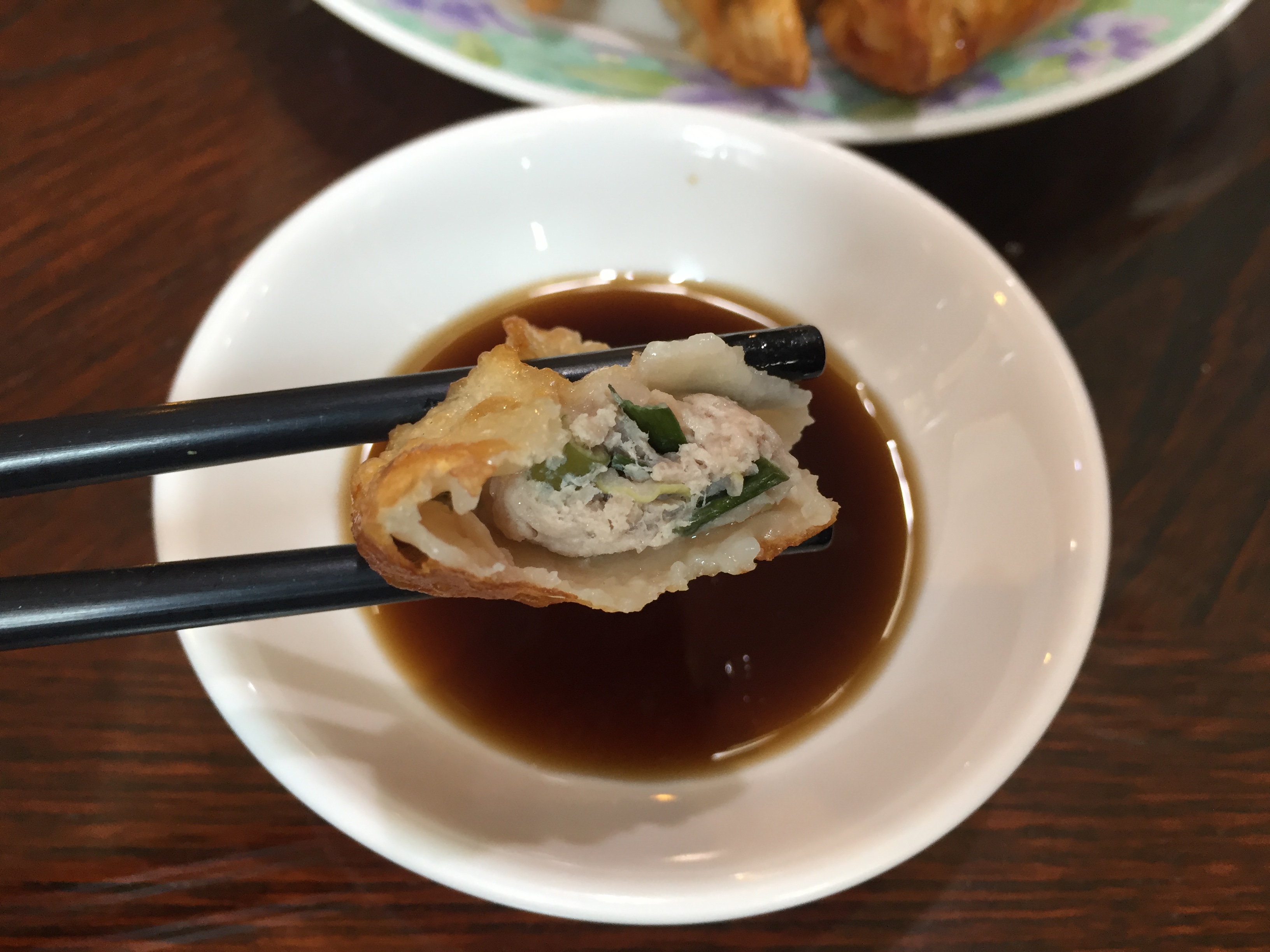 바삭하게 튀겨진 군만두가 접시에 가득 담겨 나왔습니다.