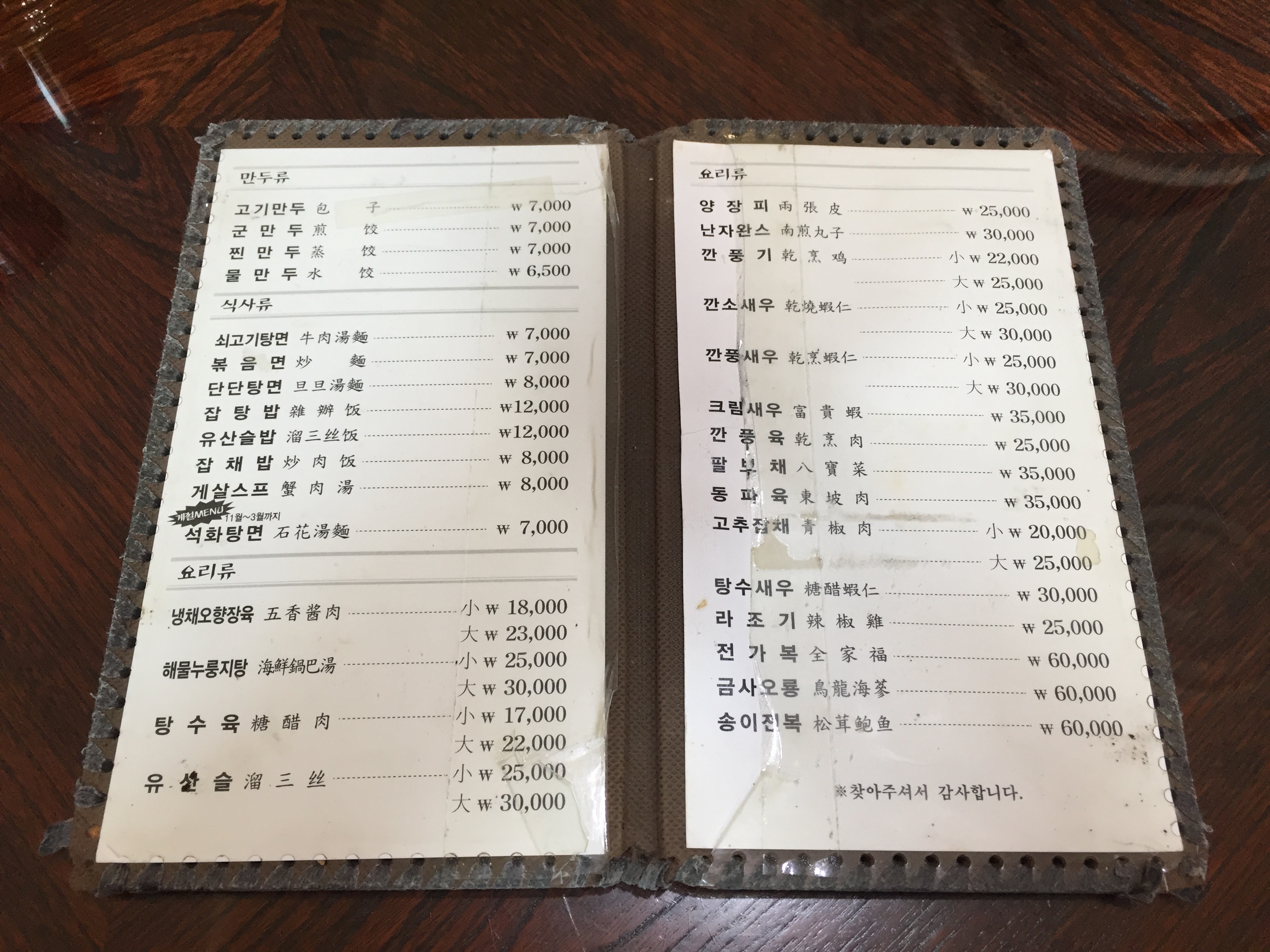 메뉴판을 보니 한국어와 중국어로 병기된 요리 이름과 함께