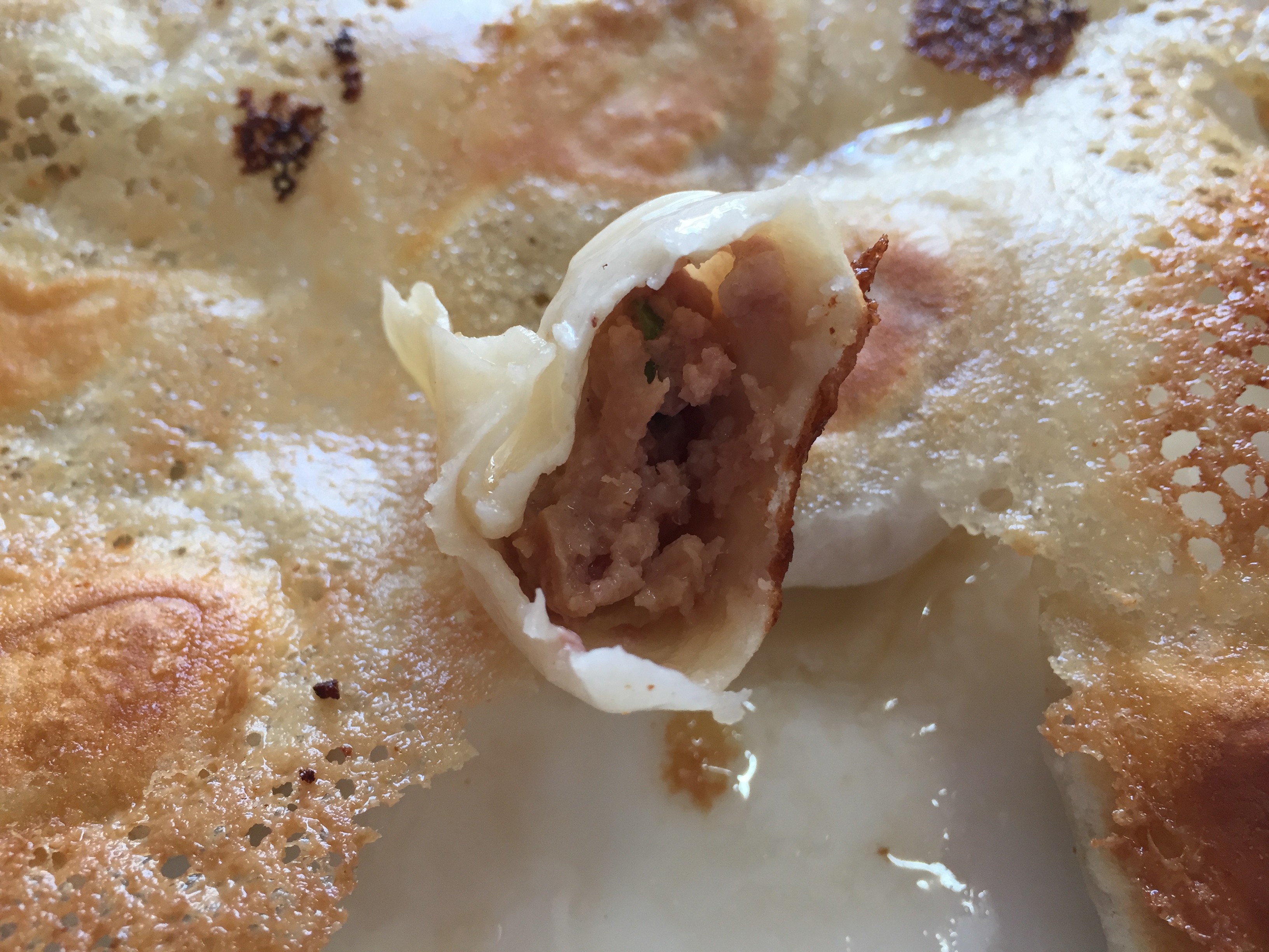 만두피를 살짝 찢어보면 육즙이 흘러나옵니다.