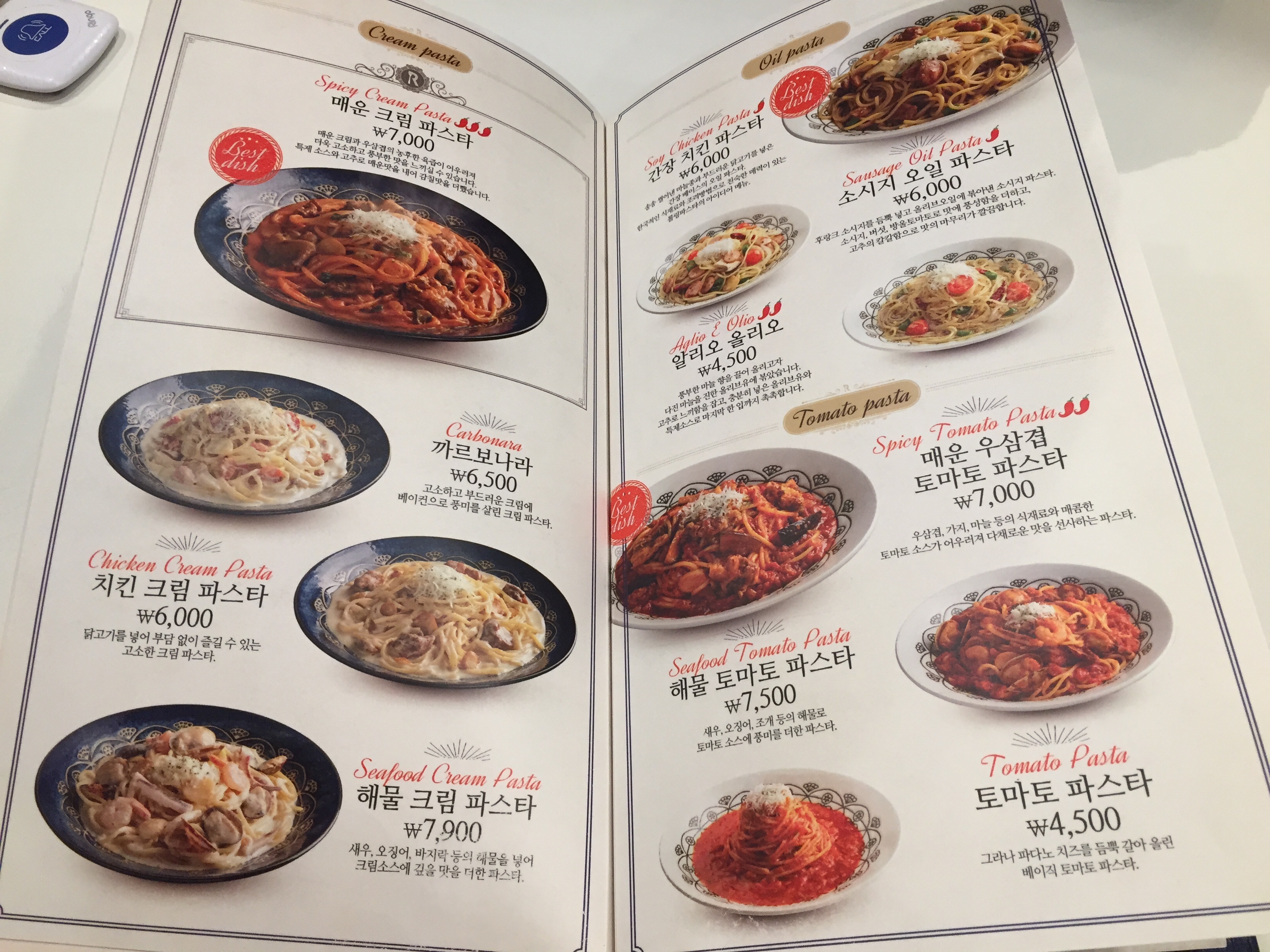 매운 것을 잘 못 먹는 친구가 주문한 메뉴는 메뉴판 맨 앞에 있는 크림 수프 파스타입니다.