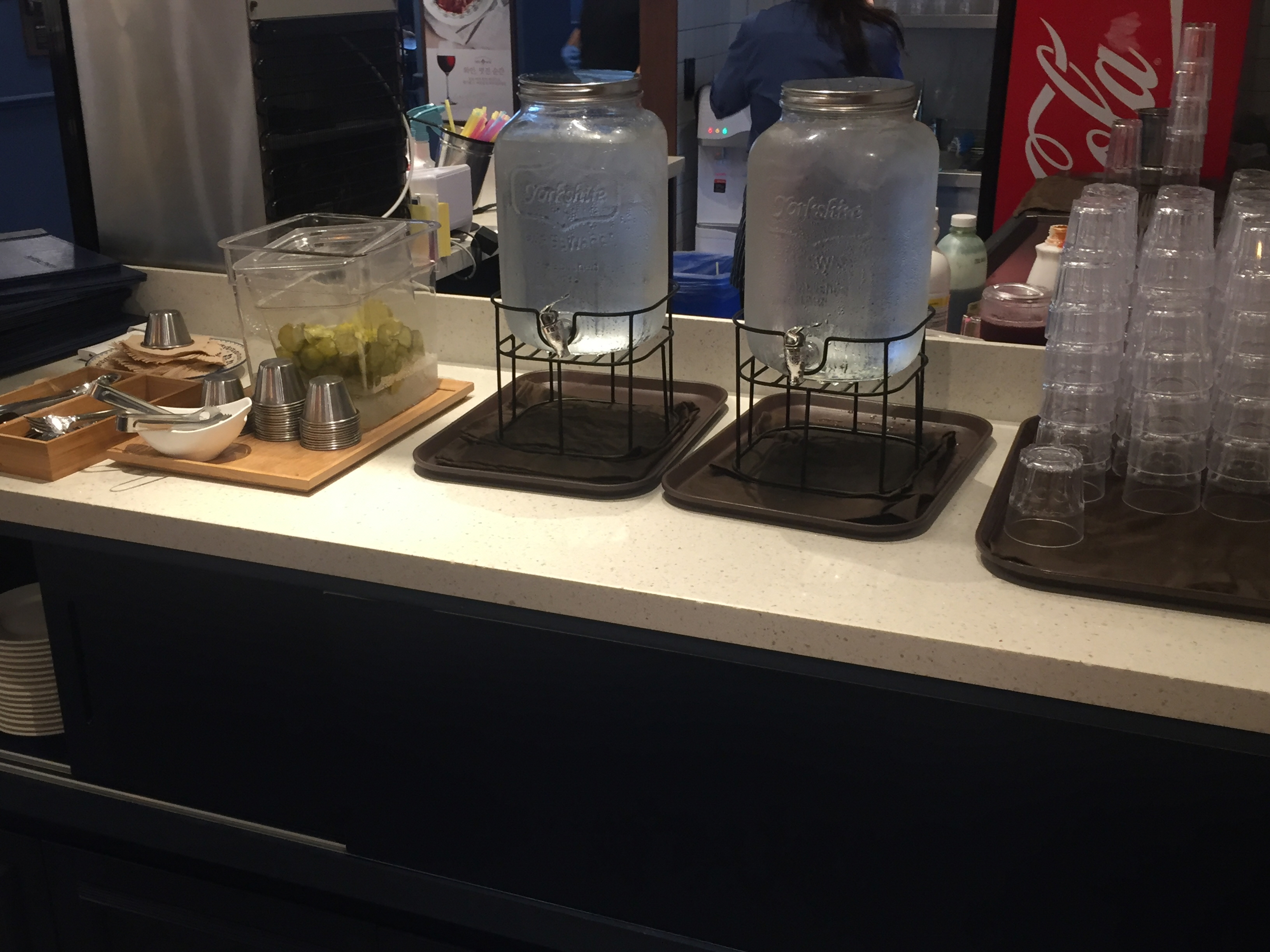 주문을 마치고 셀프바에서 물과 식기, 피클을 챙겨 자리로 돌아왔습니다.