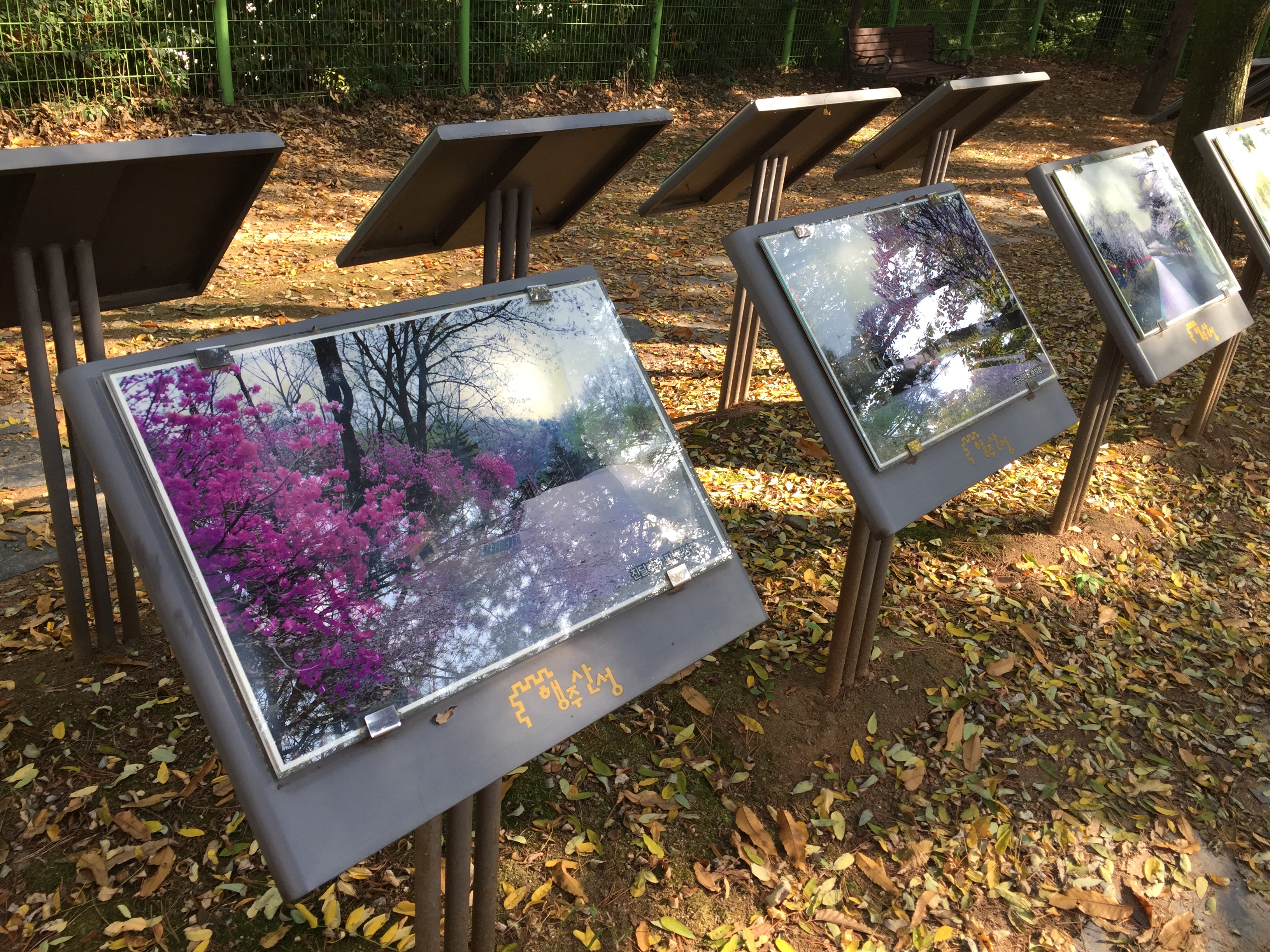 쉼터에 있는 사진 전시대에서