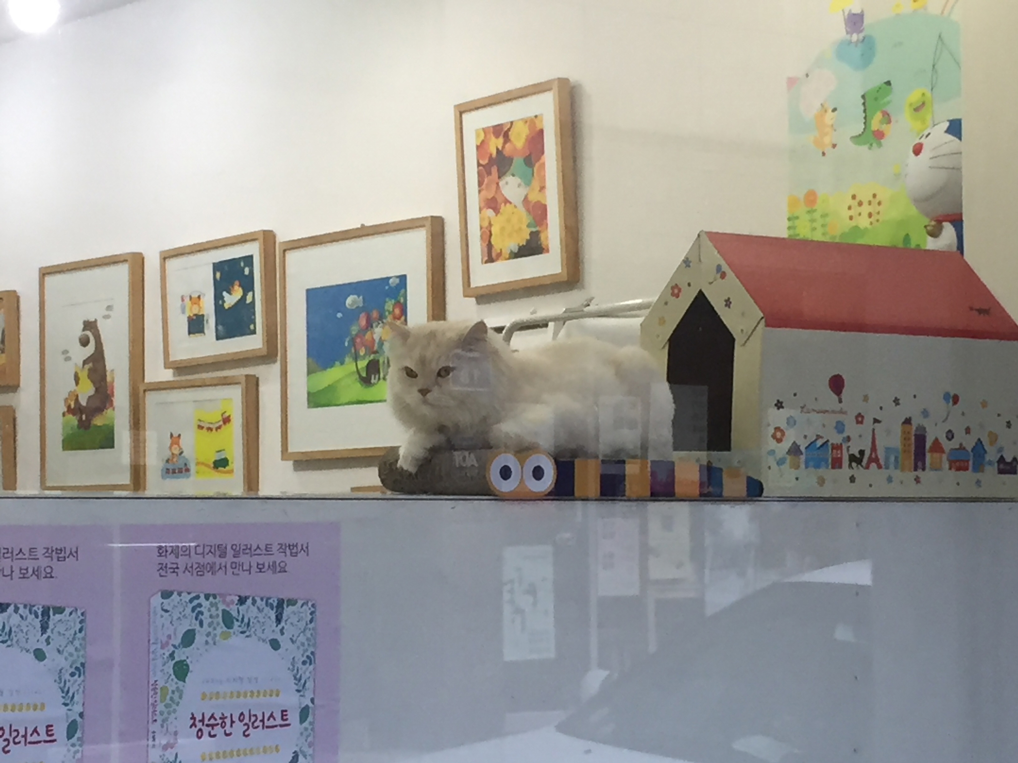 어느 가게 안 뾰로통한 얼굴로 앉아 있는 고양이를 보면서