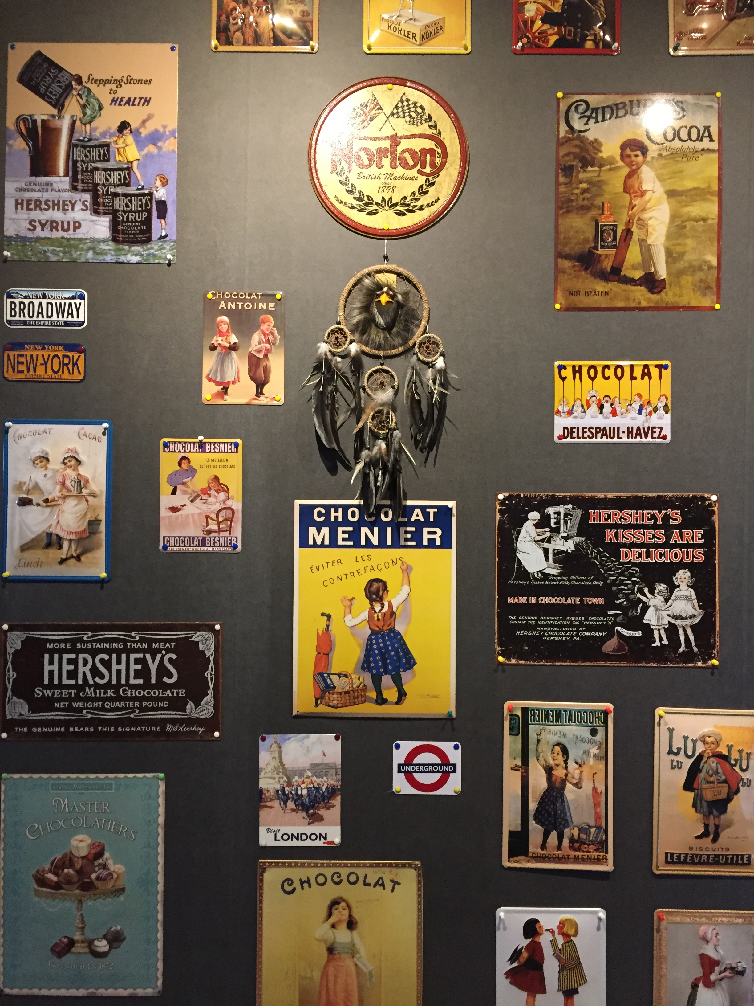 드림캐처 아래에 쇼콜라 므니에(Chocolat Menier)라는 초콜릿 포스터가 있는데