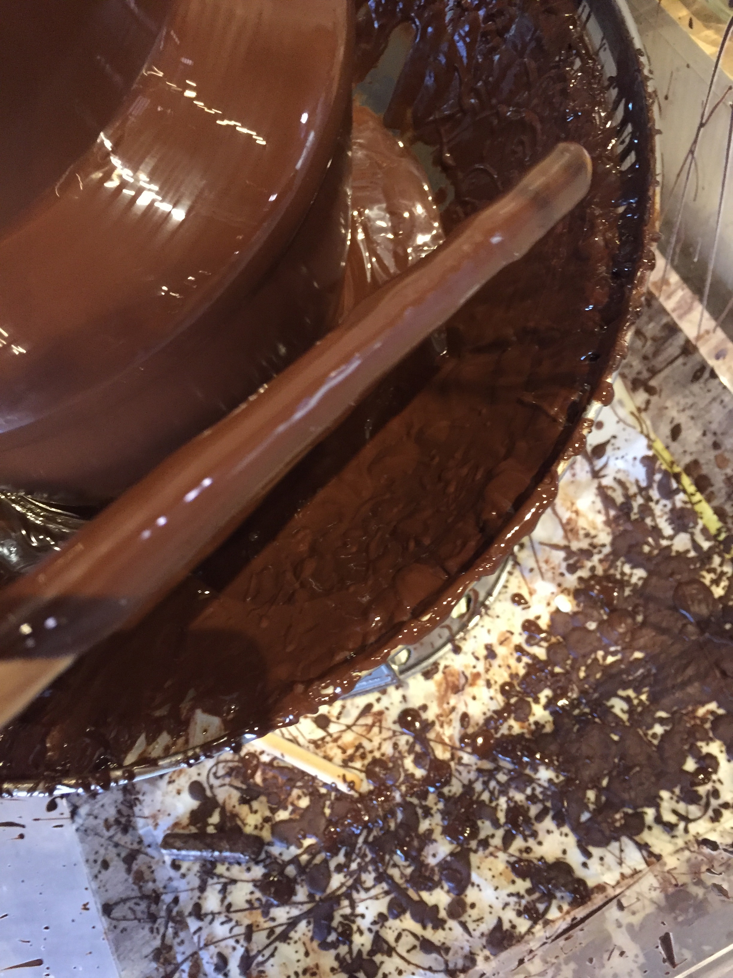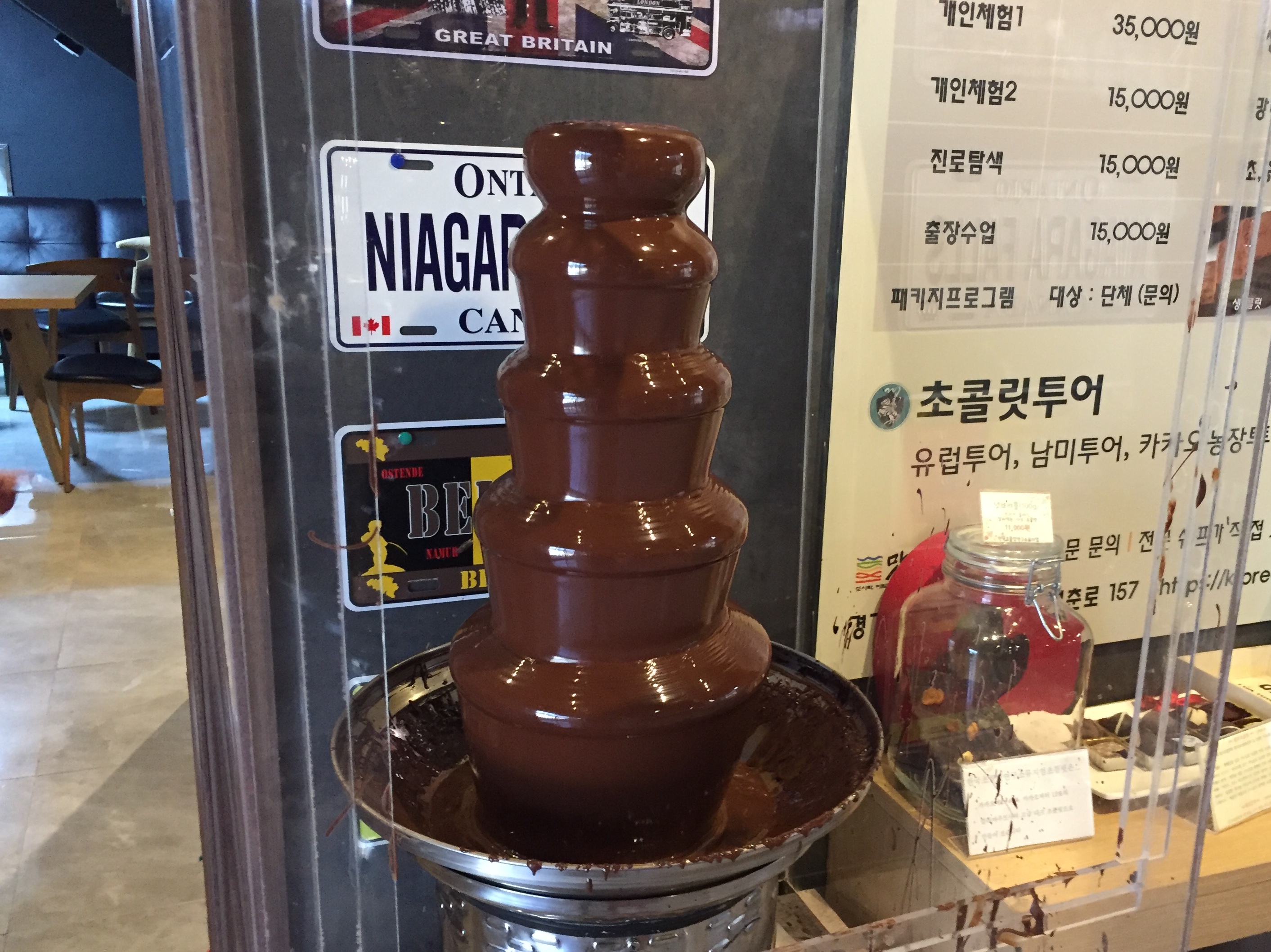 카운터에서 과자를 받은 뒤 초콜릿 분수에 풍덩.